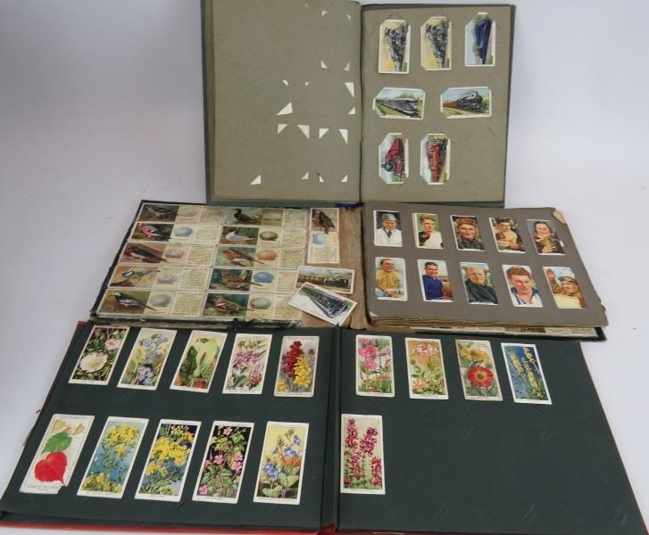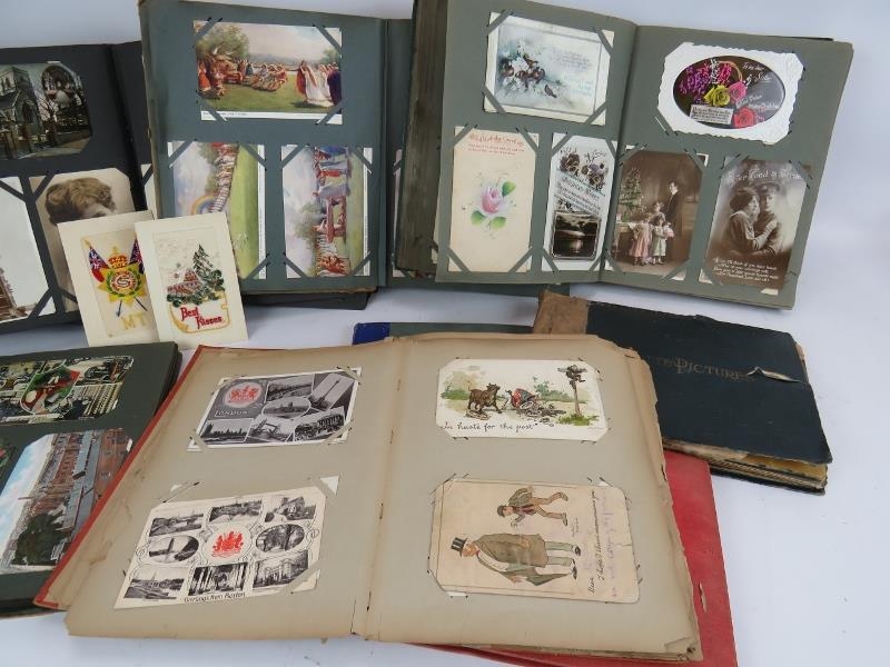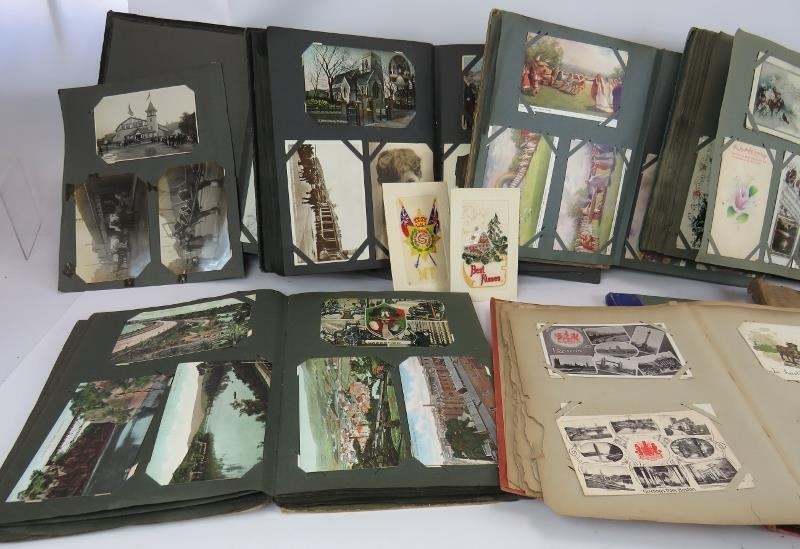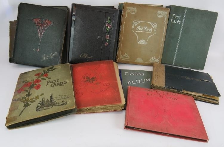 Six early 20th century postcard albums full with contents including WWI subjects and three cigarette card albums. Inspection recommended. (9).