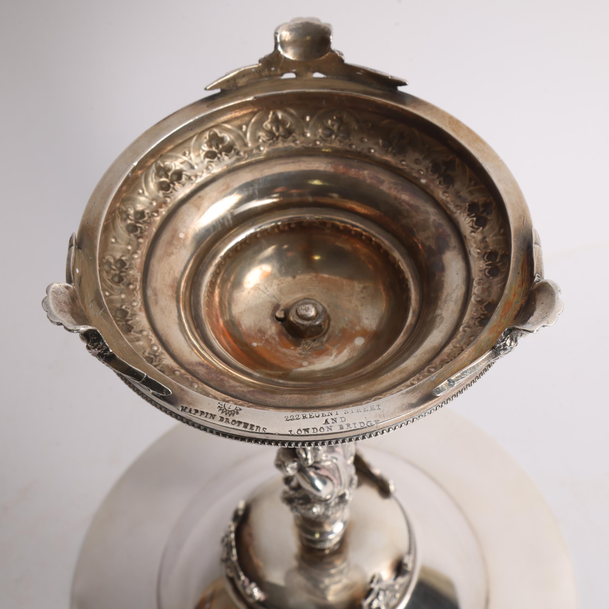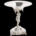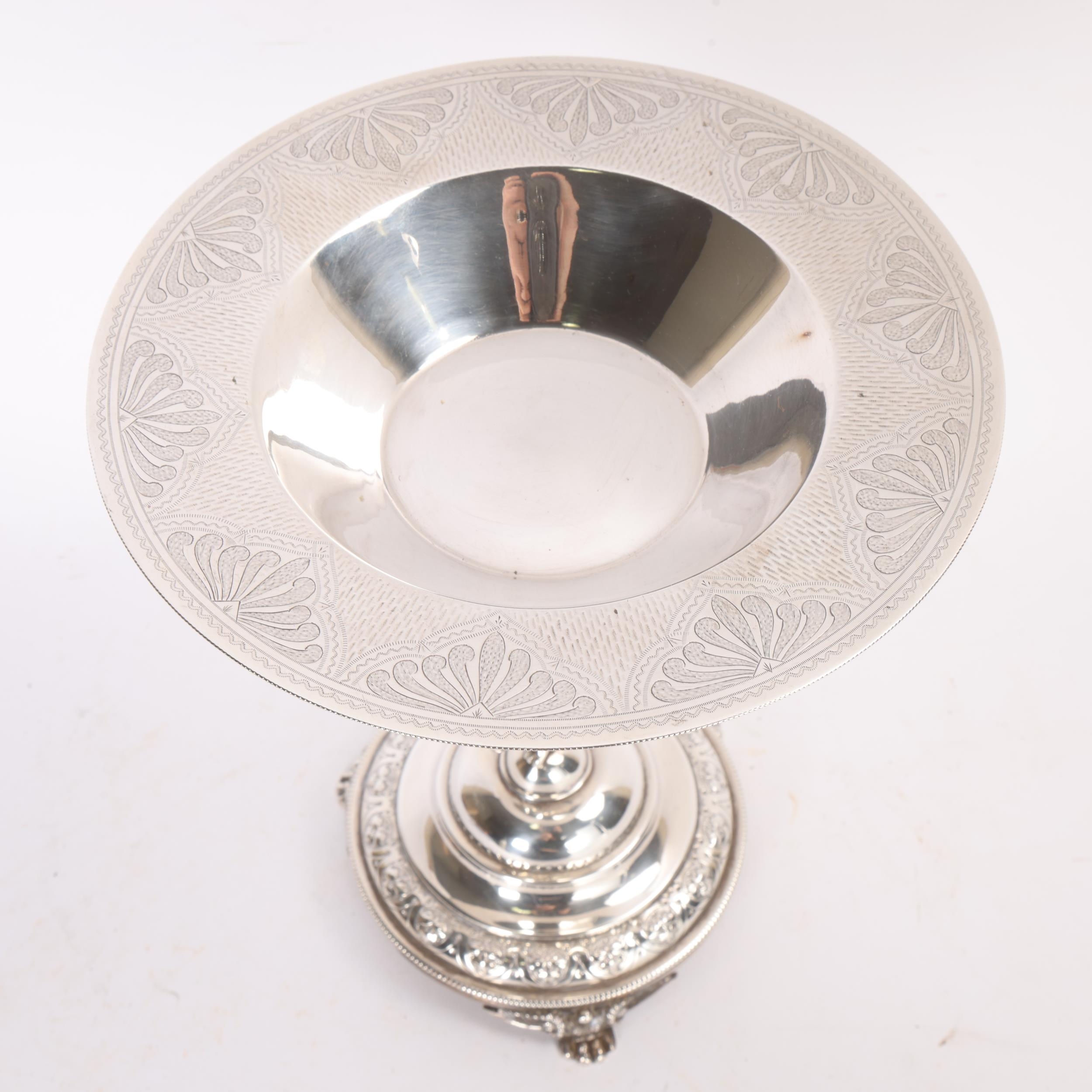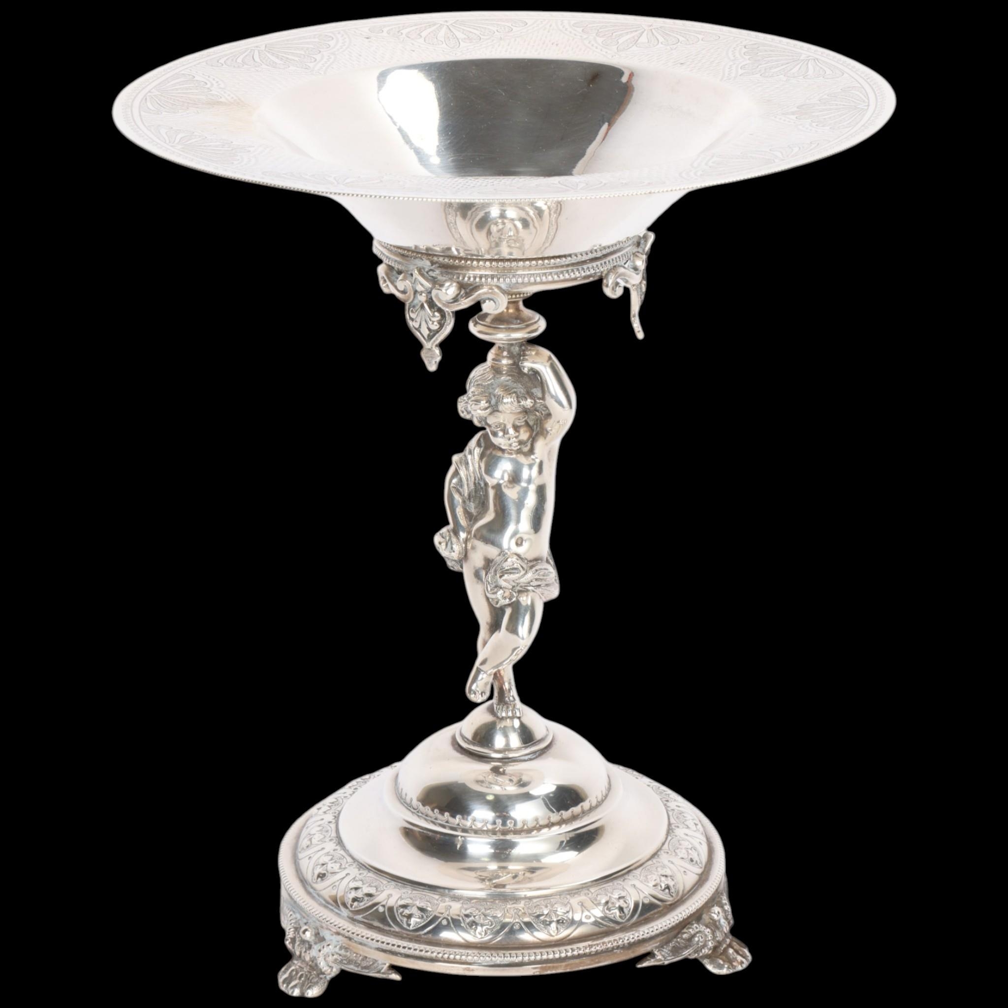 A Victorian electroplate tazza, with cherub support, diamond registration lozenge, height 24.5cm, diameter 21cm