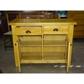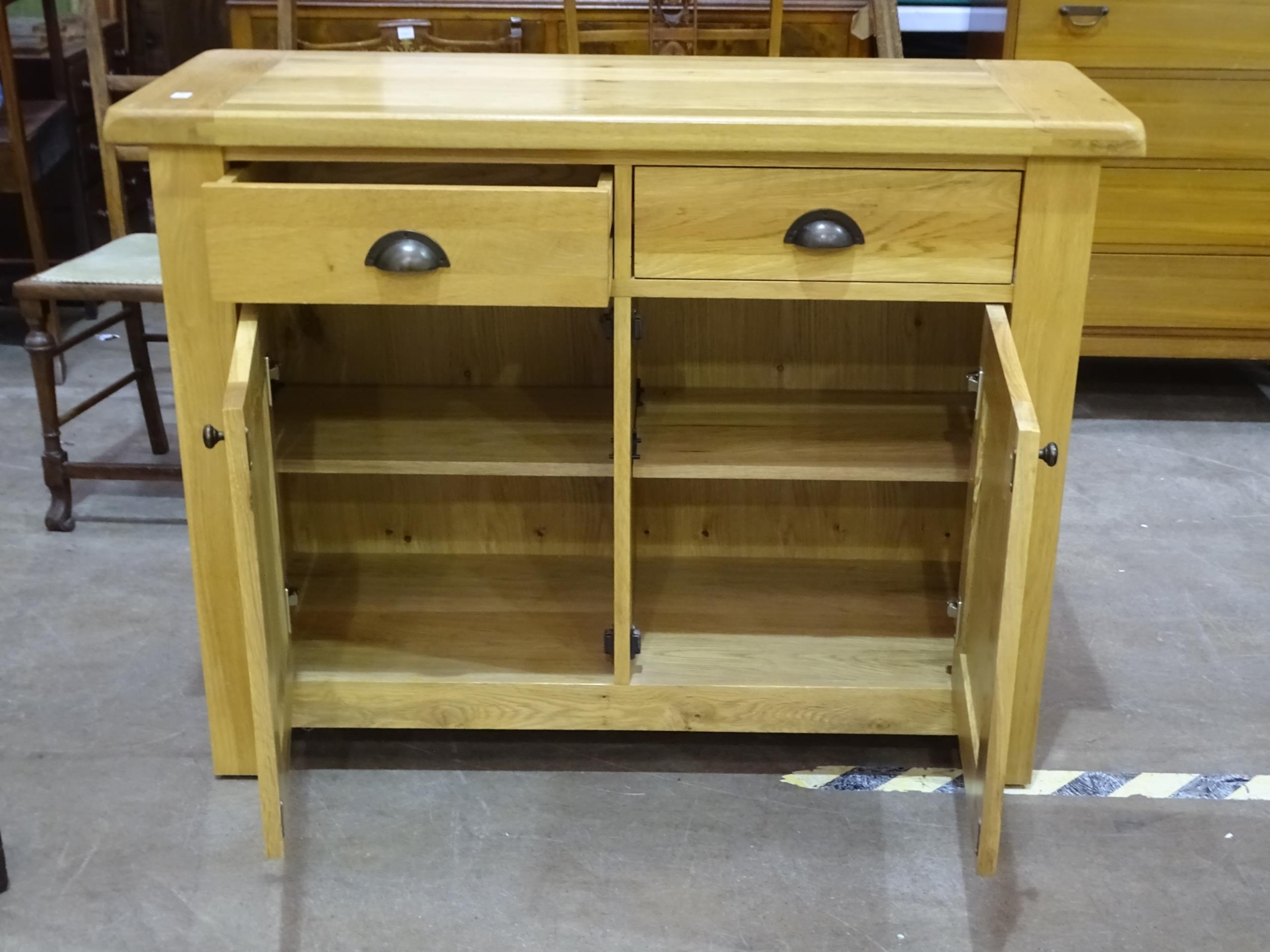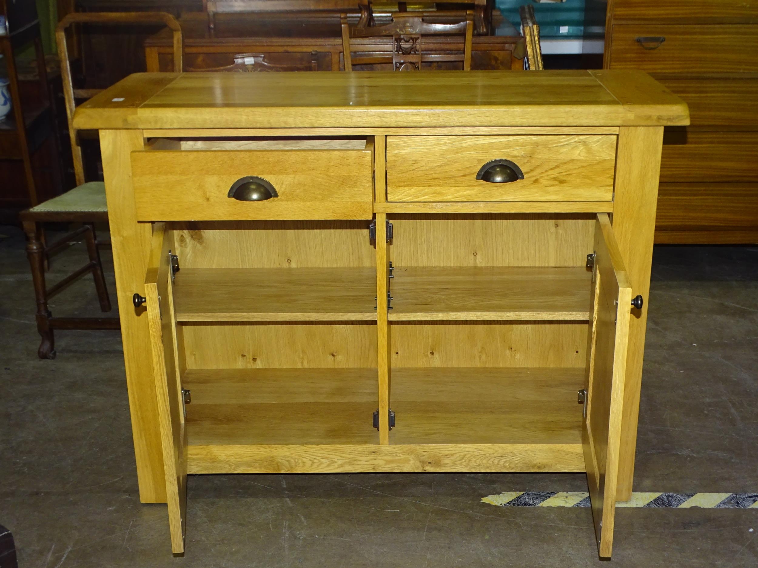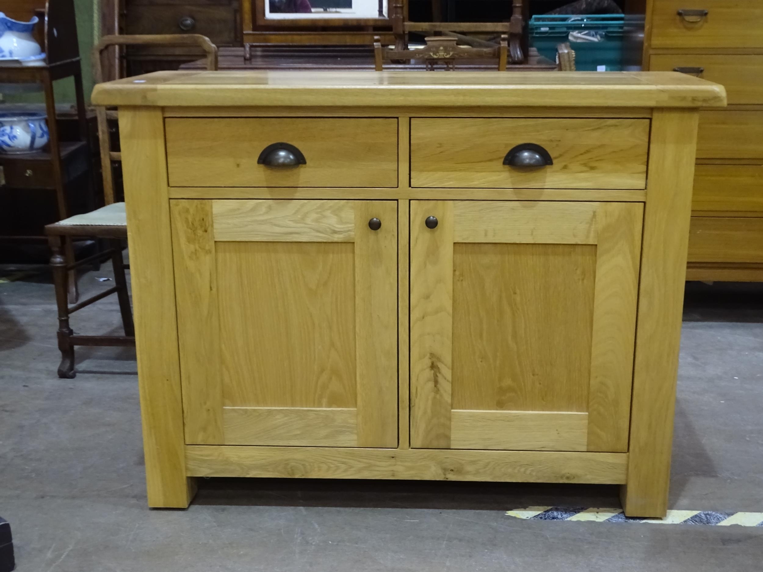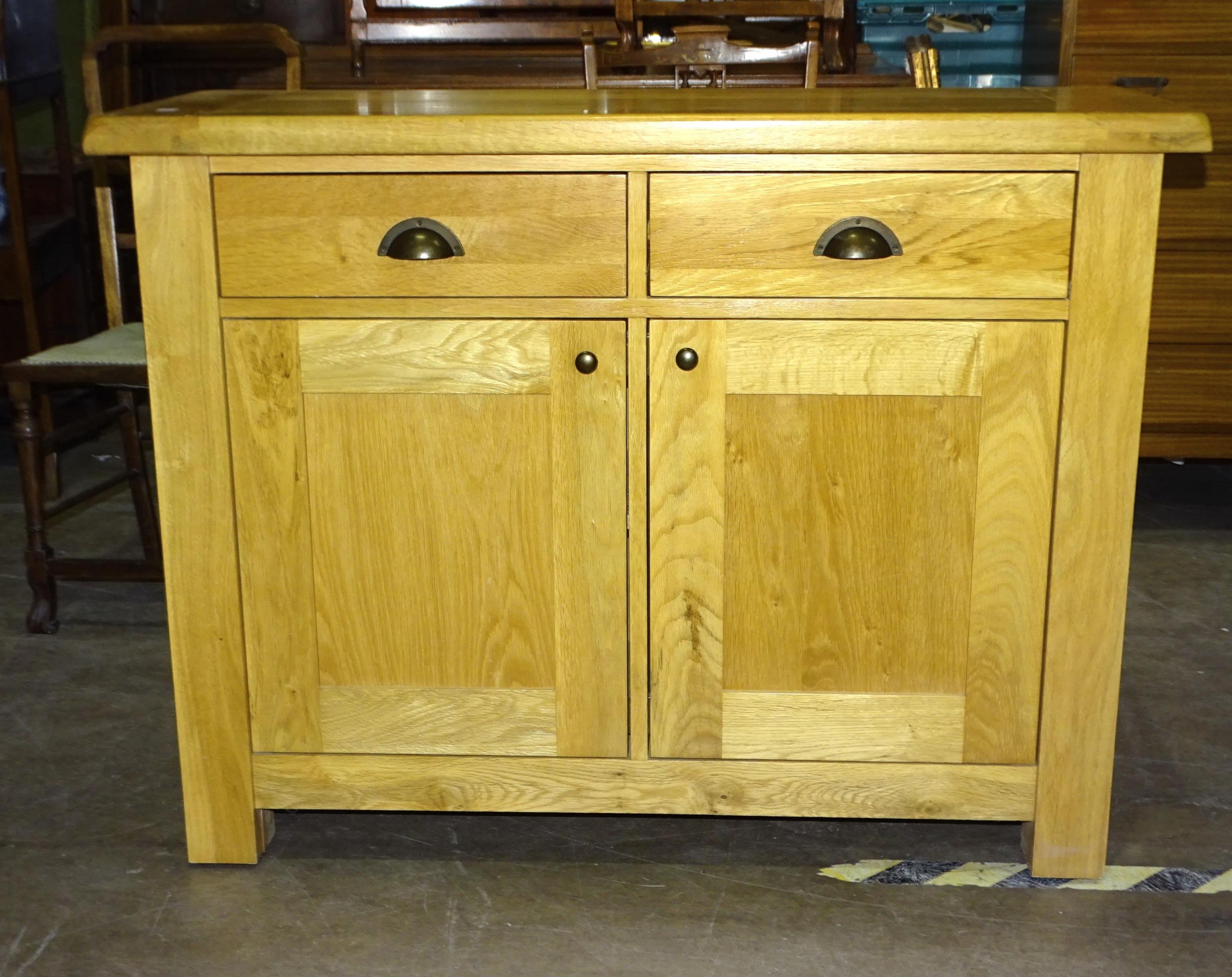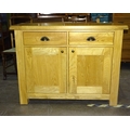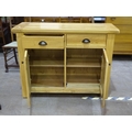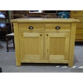 A modern light wood side cupboard with two drawers and two cupboard doors, 45 x 112cm, 84cm high.