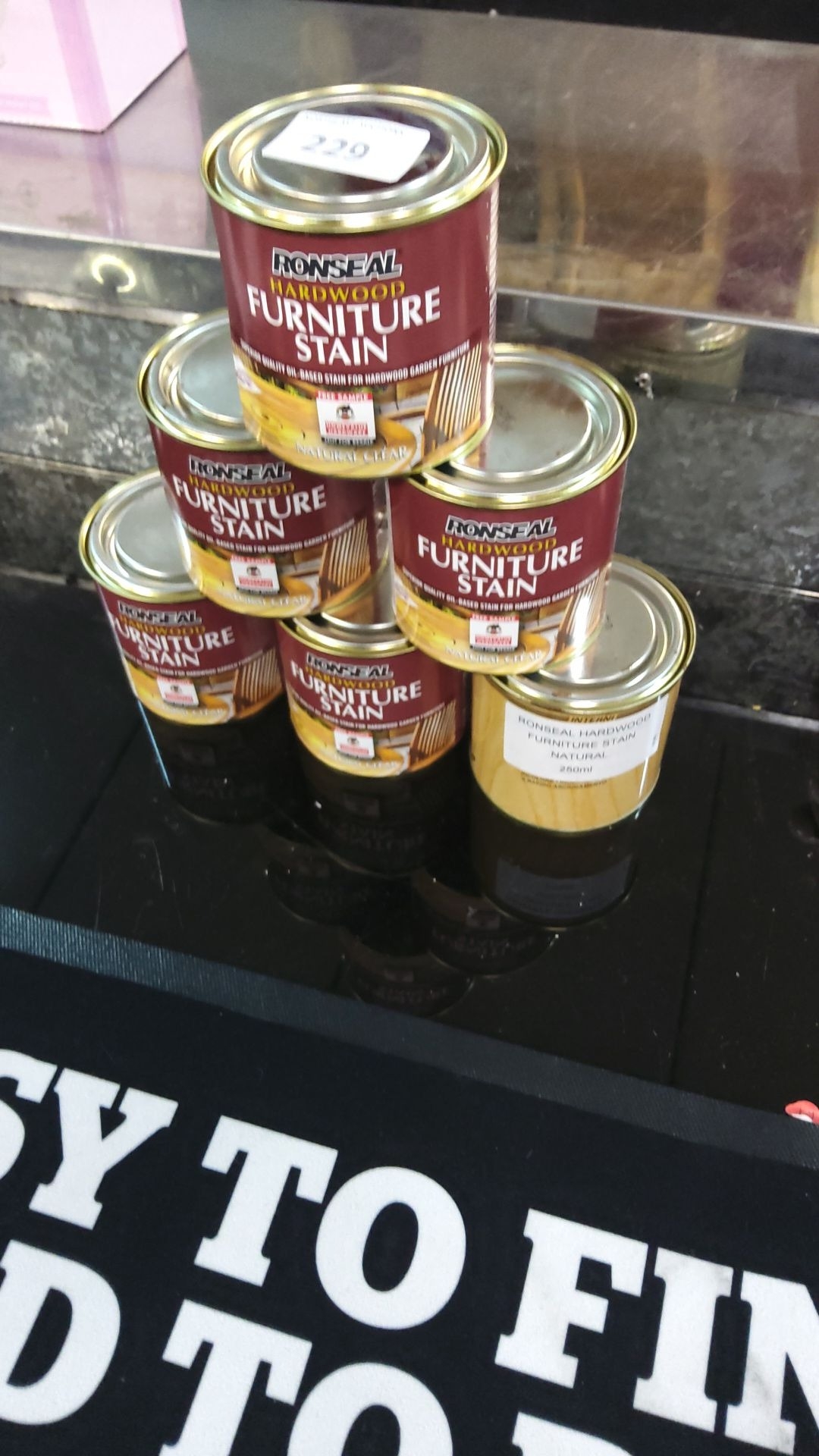 Set of six Ronseal Hardwood Furniture Stain cans, 250ml each. Natural clear finish.