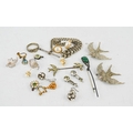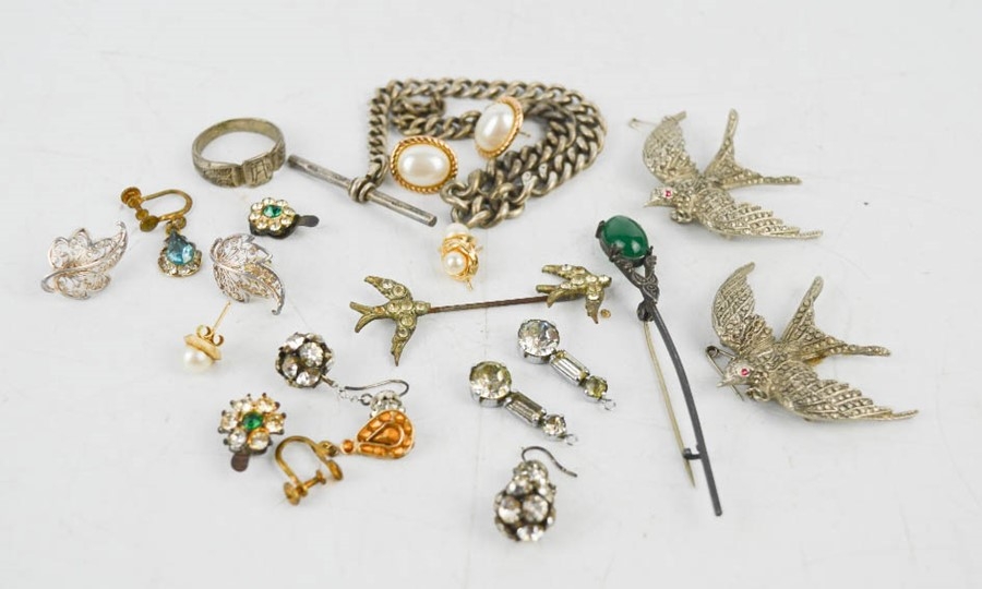 A quantity of costume and silver jewellery including a brooch in the form of a bird, earrings, Albert chain and other items.
