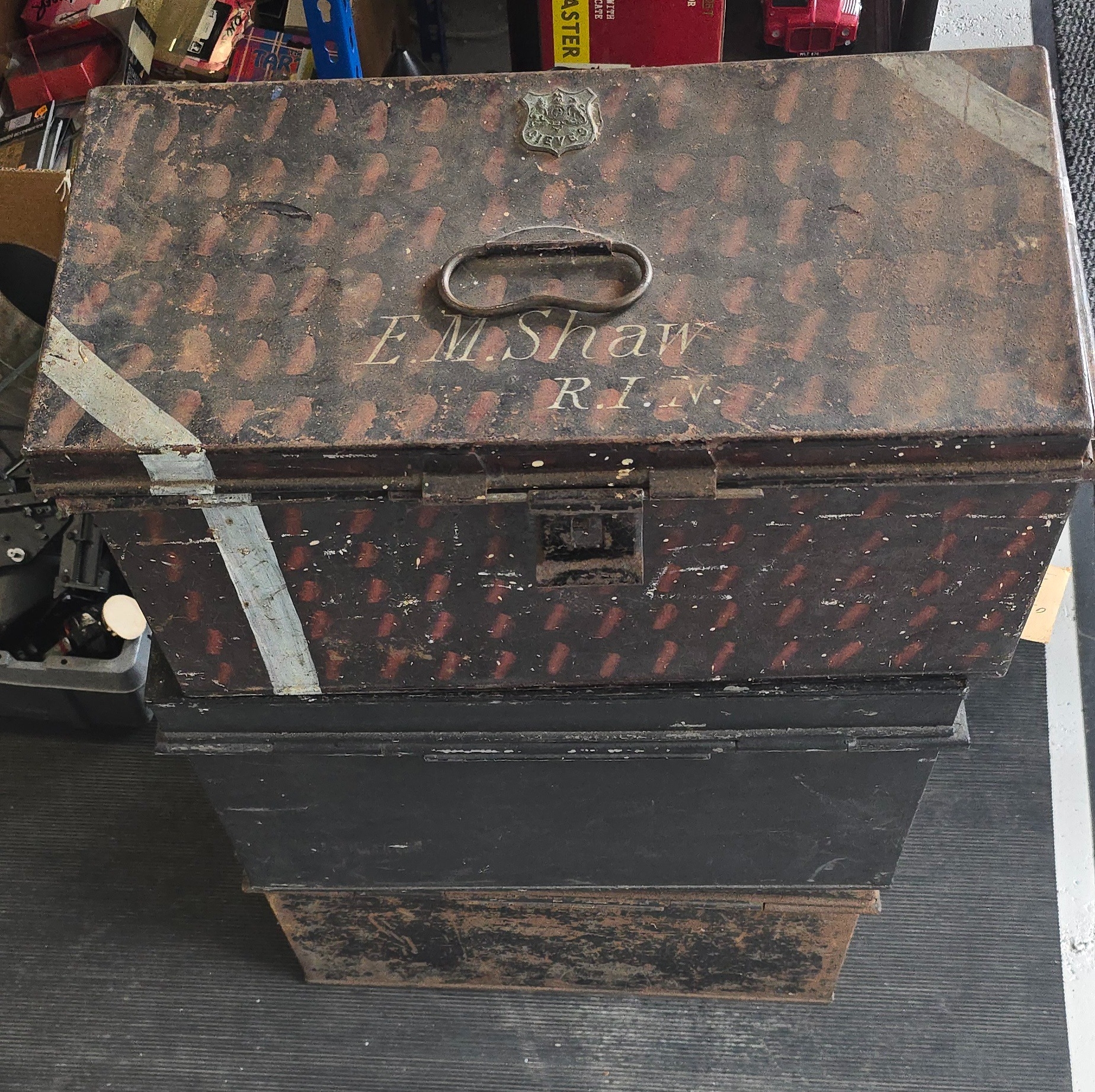 3 X metal storage boxes, one marked E.M Shaw R.I.N Gieves.