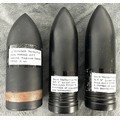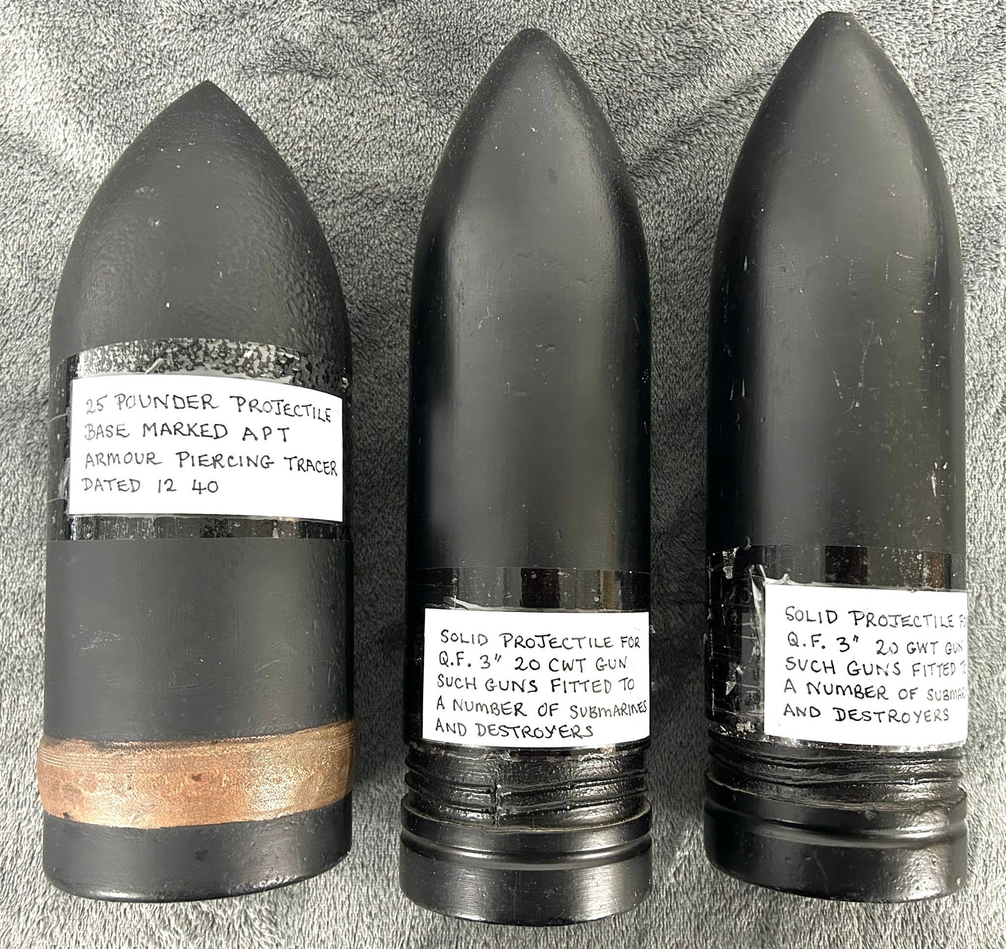 A pair of 3" solid projectiles for 20 CWT quick firing guns as fitted to submarines and destroyers (driving bands removed); together with a 25 pounder projectile, base marked APT ARMOUR PIERCING TRACER and dated 12 - 40 with copper driving band. Good condition, some cleaned pitting and all now painted black.