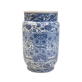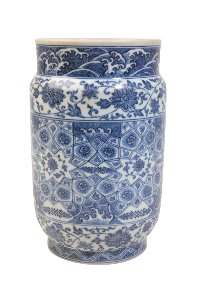 A CHINESE BLUE AND WHITE CYLINDRICAL VASE in Qianlong style, the sides painted in tones of underglaze blue with crashing waves, lotus blossom and stylised flowerhead motifs, 22.5cm high