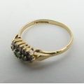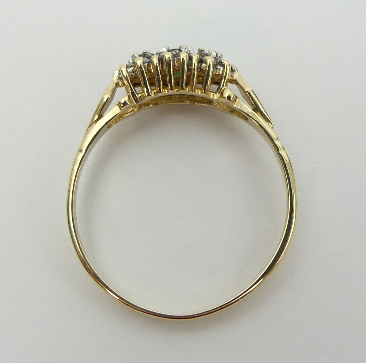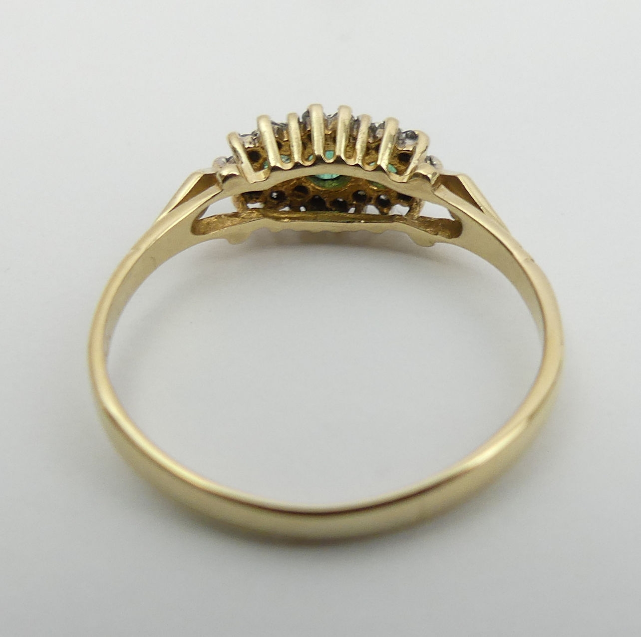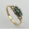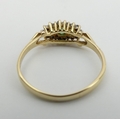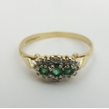 9ct gold emerald and diamond ring, 1.4 grams. Size P, 6.4 mm wide. UK Postage £12.