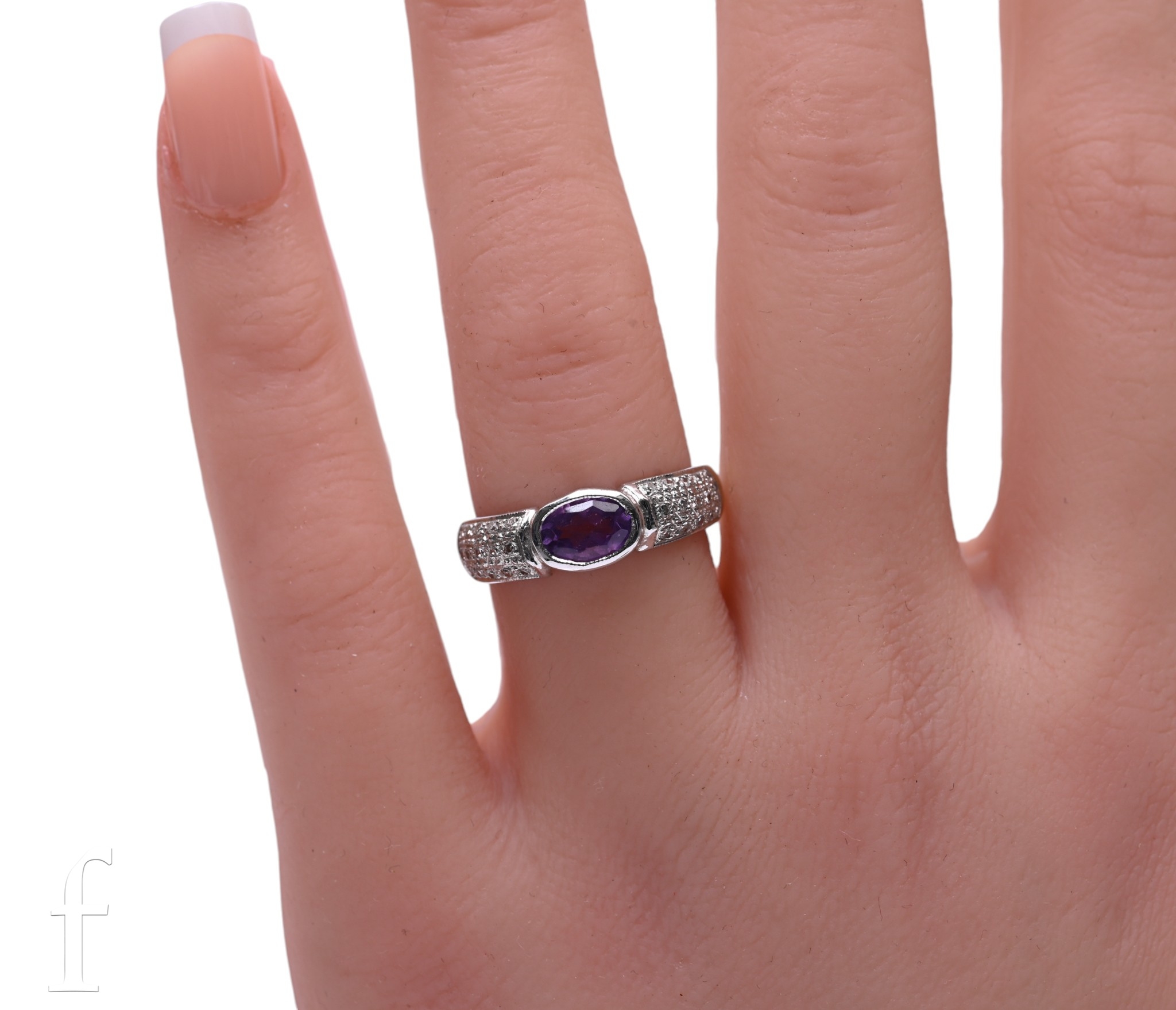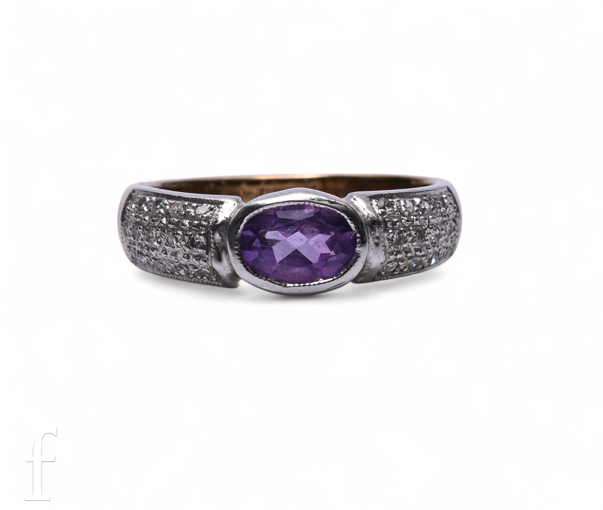 An amethyst and diamond 9 carat gold stone set dress ring, the central amethyst flanked by two diamond set panels, marked .375, total weight 3.7g, Sheffield 2001, ring size L 1/2.