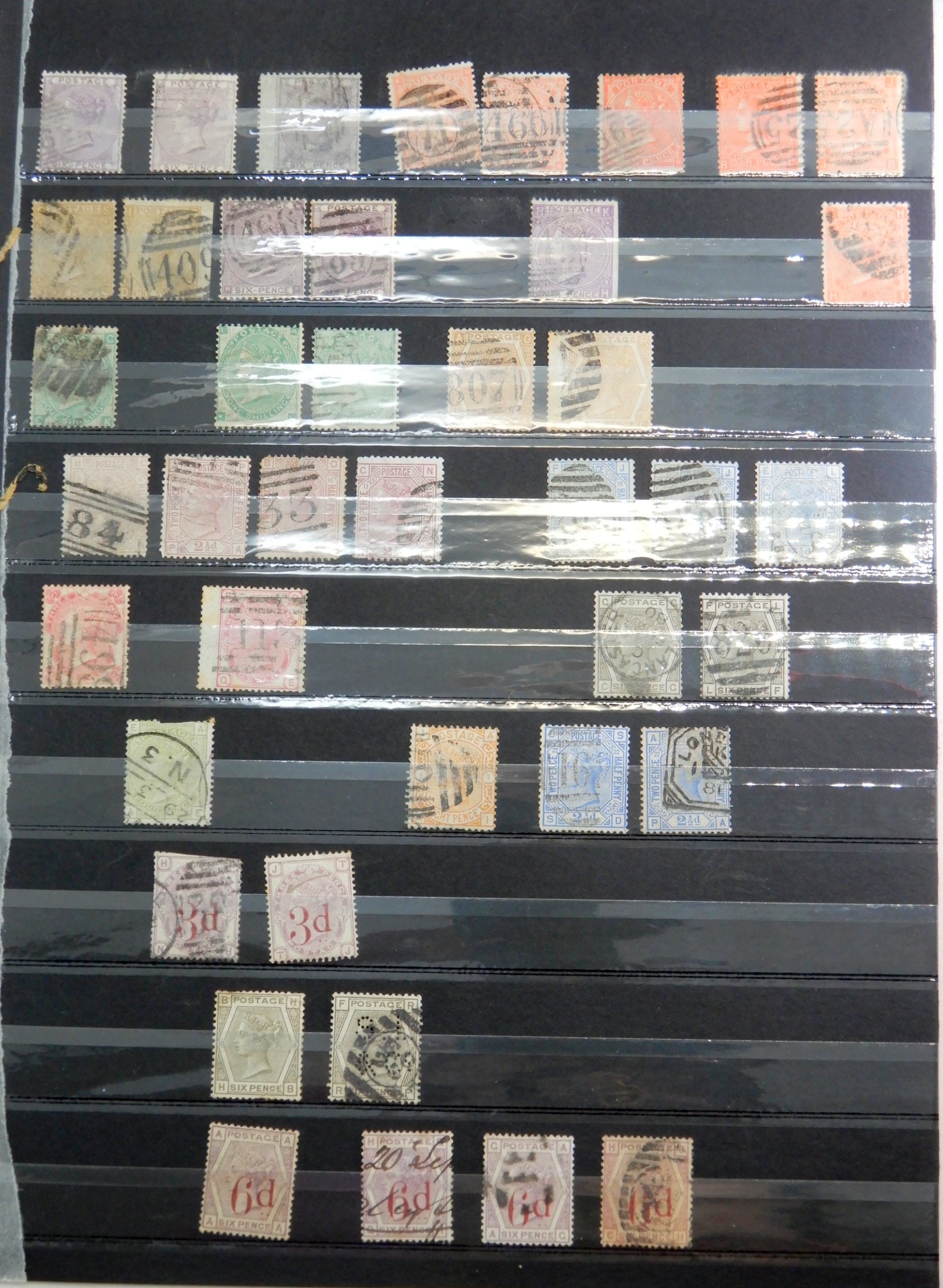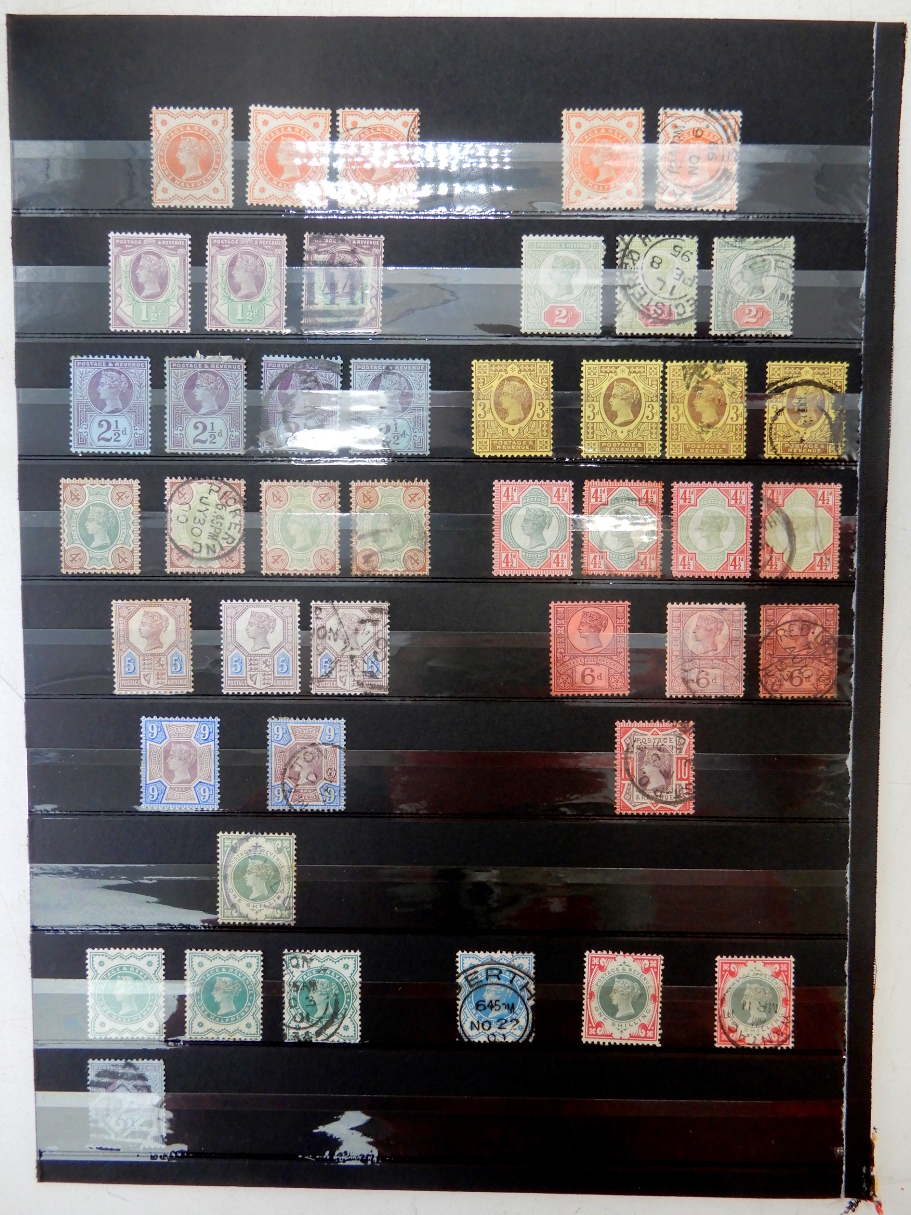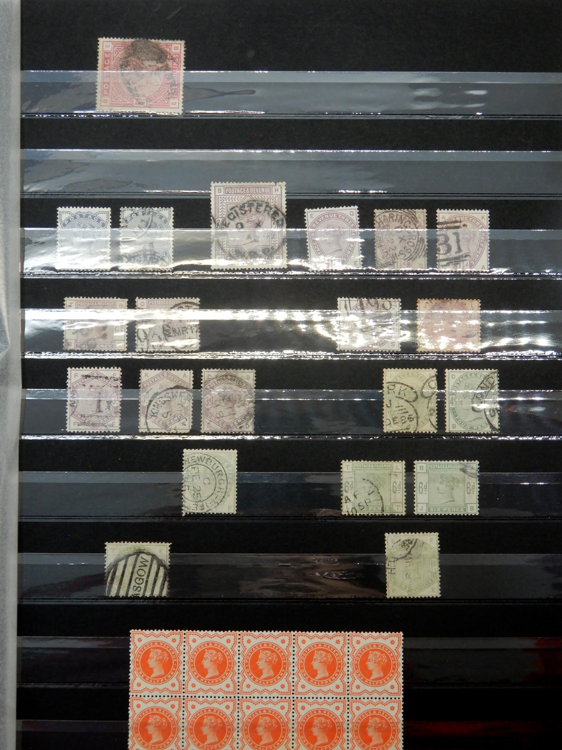 Great Britain. Collection of Victorian Surface Printed Stamps on Stockbook Pages with values to 5/-. inc. SG 66 4d used, 3 of 6d with emblem watermark, 1/- SG 72, all used. Also noted 1 of 8d, 2 of 9d , 2 of 4d used Malta, 3 of 6d on 6d SG 162 plus one fiscal, 2 of SG 170, 1883 set used plus some duplication, 1887 & 1900 set used plus some values mint plus many more stamps. A GOOD LOT with Very High Cat Value, Condotion as per Photos