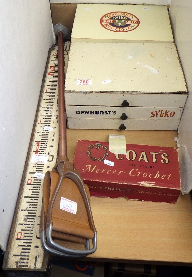 Two Sylco Dewhurst's shop drawers, hunting stiçk, surveyor’s measure etc