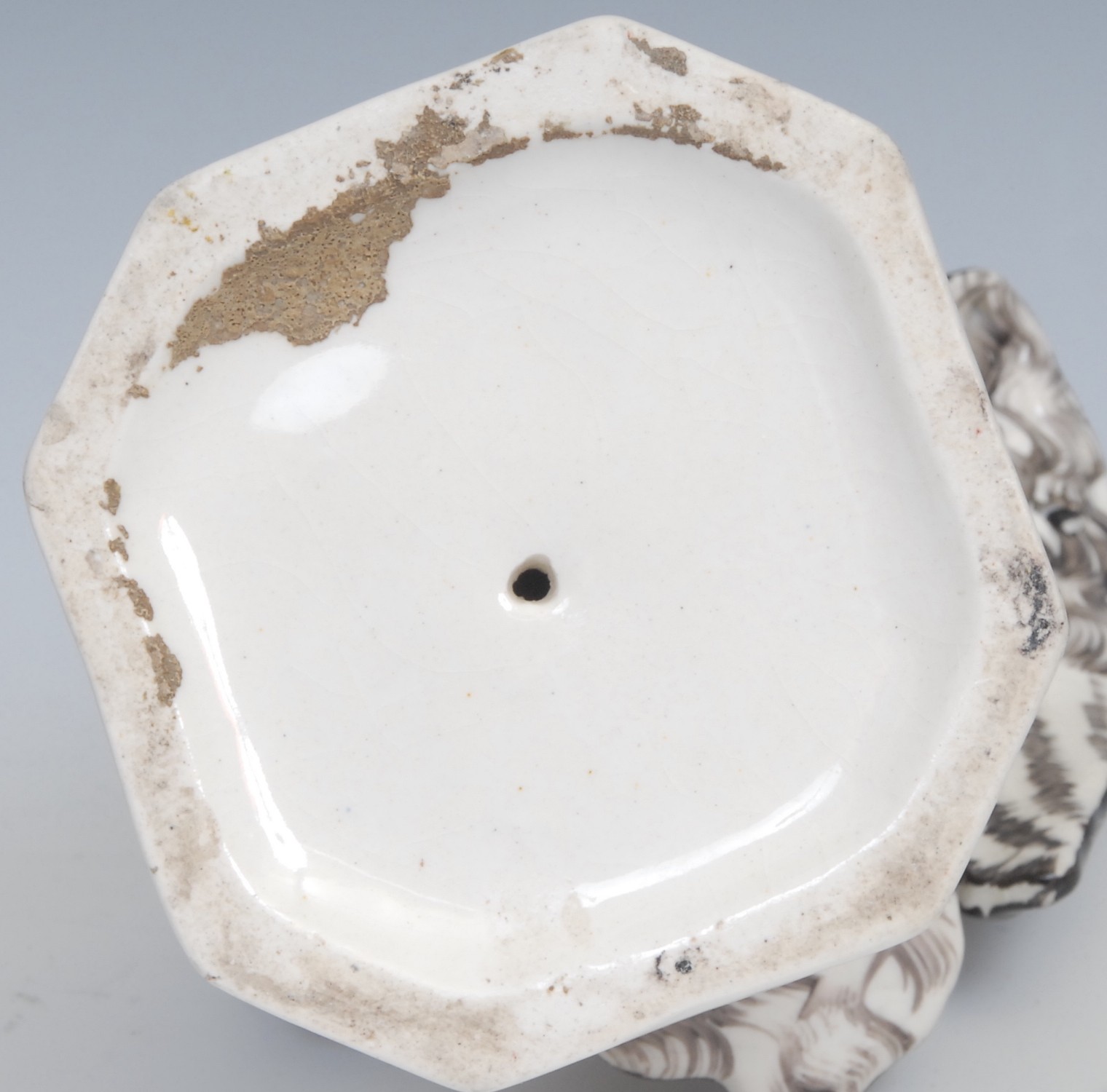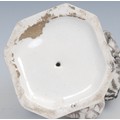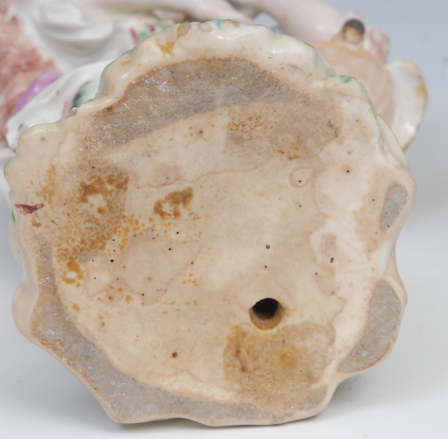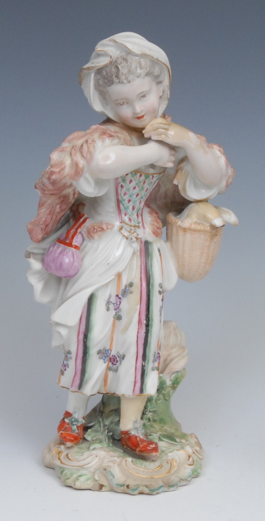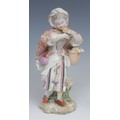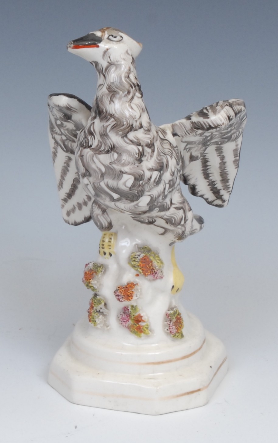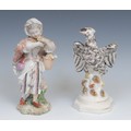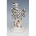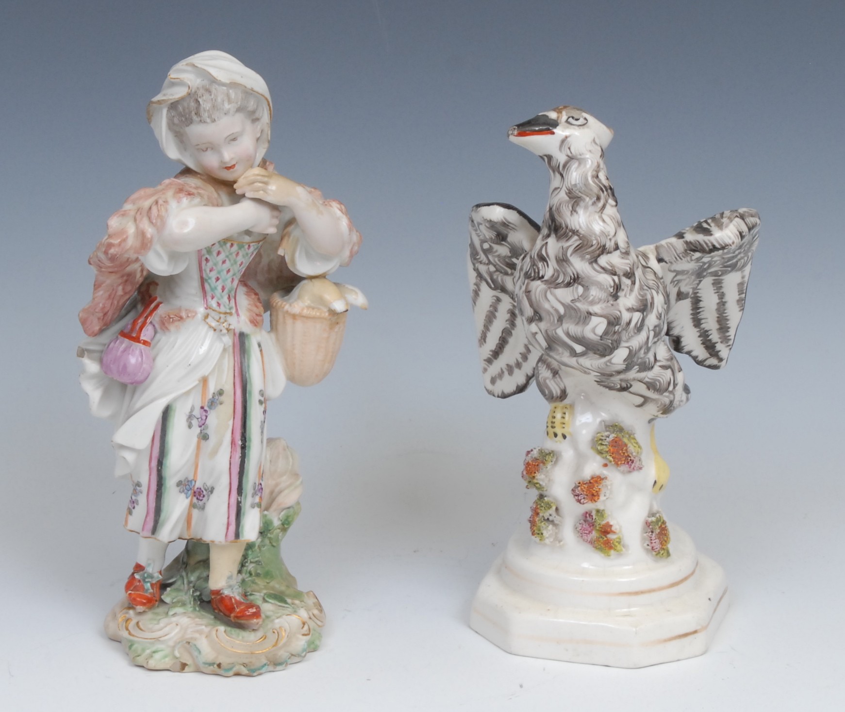 An 18th century Derby patchmark figure, of a girl with basket, scrolling foliate base, 20.5cm high, c.1770; a 19th century Staffordshire model, of an eagle, perched on rocky outcrop, c.1840 (2)