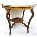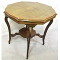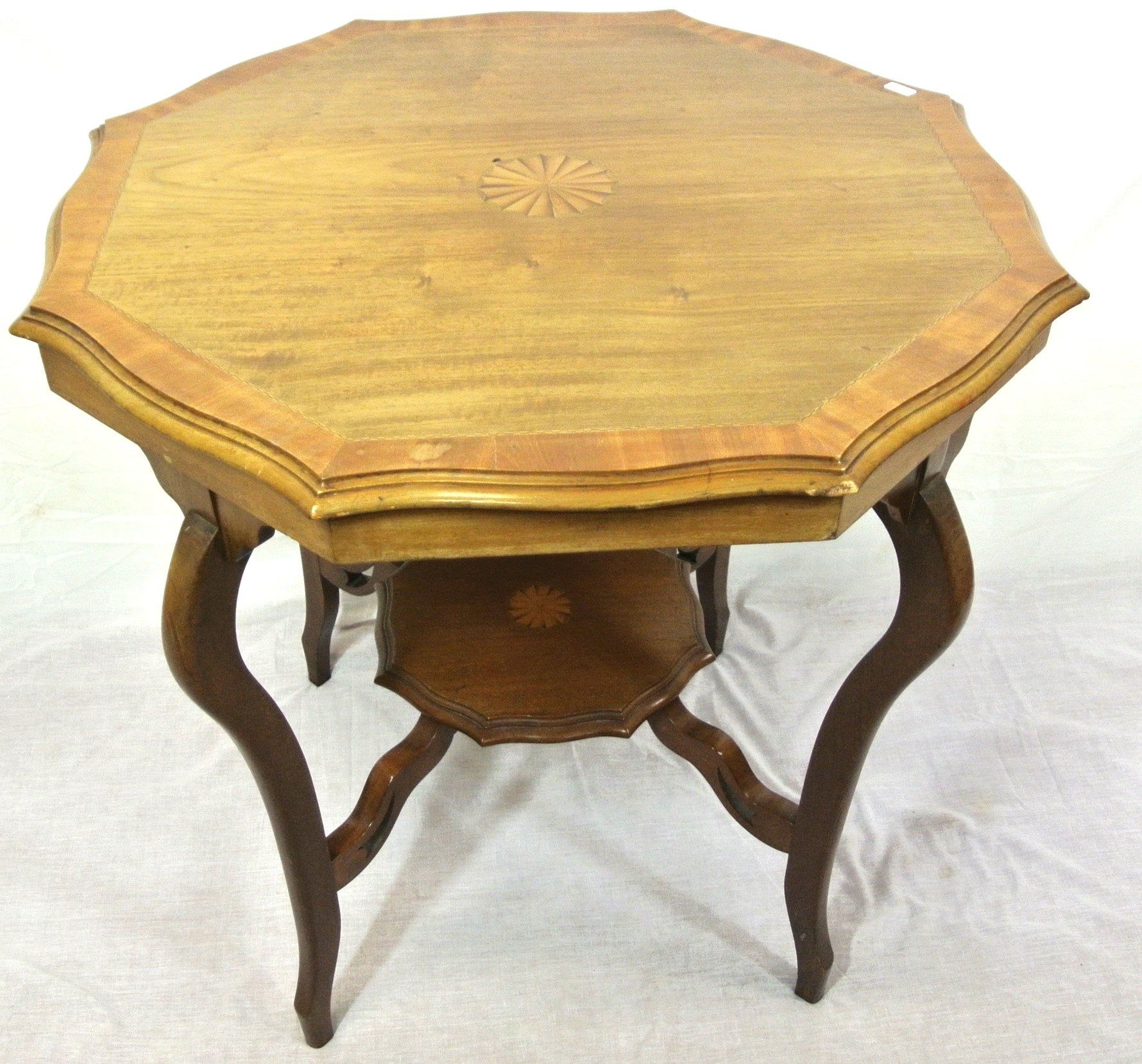 Edwardian inlaid and crossbanded mahogany occasional table with wavy borders, shaped legs and stretchers