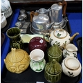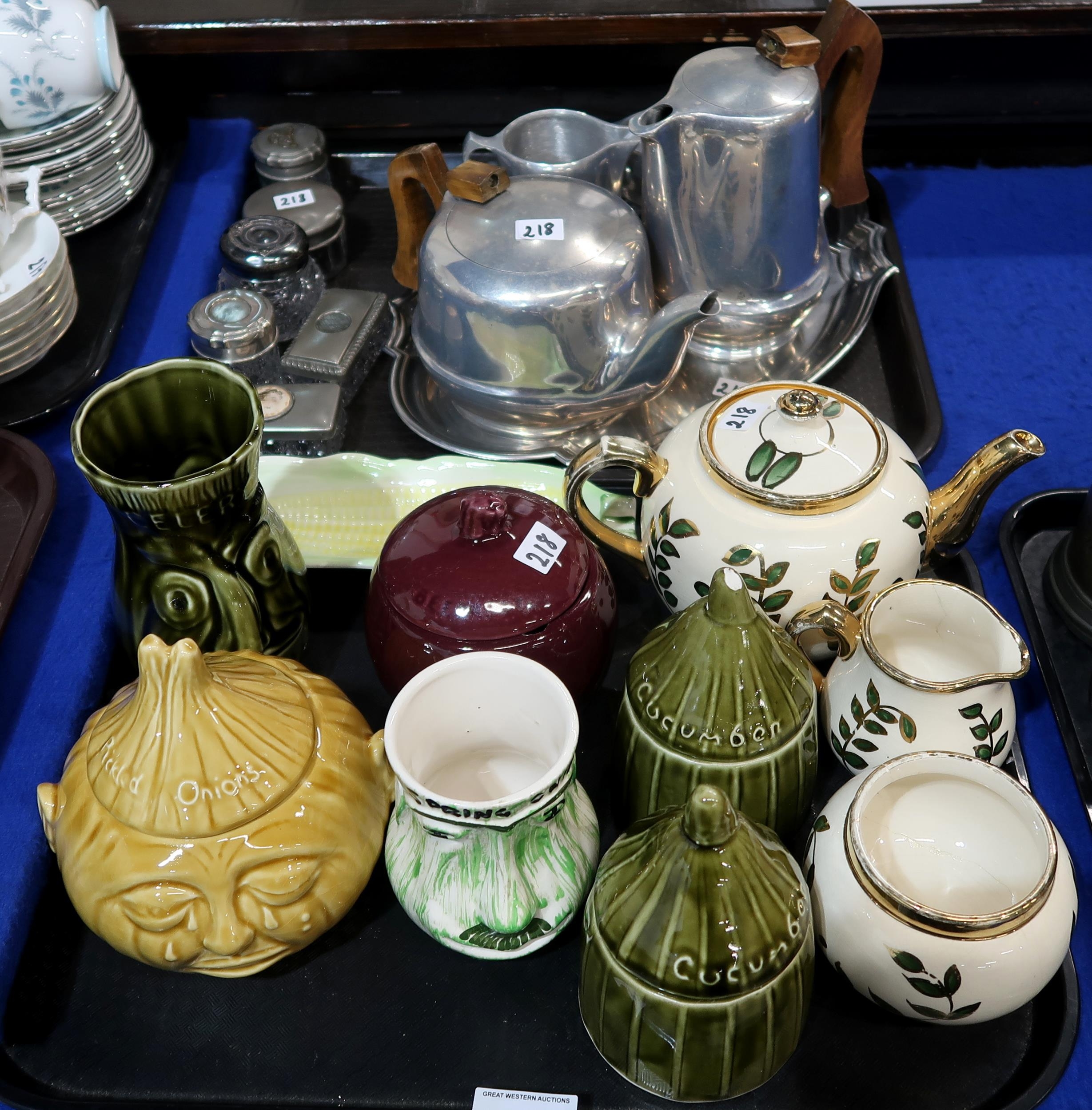 A Picquotware four piece teaset, a Sylvac style salad sets with pickle jars, a Sudlows three piece teaset and assorted cut glass toilet jars and bottles