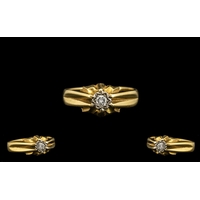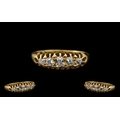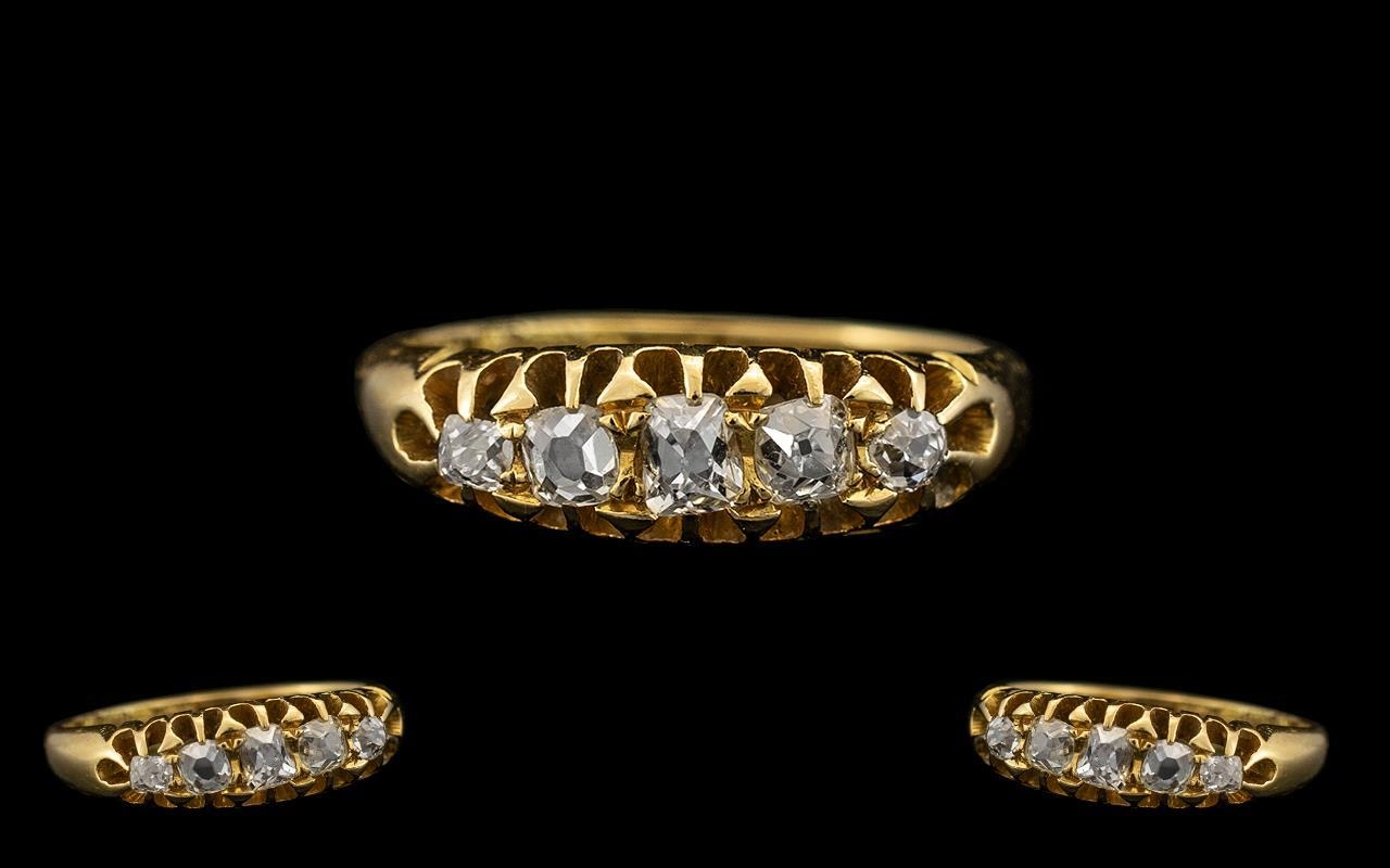 Antique Period 18ct Gold - Good Quality 5 Stone Diamond Set Ring, Gallery Setting with Full Hallmark for 18ct. The Old Cut Diamonds of Sharp and Crisp Appearance, Est White Colour with Excellent Clarity. Ring Size - O. 3.9 grams. All Aspects of Condition Are Excellent.