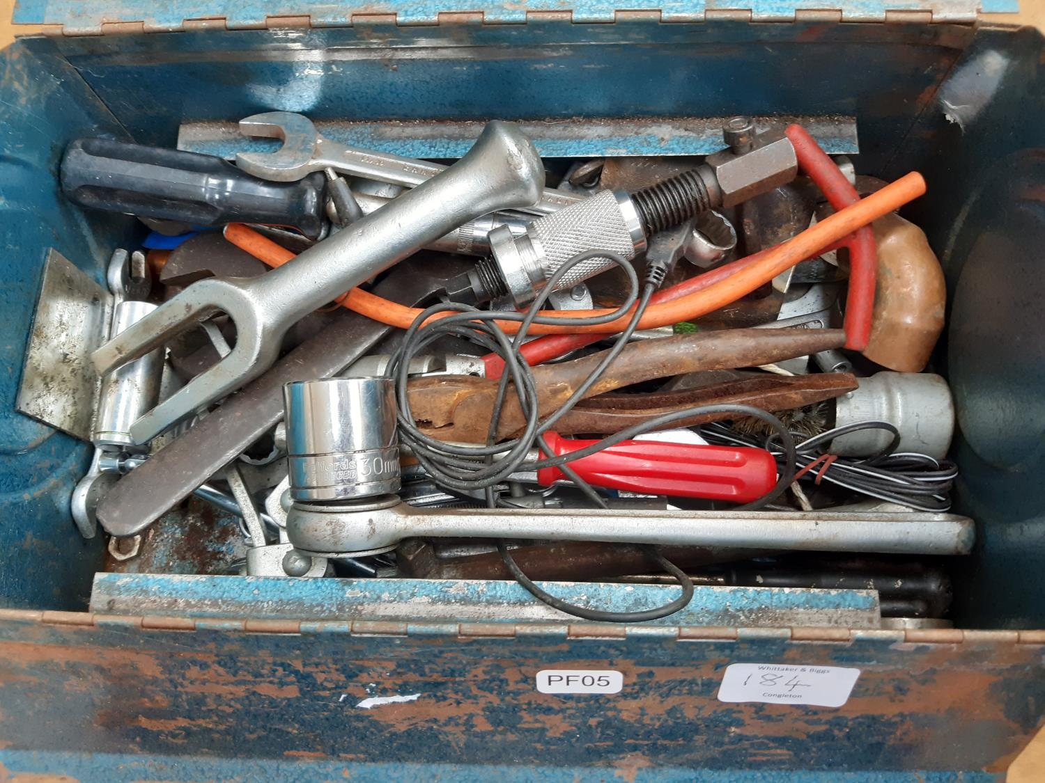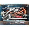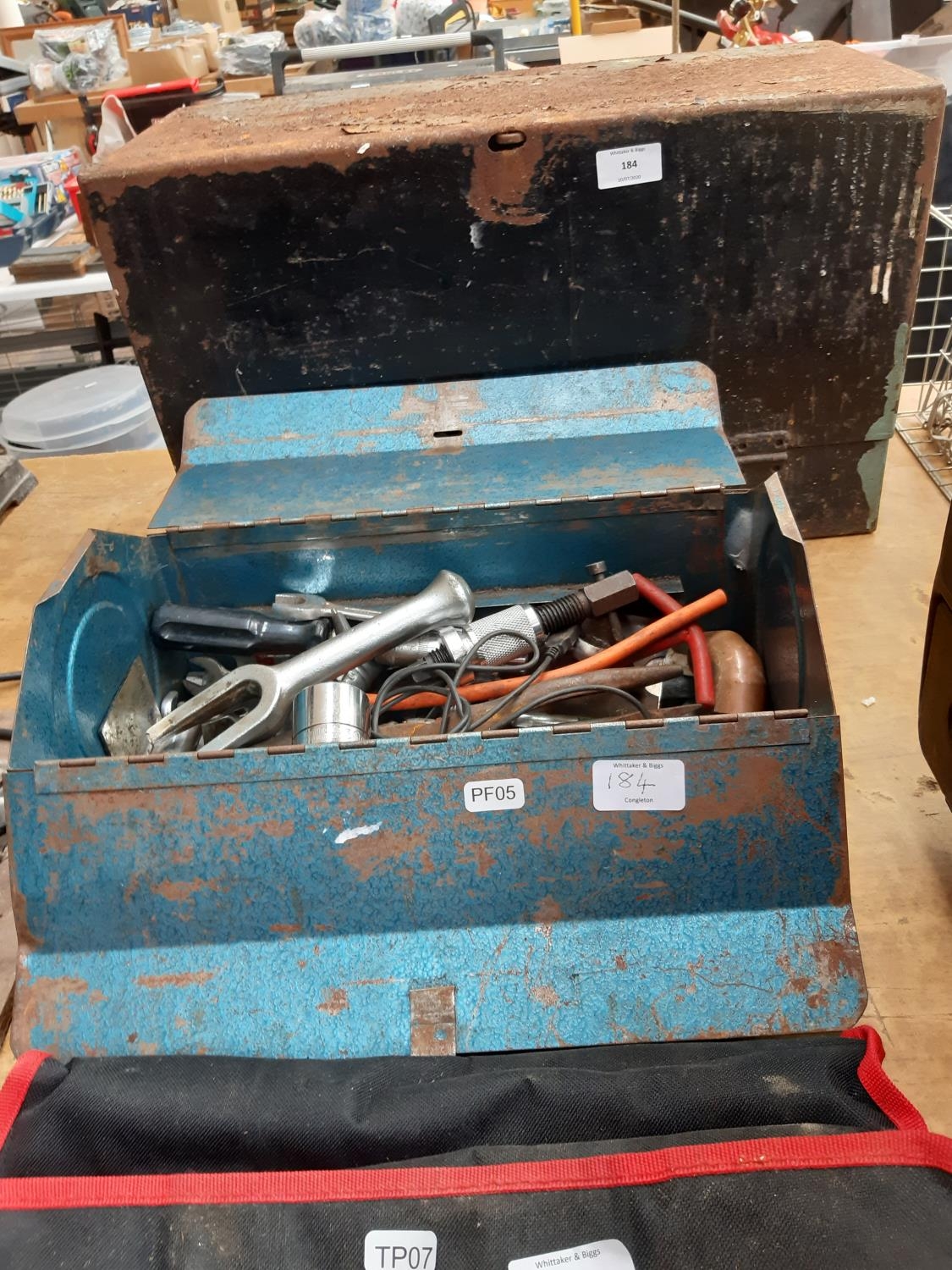 TWO METAL TOOL BOXES CONTAINING BALL JOINT SPLITTER, METABO 1/2" RATCHET, BRAKE CALIPER WIND BACK TOOL, SPANNERS ETC.