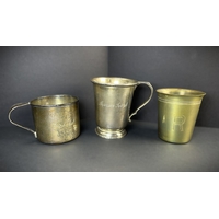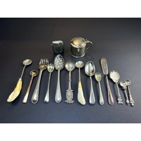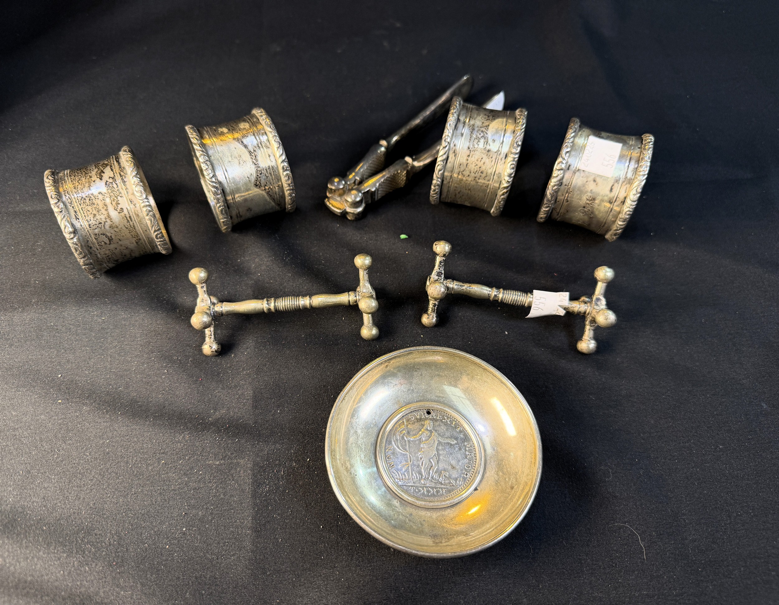 A small circular white metal dish with inset coin / medallion, unmarked; a pair of nutcrackers; a pair of knife rests and a set of 4 heavy napkin rings