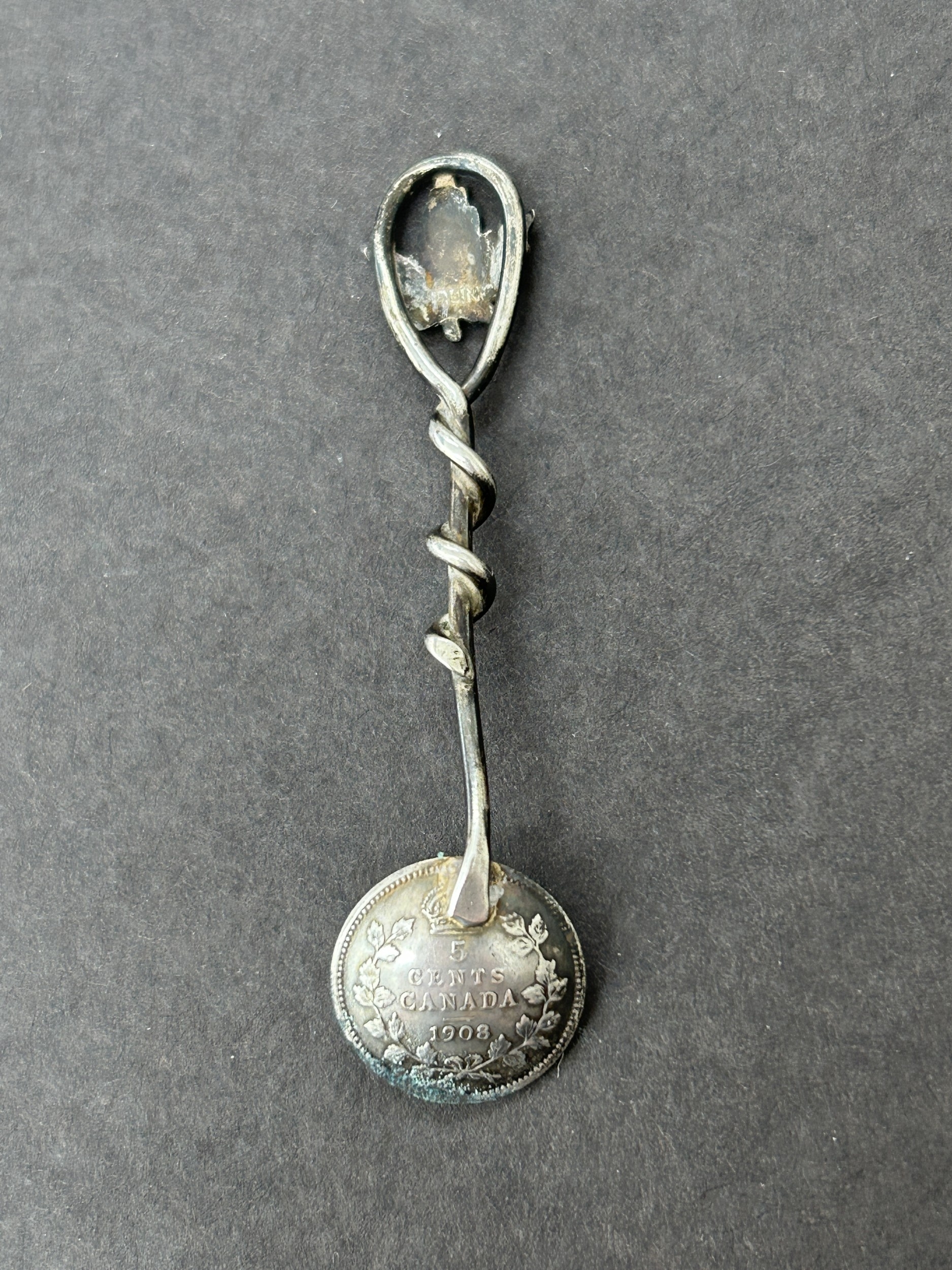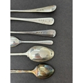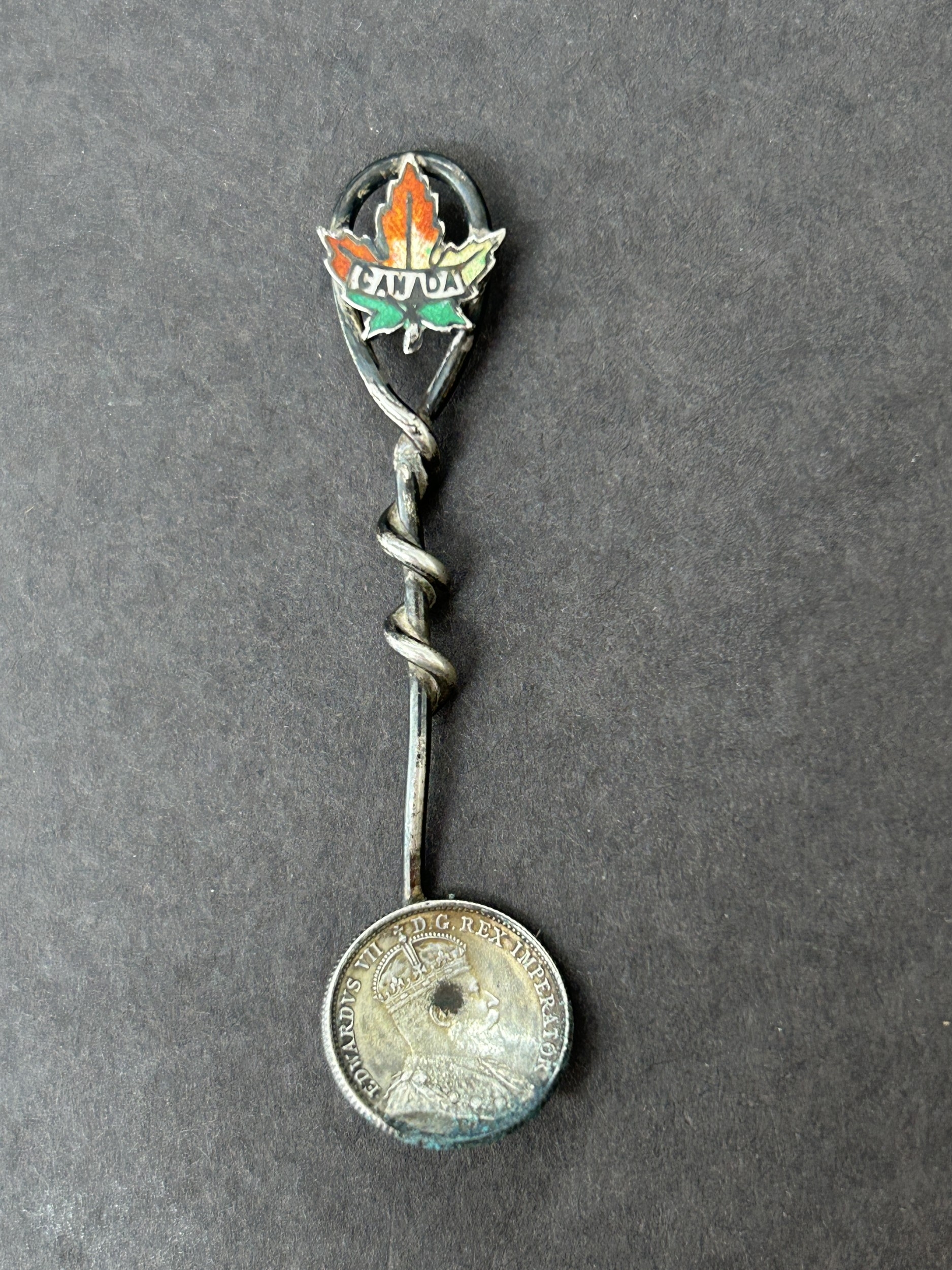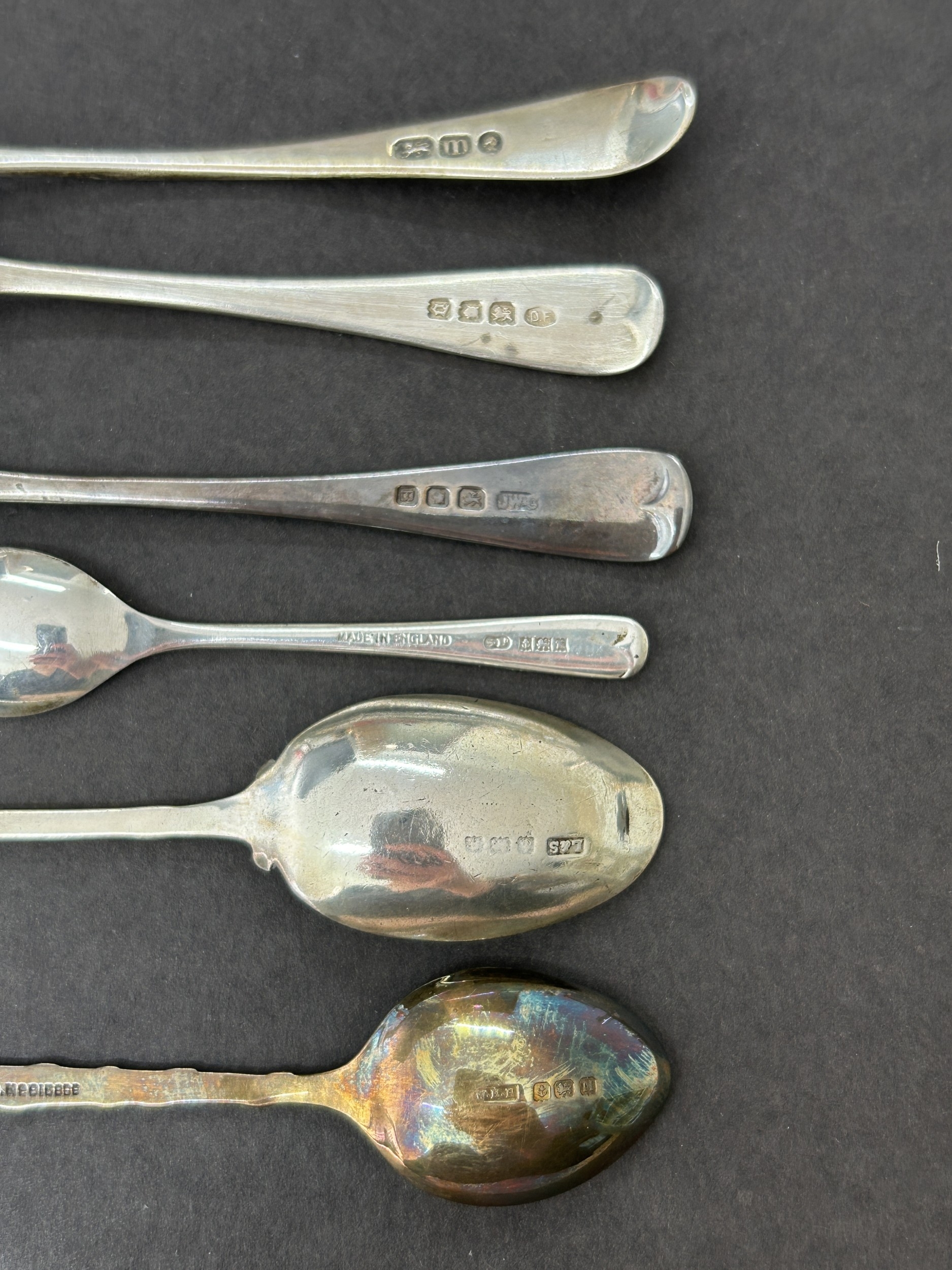 Three mixed dates and makers hallmarked silver teaspoons, weight approx. 33g together with two silver and enamel spoons, weight approx. 24g, a silver mustard and a sterling Canadian salt spoon with coin bowl, weight approx. 9g and a German silver plated rose decorated spoon
