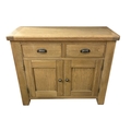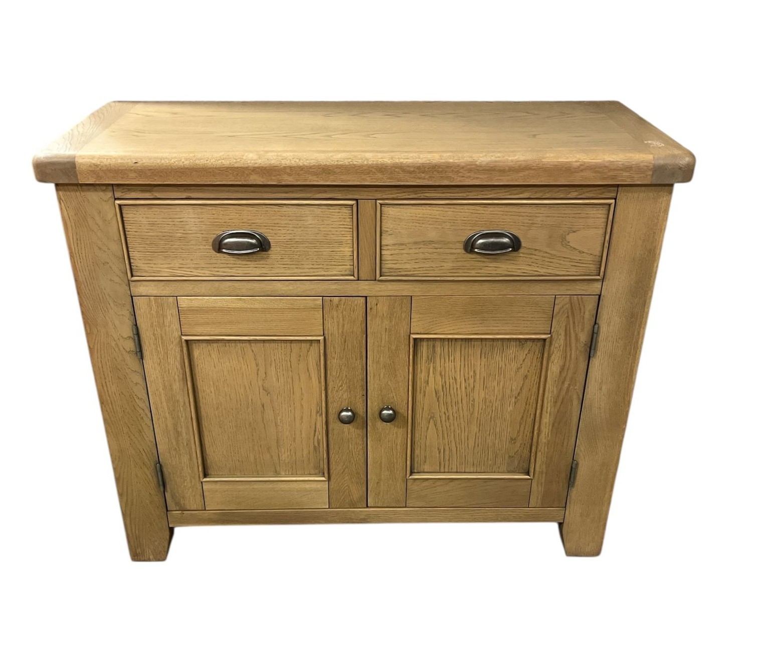 A CONTEMPORARY OAK SIDE CABINET of rectangular outline the shaped top with two frieze drawers and cupboards on moulded legs 91cm (h) x 110cm (w) x 45cm (d)