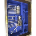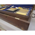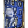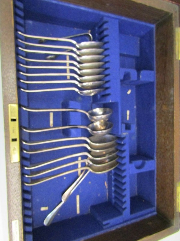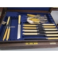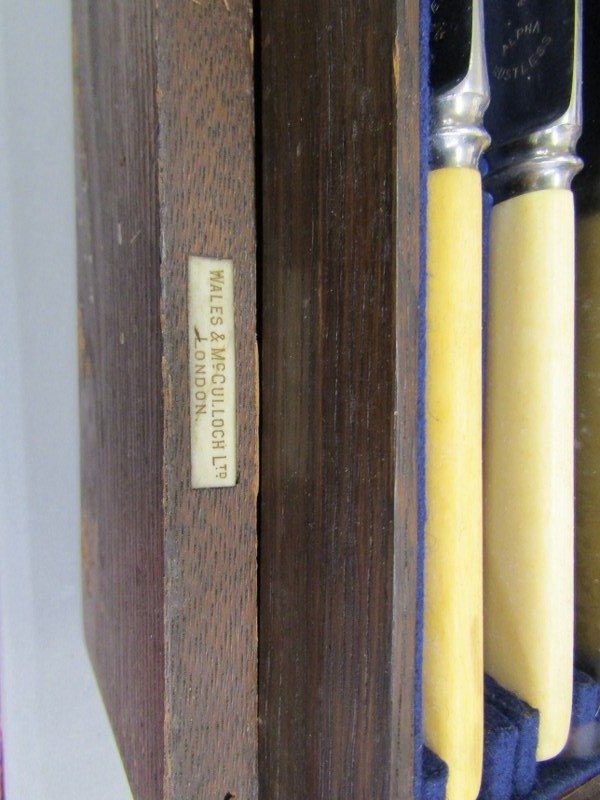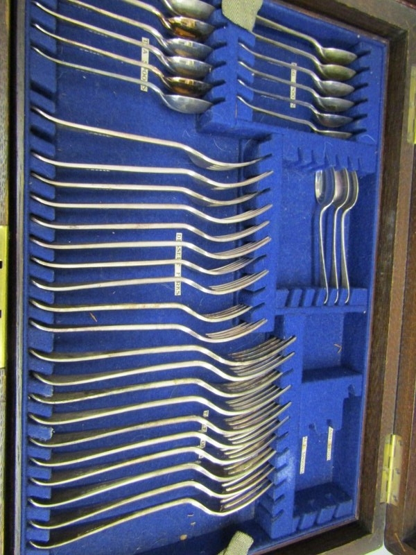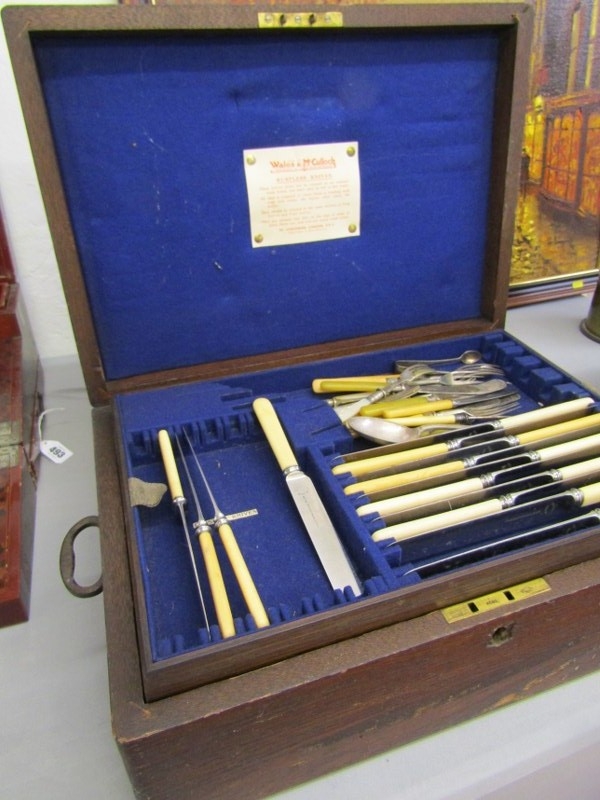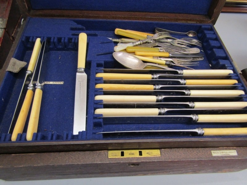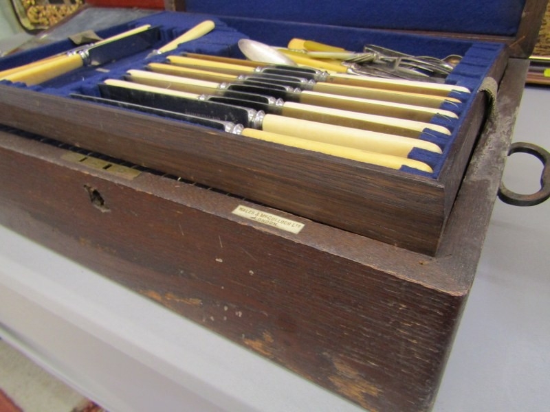 CANTEEN OF CUTLERY, an oak canteen cutlery box with 2 carry handles by Wales & McCulloch with blue lined interior and 2 pull out cutlery drawers, revealing a bottom drawer with a quantity of silver plated cutlery and bone handled knives
