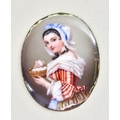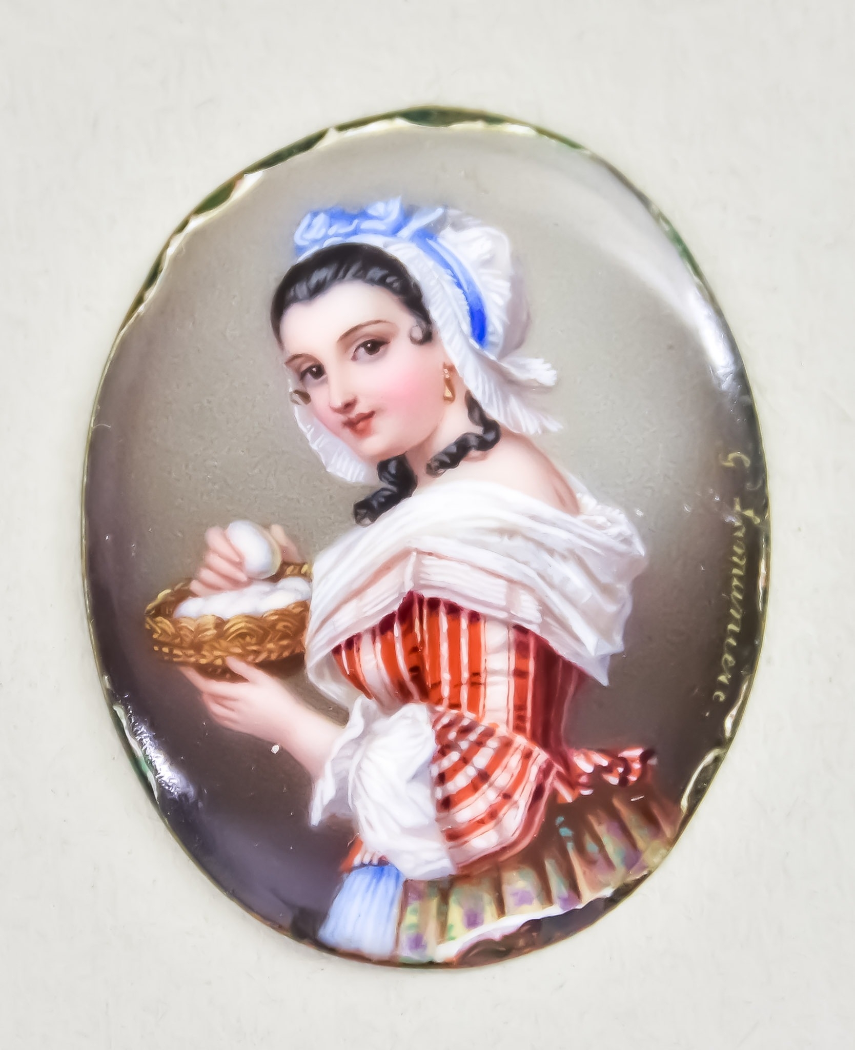 Gaspard Lamuniere (1810-1865) - Oval Enamel Miniature Portrait, depicting a female beauty clutching a basket of eggs, signed, 1.5ins x 1ins