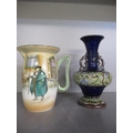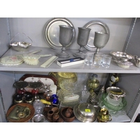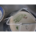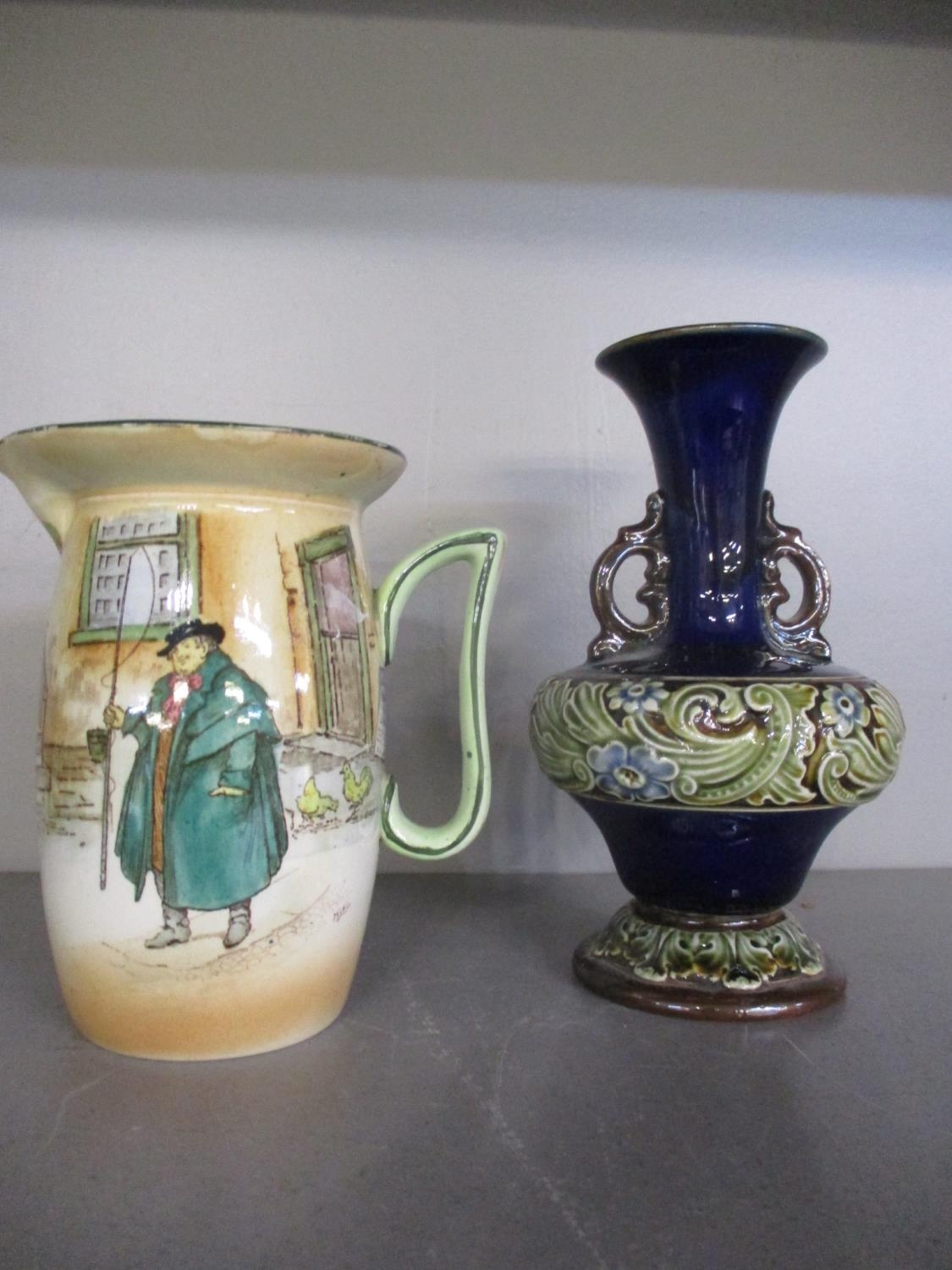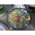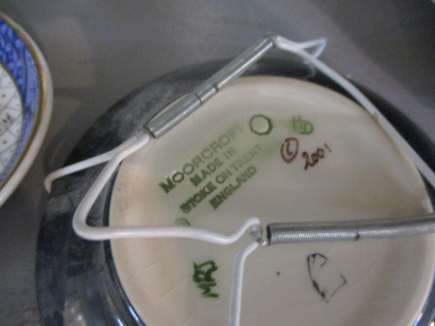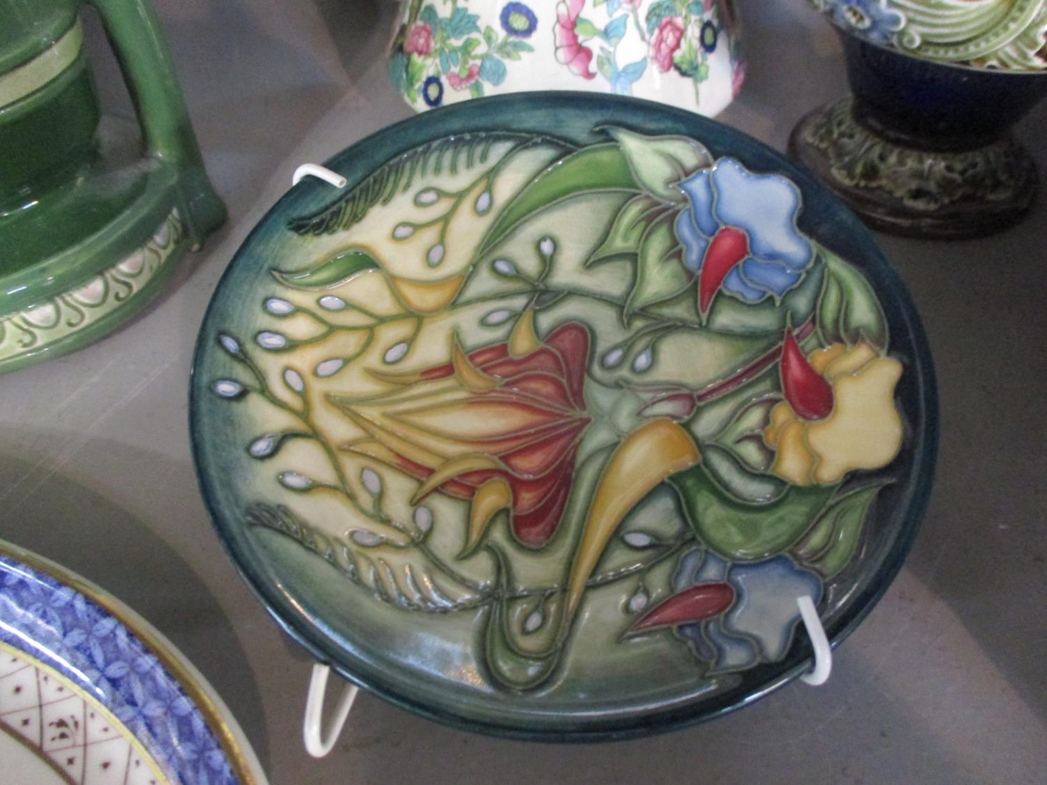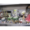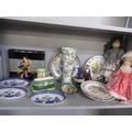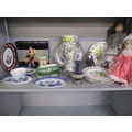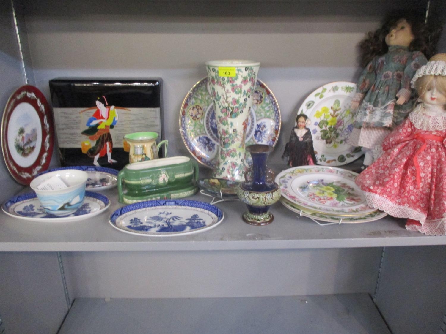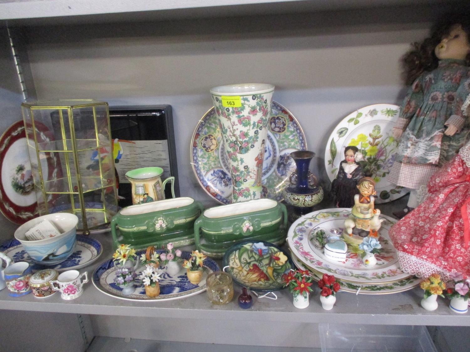A late 20th century Japanese lacquered box, three collectors' dolls, collectors plates, a Doulton vase, a small Moorcroft dish, miniature collectors' ornamental posies, a small table-top glass display box and other items