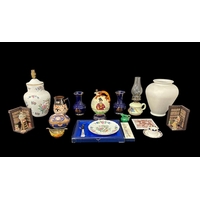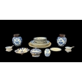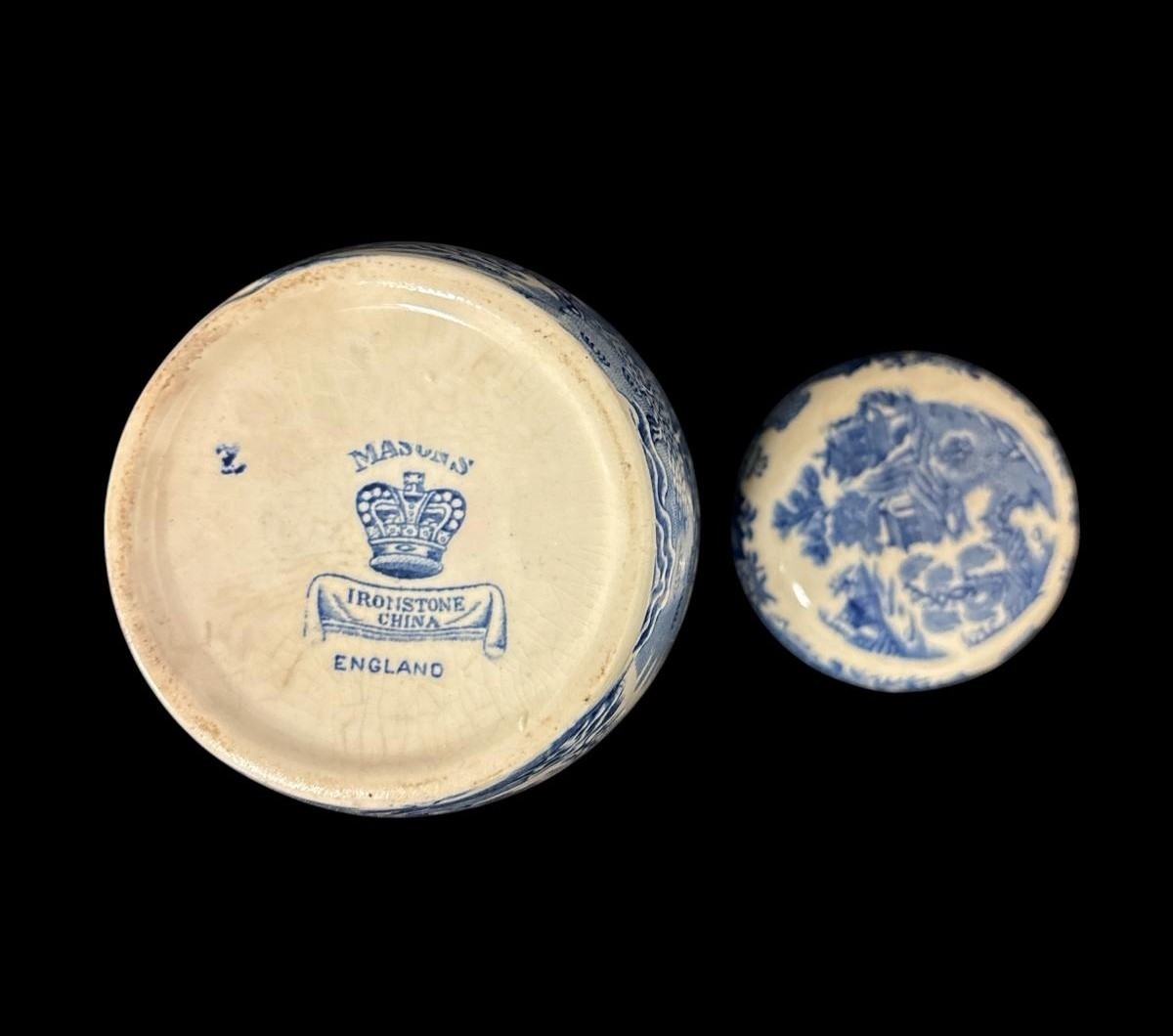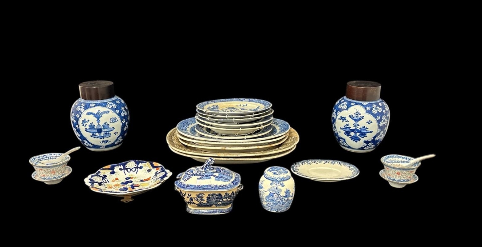 A MISCELLANEOUS COLLECTION OF PORCELAIN AND STONEWARE to include a Mason's Ironstone China ginger jar with lid, a Mason's patent Ironstone China plate, a pair of Chinese porcelain soup bowl sets, a matched pair of blue and white porcelain vases with wooden lids 24cm (h), etc. (25)