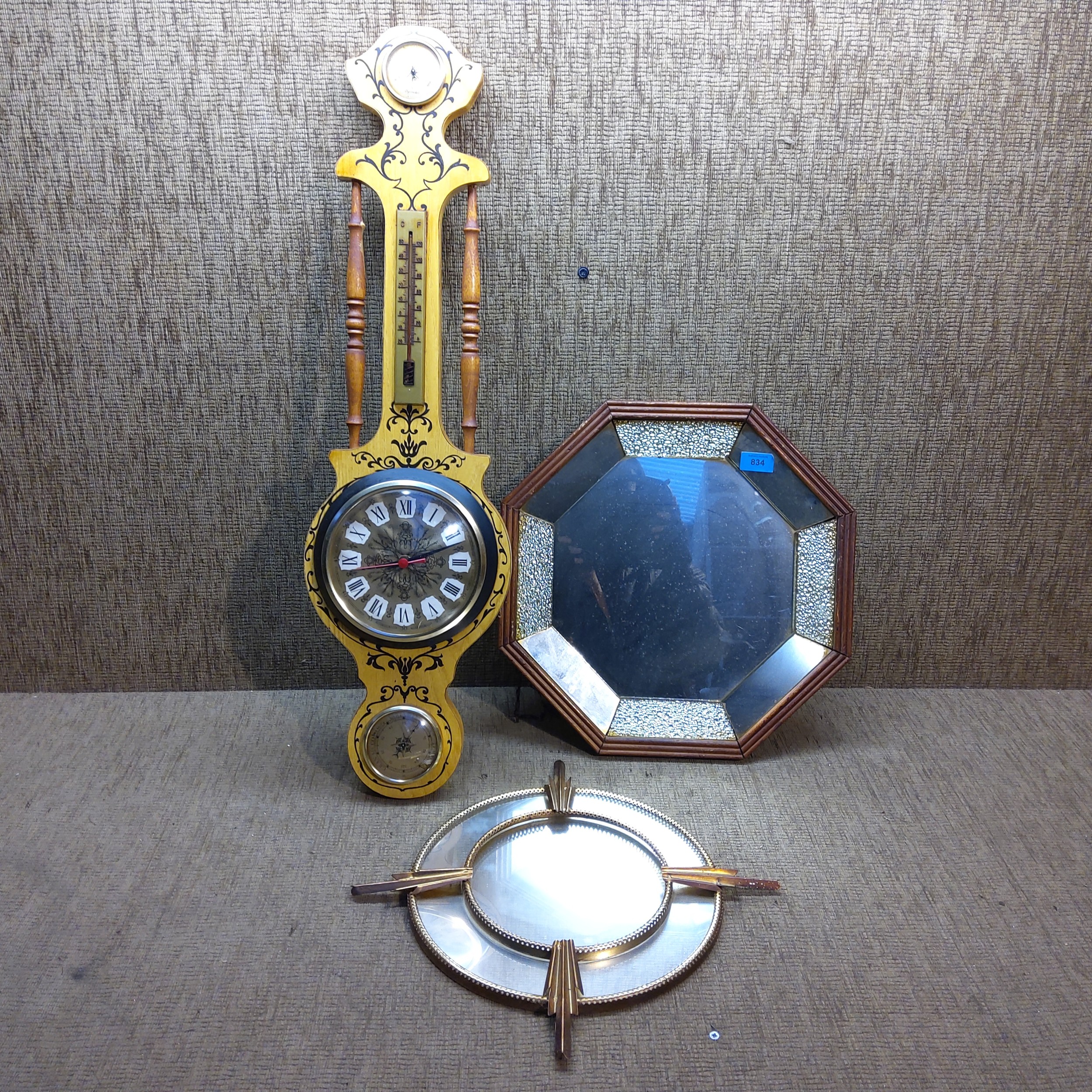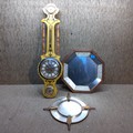Two decorative hanging wall mirrors and a large barometer.