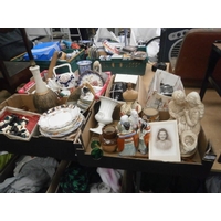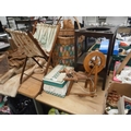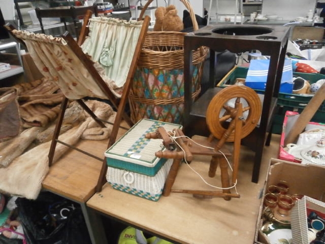 Lot inc wicker basket, sewing basket, mini spinning wheel, etc