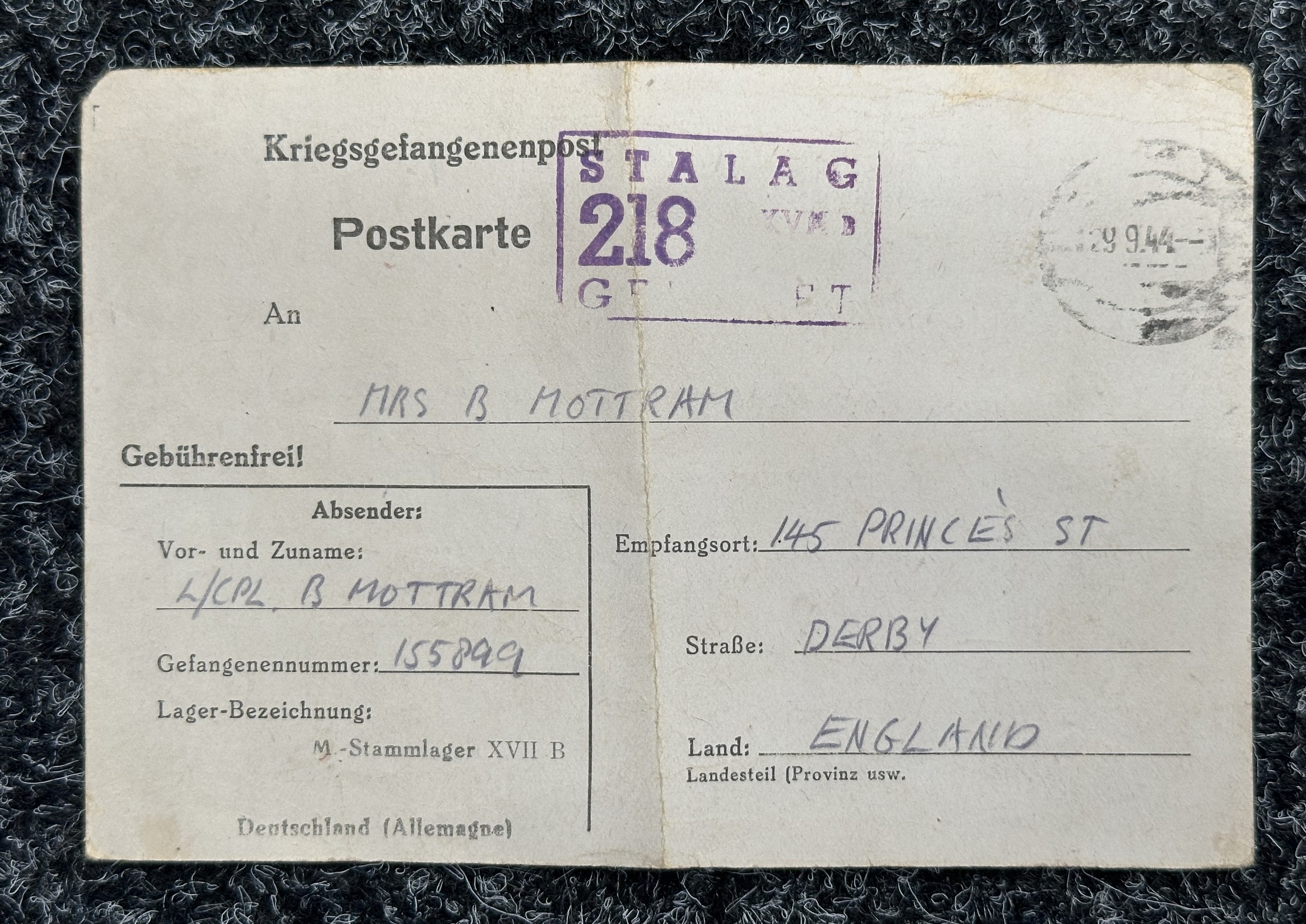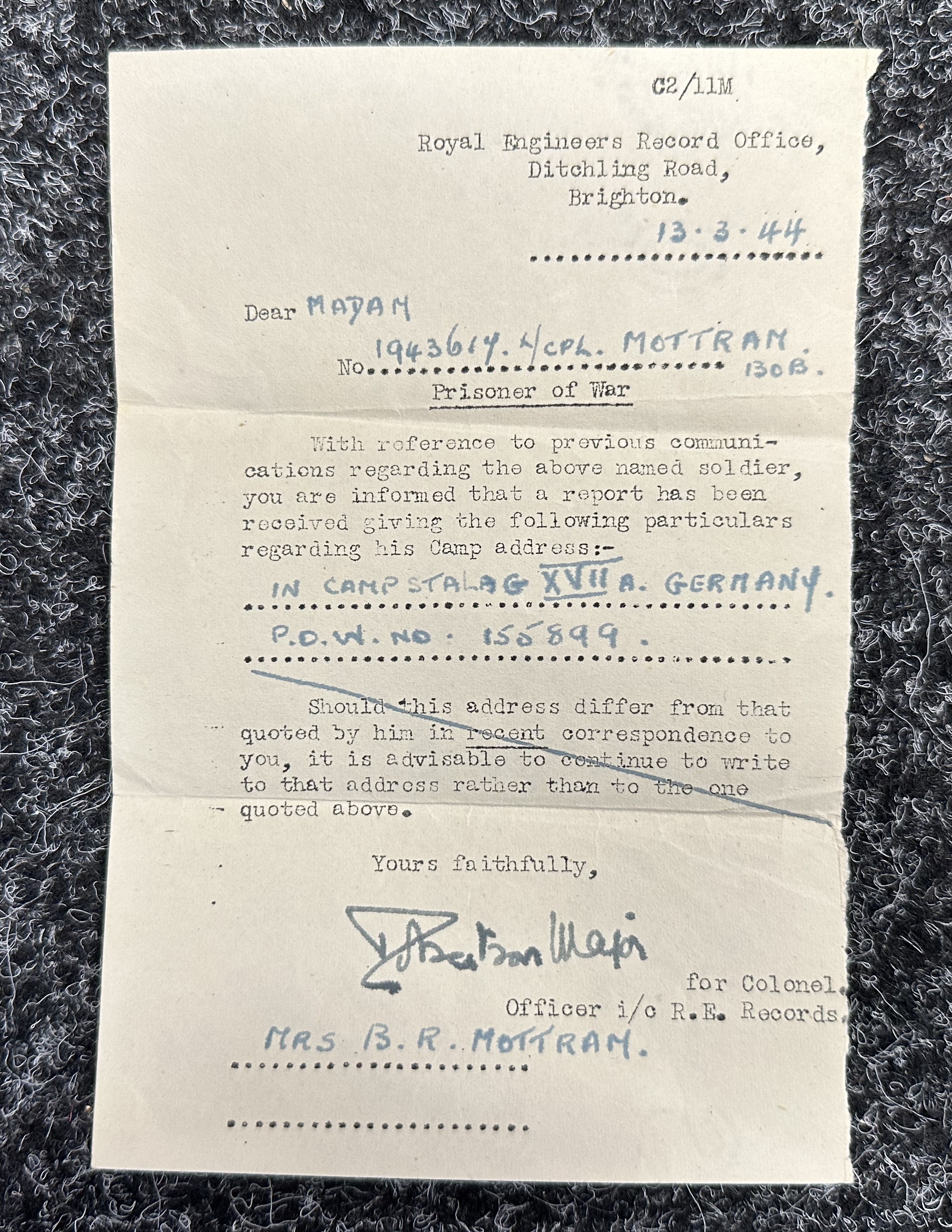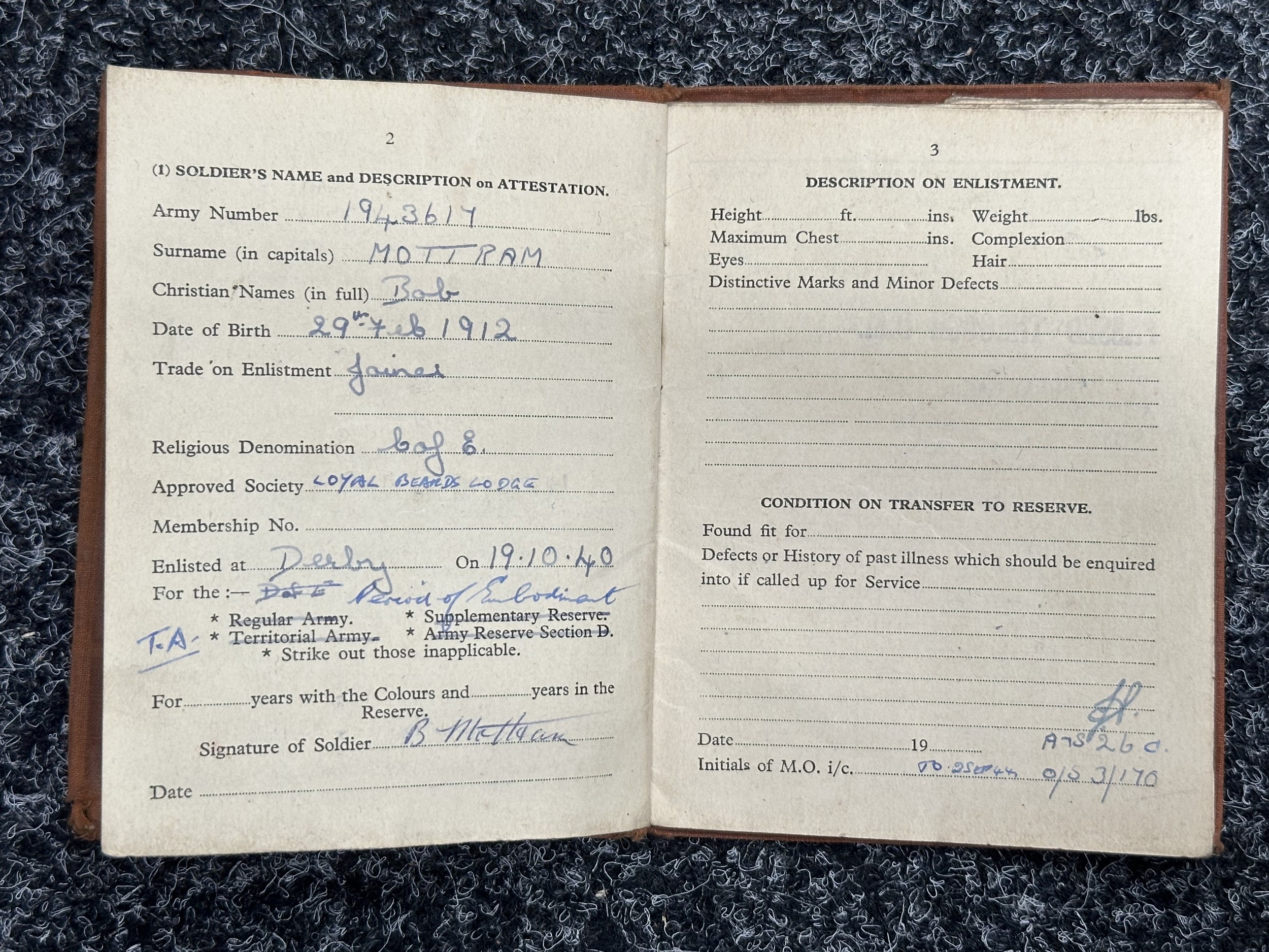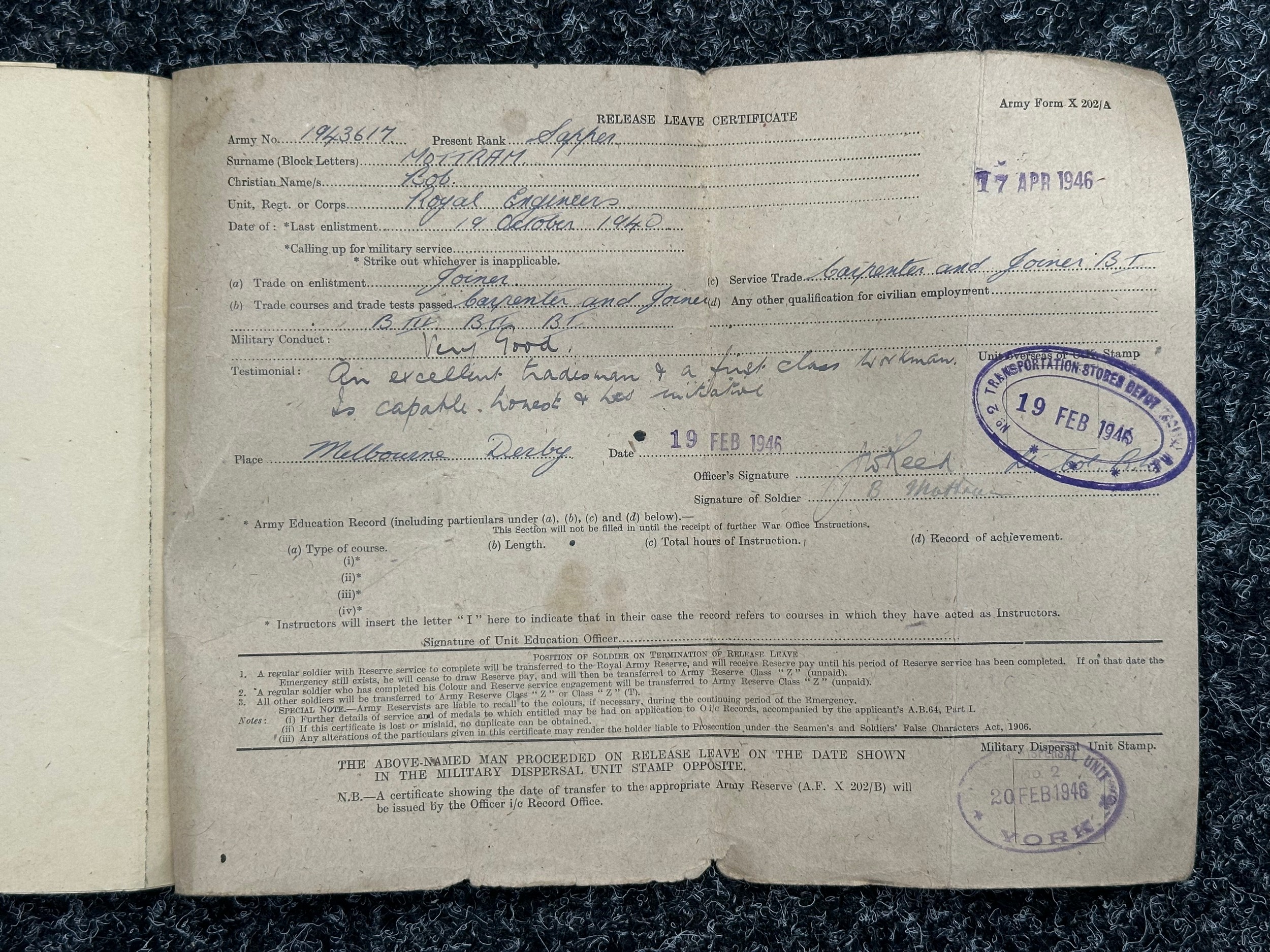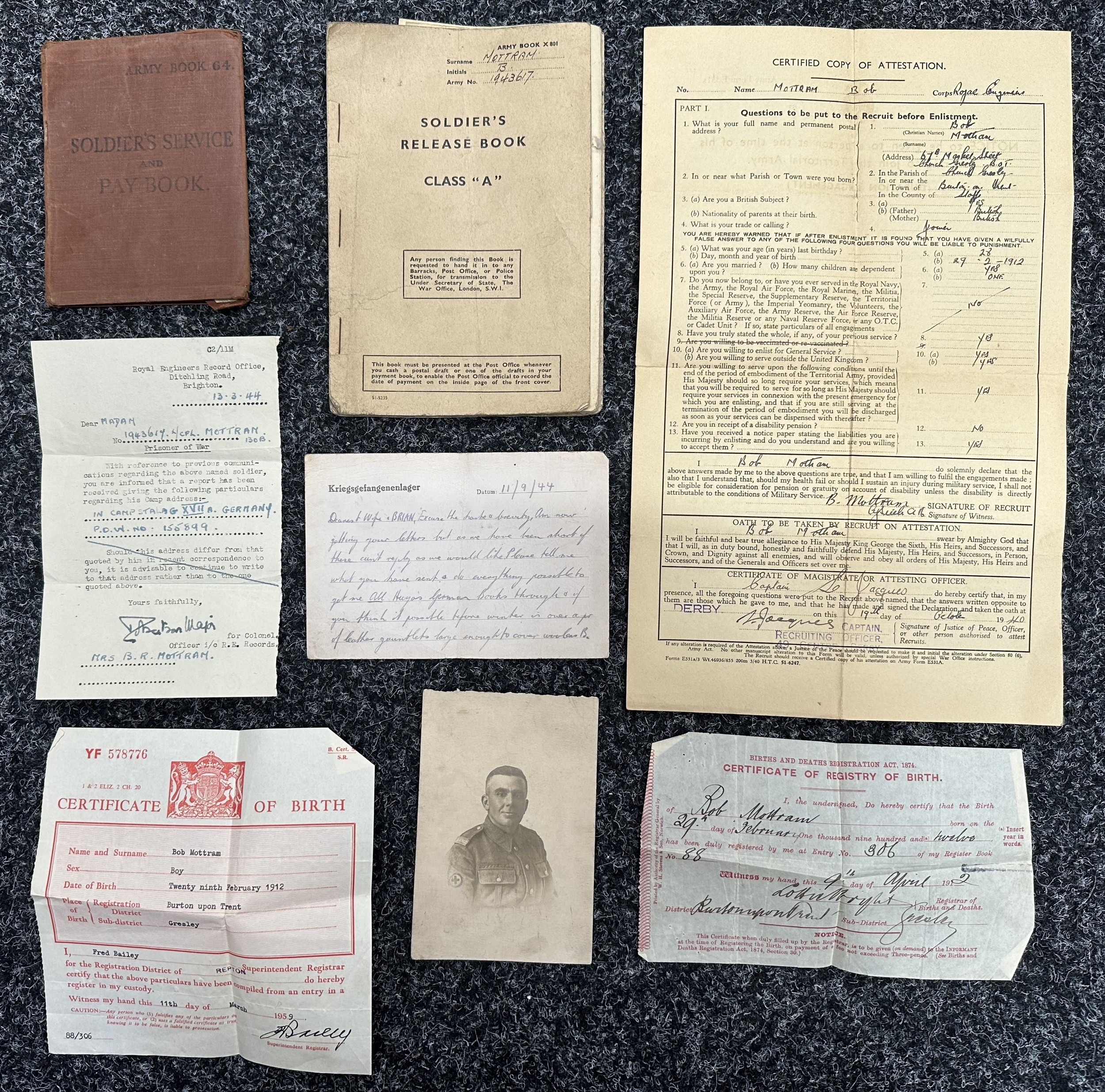 WW2 British PoW Paperwork to 1943617 Lance Corporal Bob Mottram, Royal Engineers comprising of AB64 showing award of Africa Star, Soldiers Release Book Class A, letters confirming status as Prisoner of War in Germany 13/3/44, Attestation Form Dated 1940, Birth Certificates, photo of his father in WW1 while serving with RAMC.