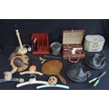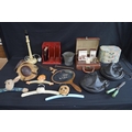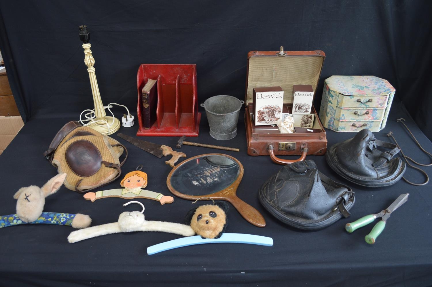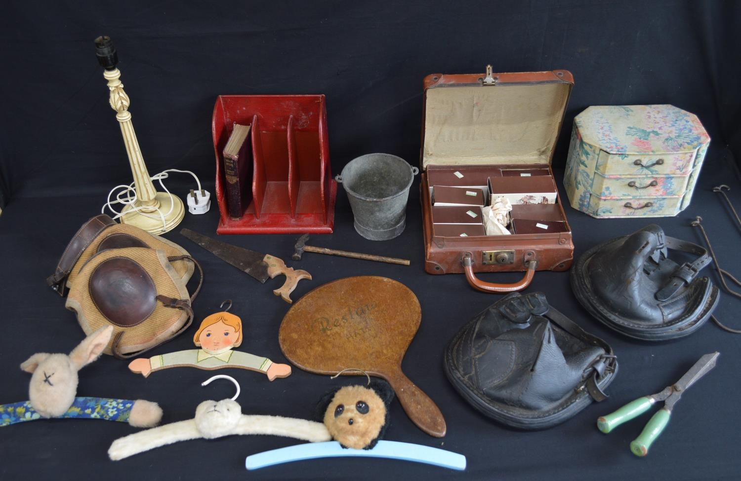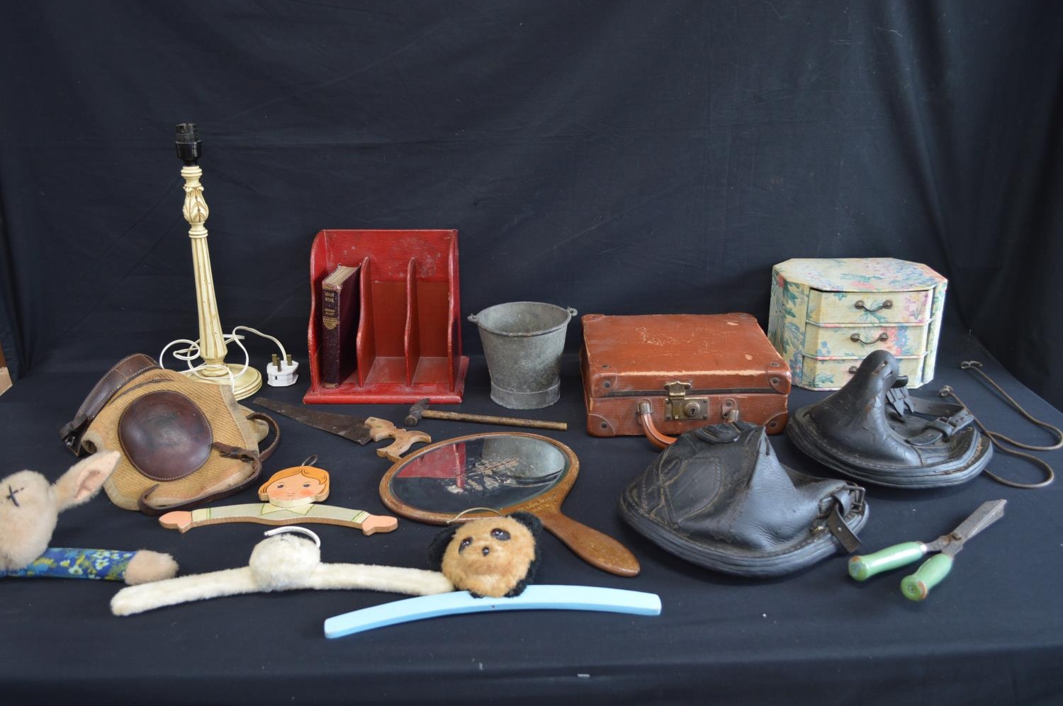 Collection of sundry items to include: two leather horse shoe lawn boots, coat hangers, hand mirror and pair of knee boats etc