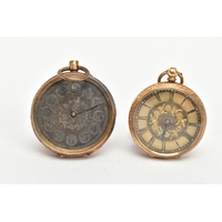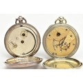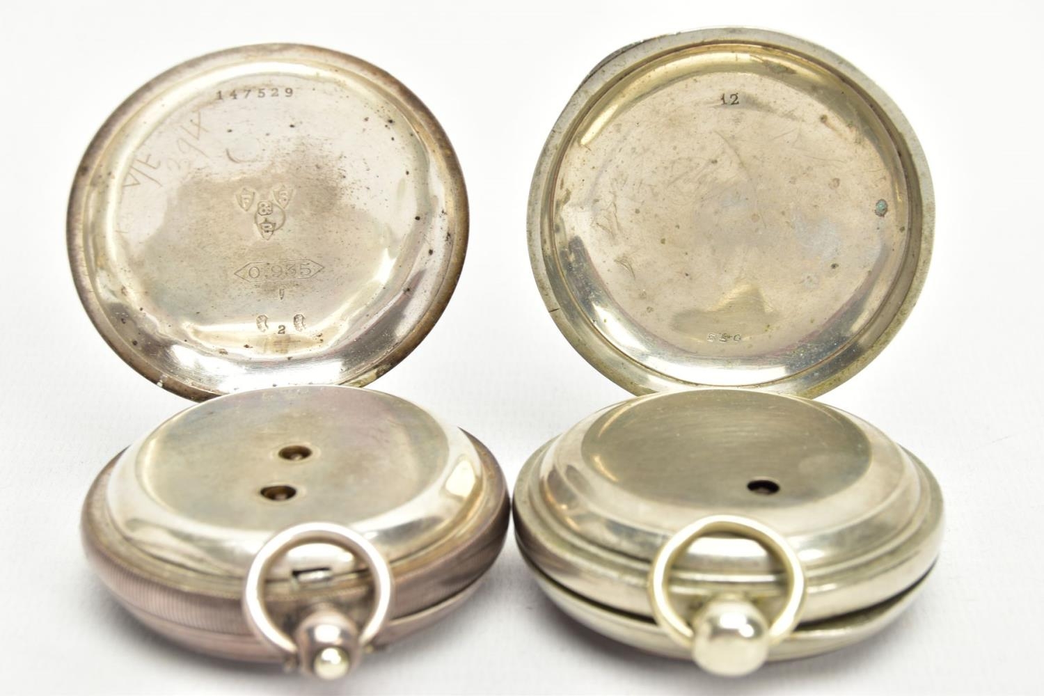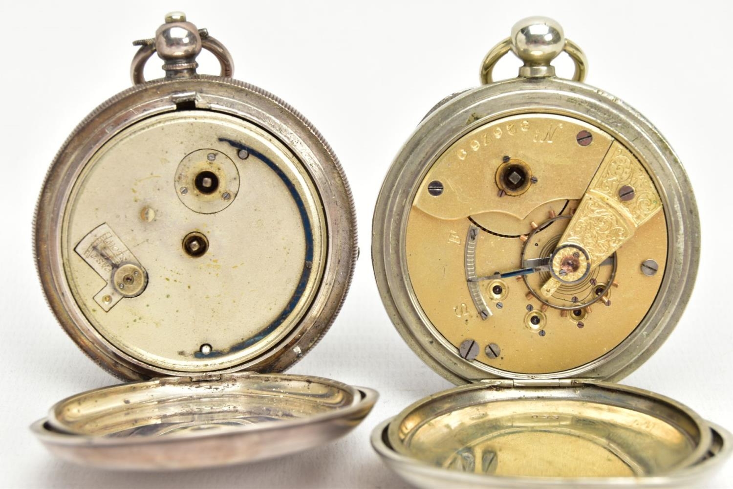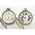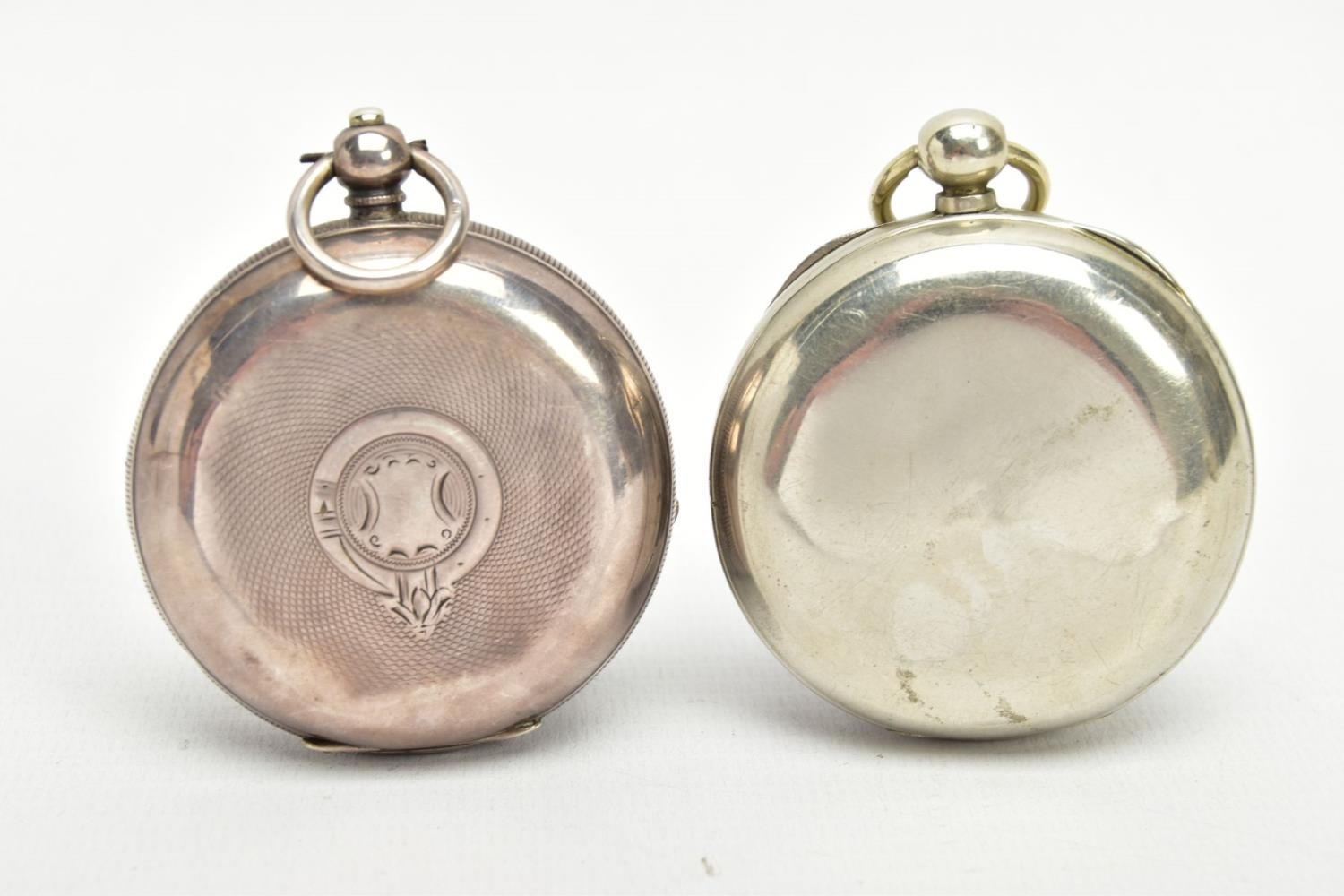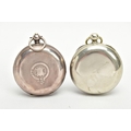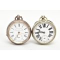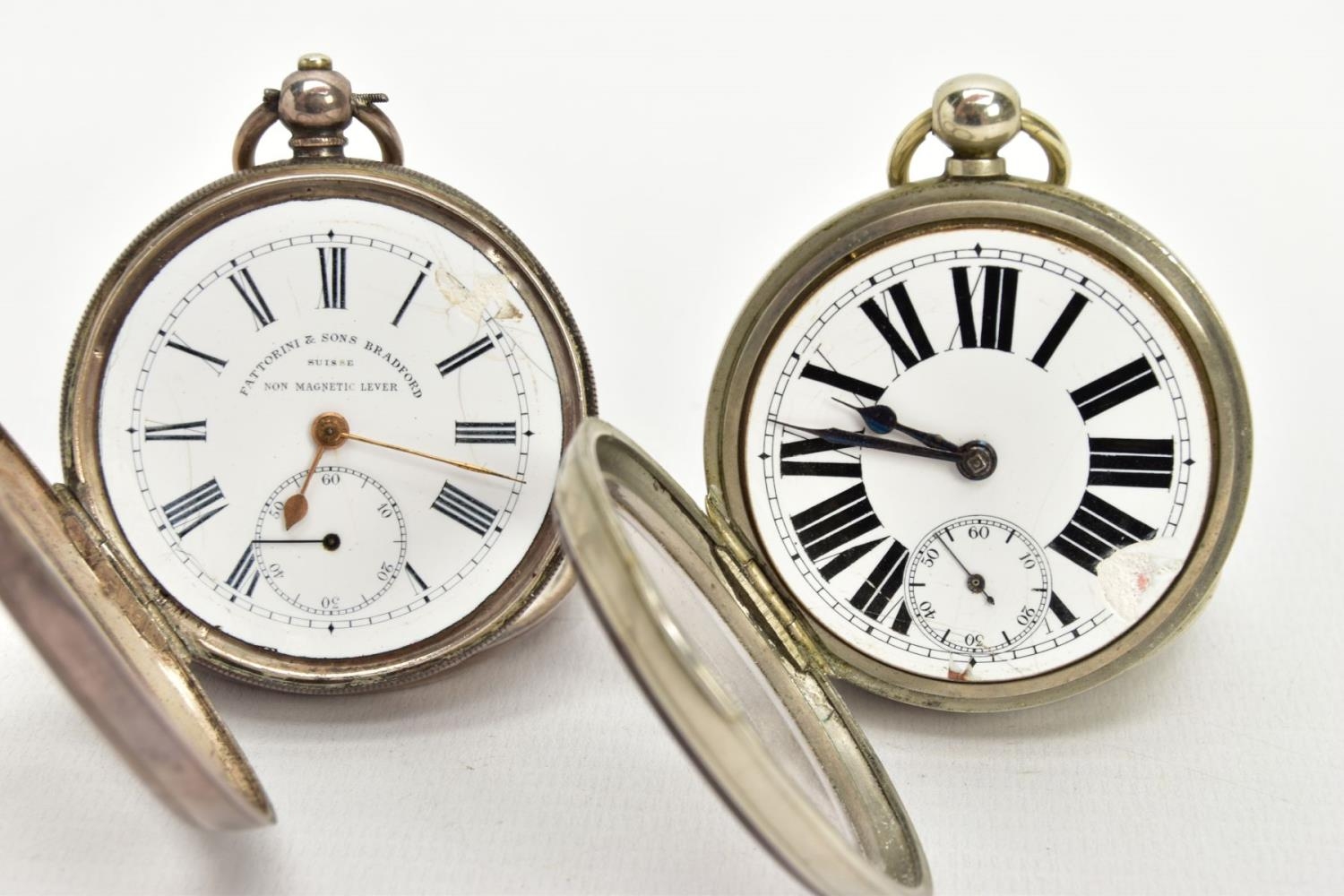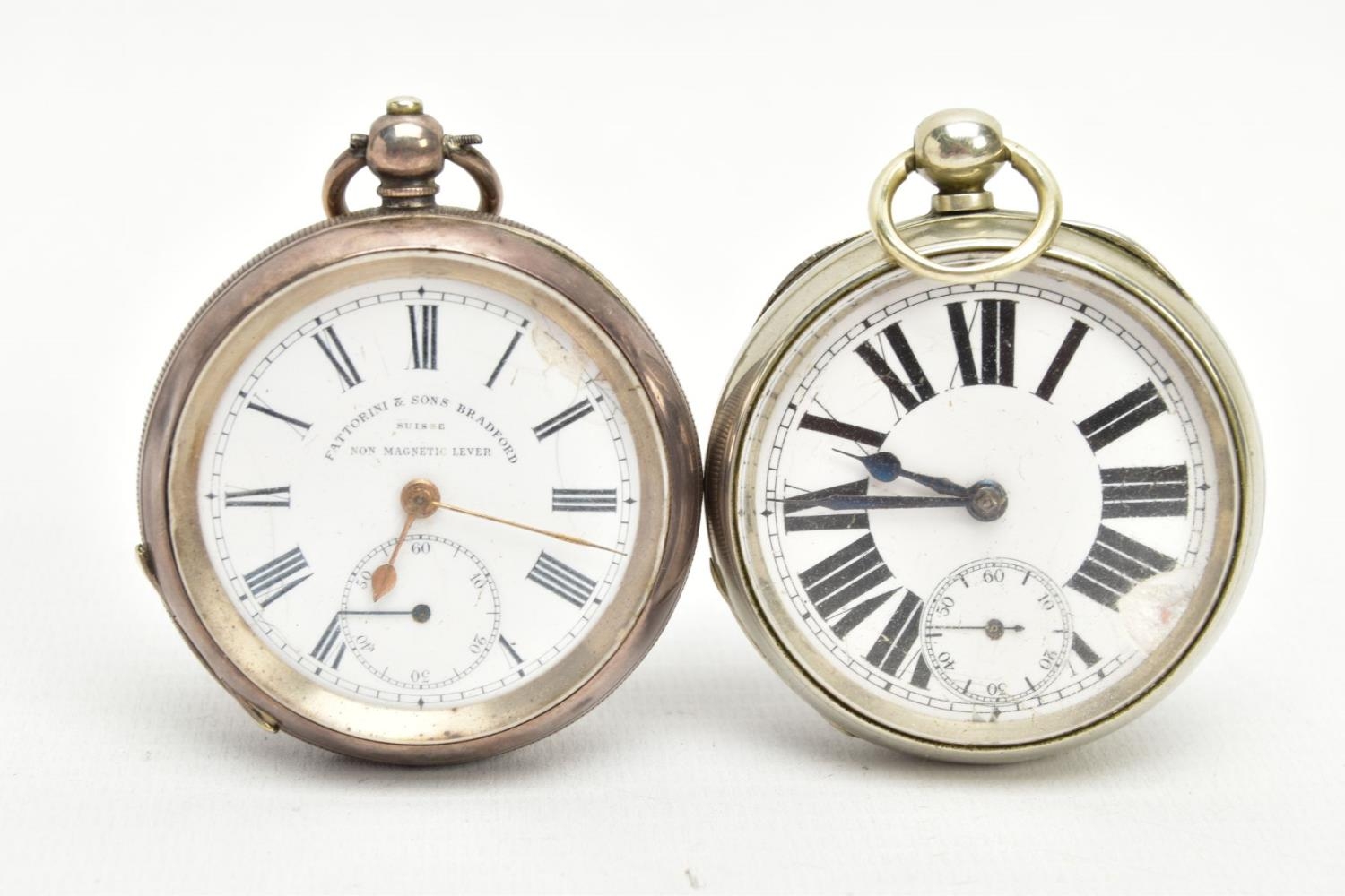 TWO OPEN FACE POCKET WATCHES, the first a white metal pocket watch with a white ceramic dial signed 'Fattorini & Sons Bradford', Suisse non-magnetic lever', Roman numerals, seconds subsidiary dial at the six o'clock position, gold tone hands, within an engine turned design case with a vacant cartouche, case back stamped 0.935 Swiss control marks 147529, approximate case width 54.5mm, the second with a white dial, Roman numerals, seconds subsidiary dial at the six o'clock position, blue hands, within a plain polished case, case back unmarked, approximate case width 54.5mm (condition report: some hair line cracks and chips to both the dials, some small dinks to the cases, both non-running, slight tarnishing to both)