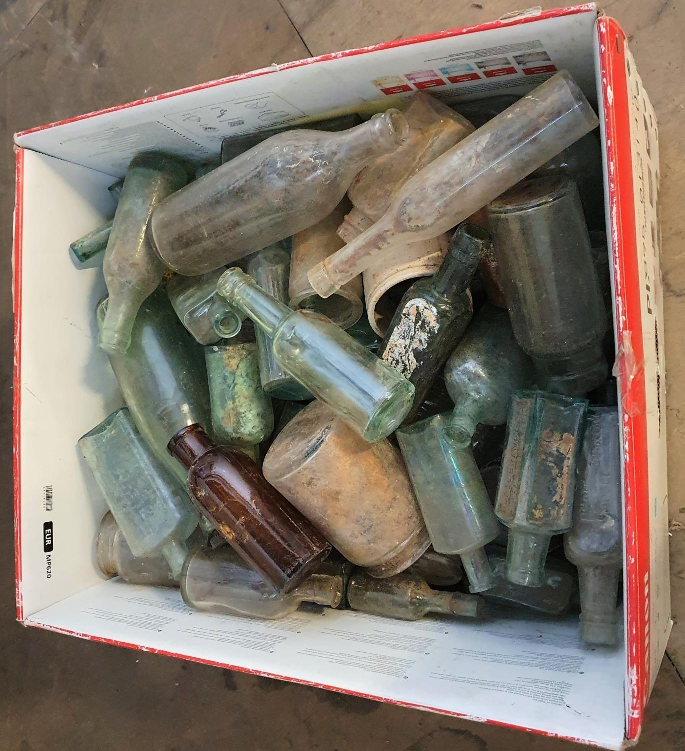 Large box, full of assorted antique glass bottles (Qty)