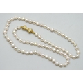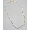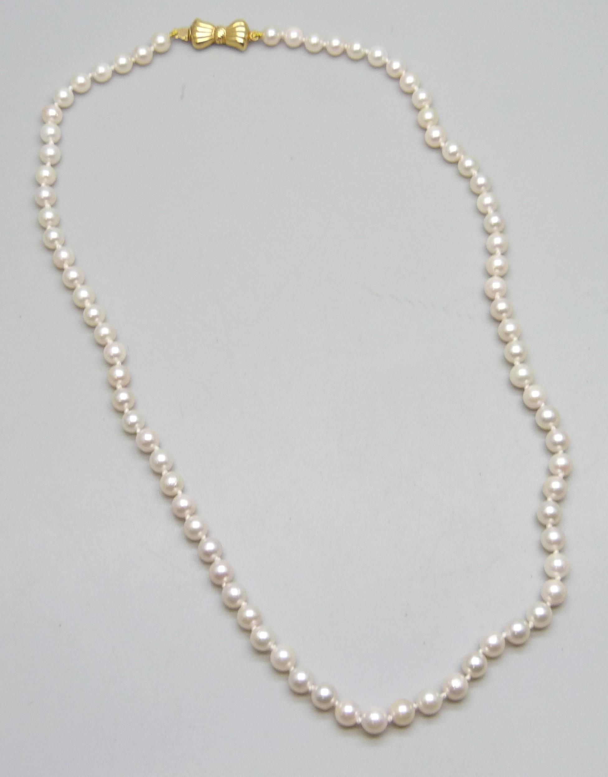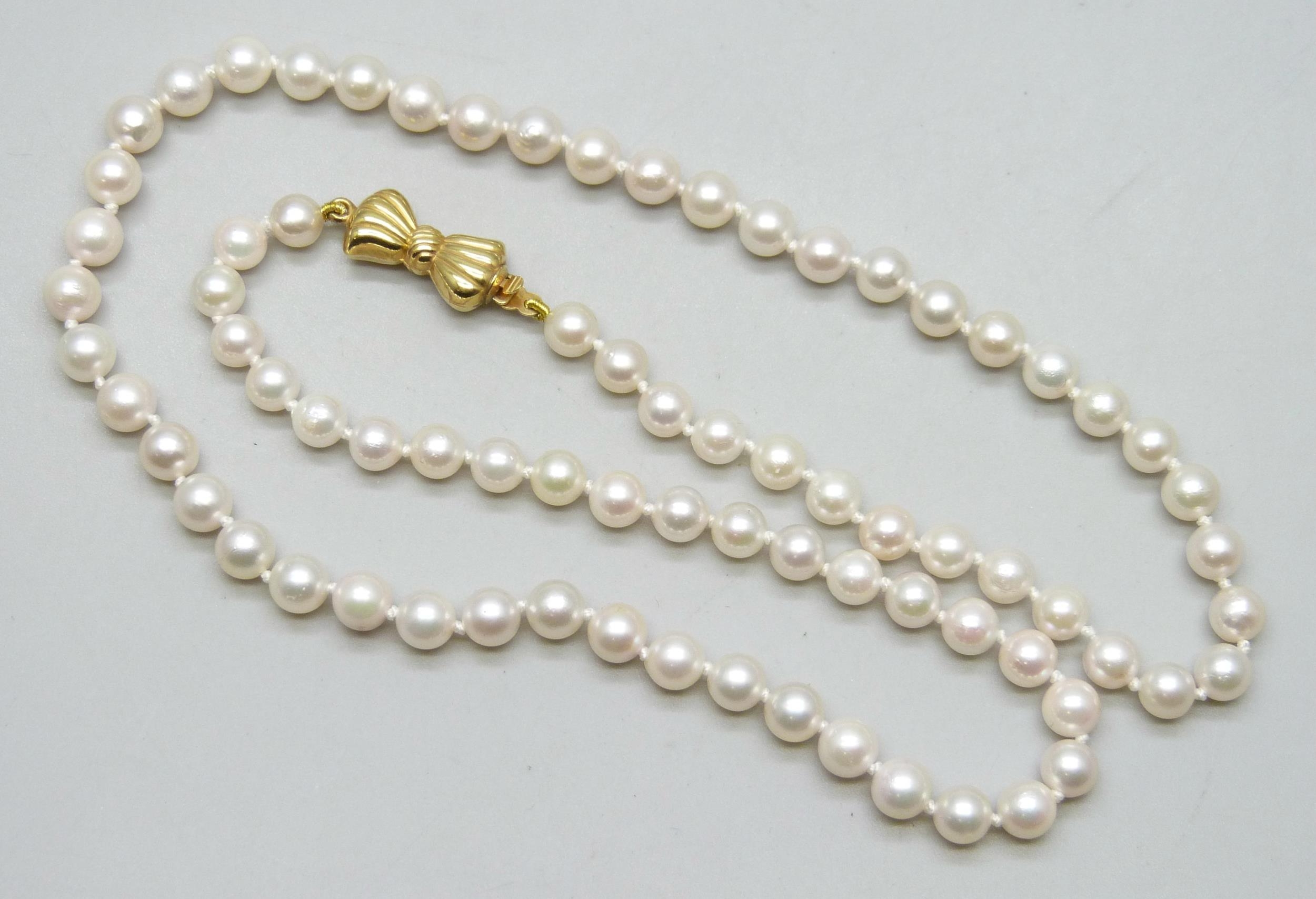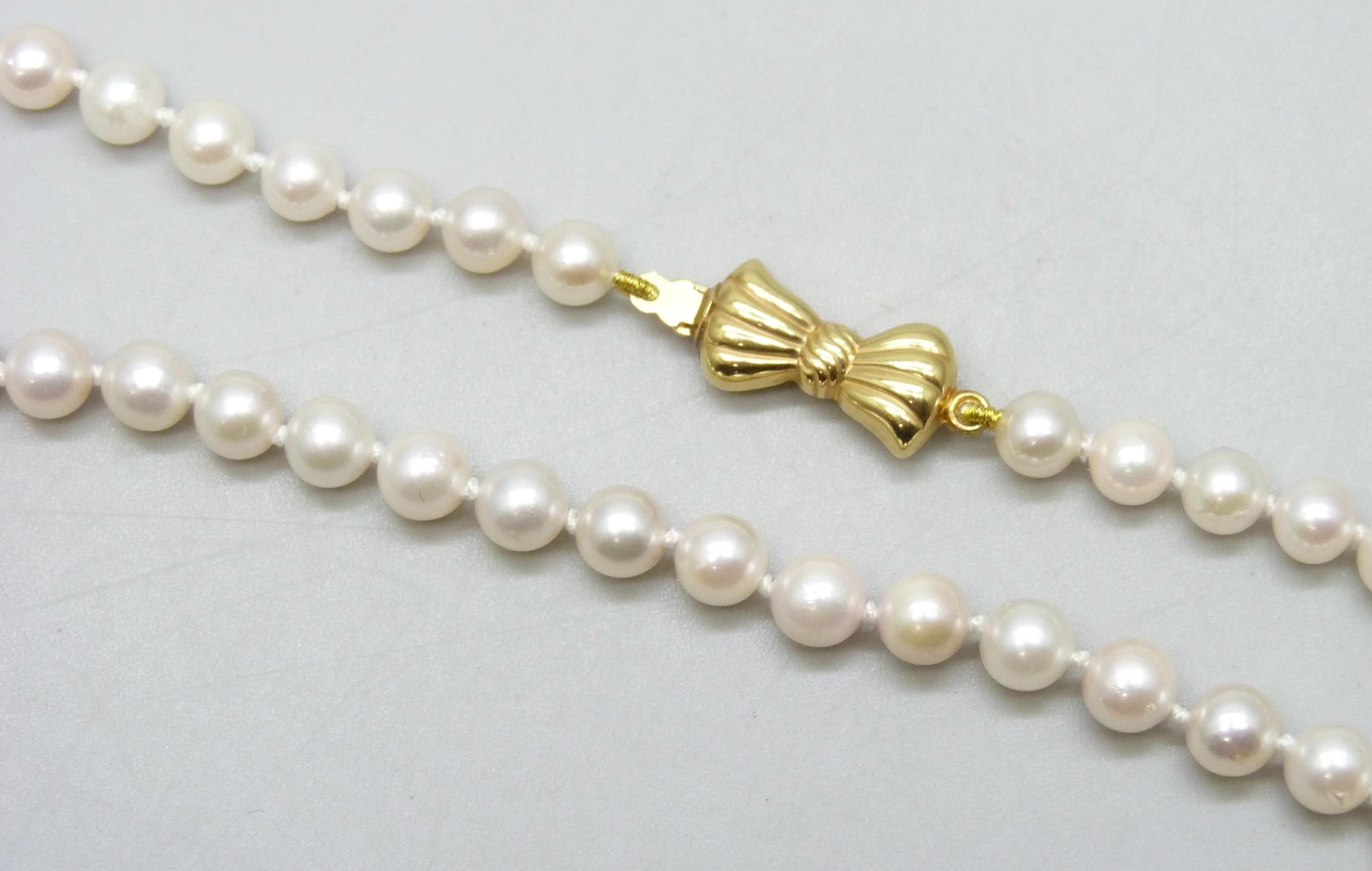A pearl necklace with a 9ct gold bow clasp, 15.7g, 46.5cm
