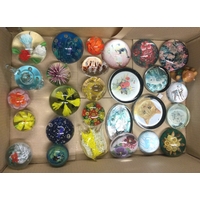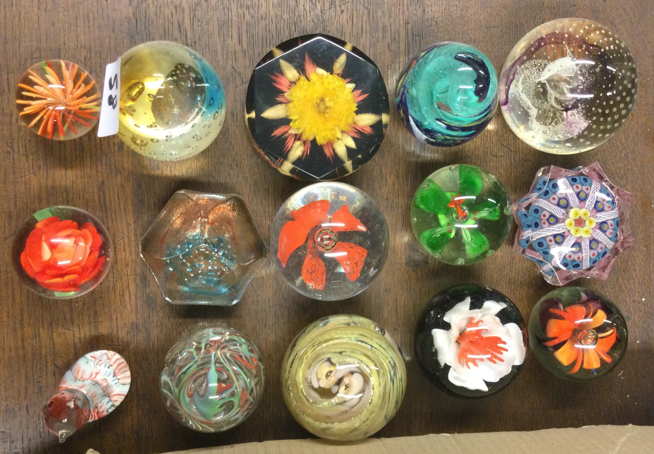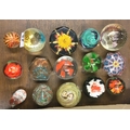 A collection of glass paperweights.