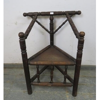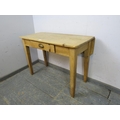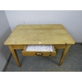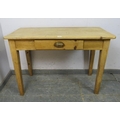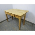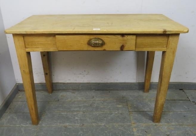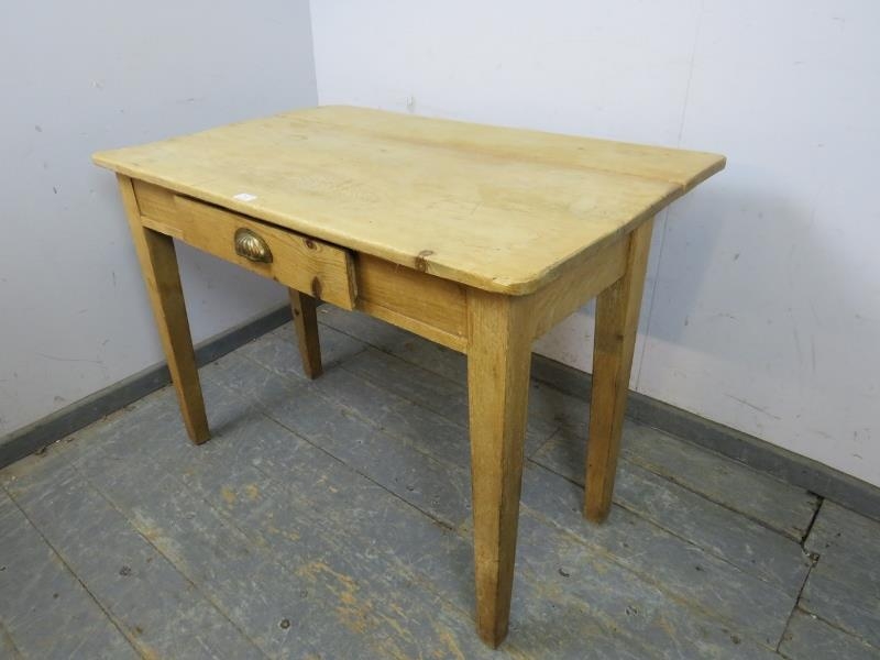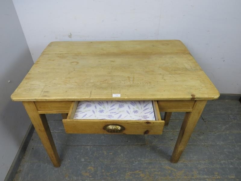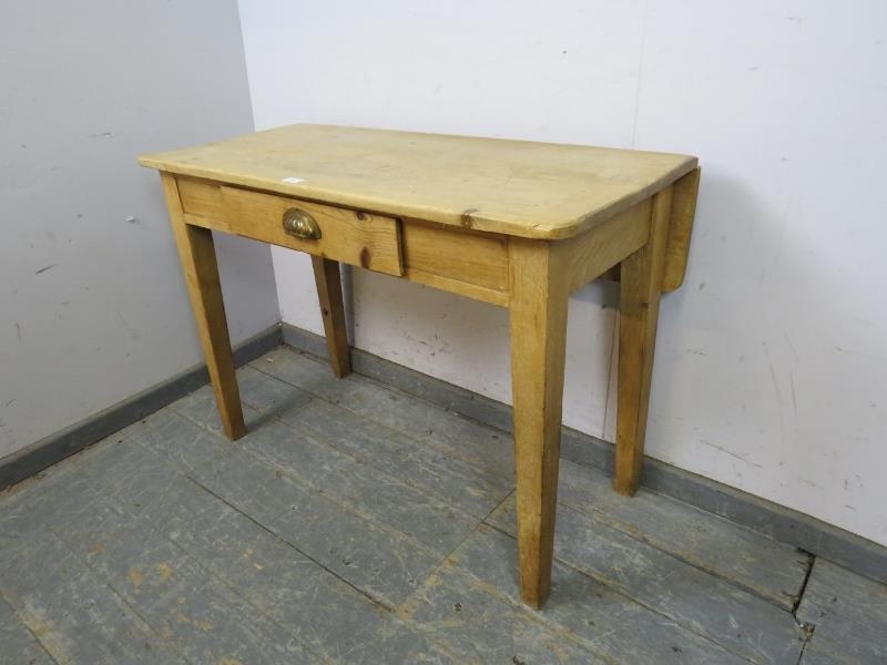 An antique stripped pine side table, with drop-leaf, housing a single drawer with brass scalloped handles, on tapered square supports.