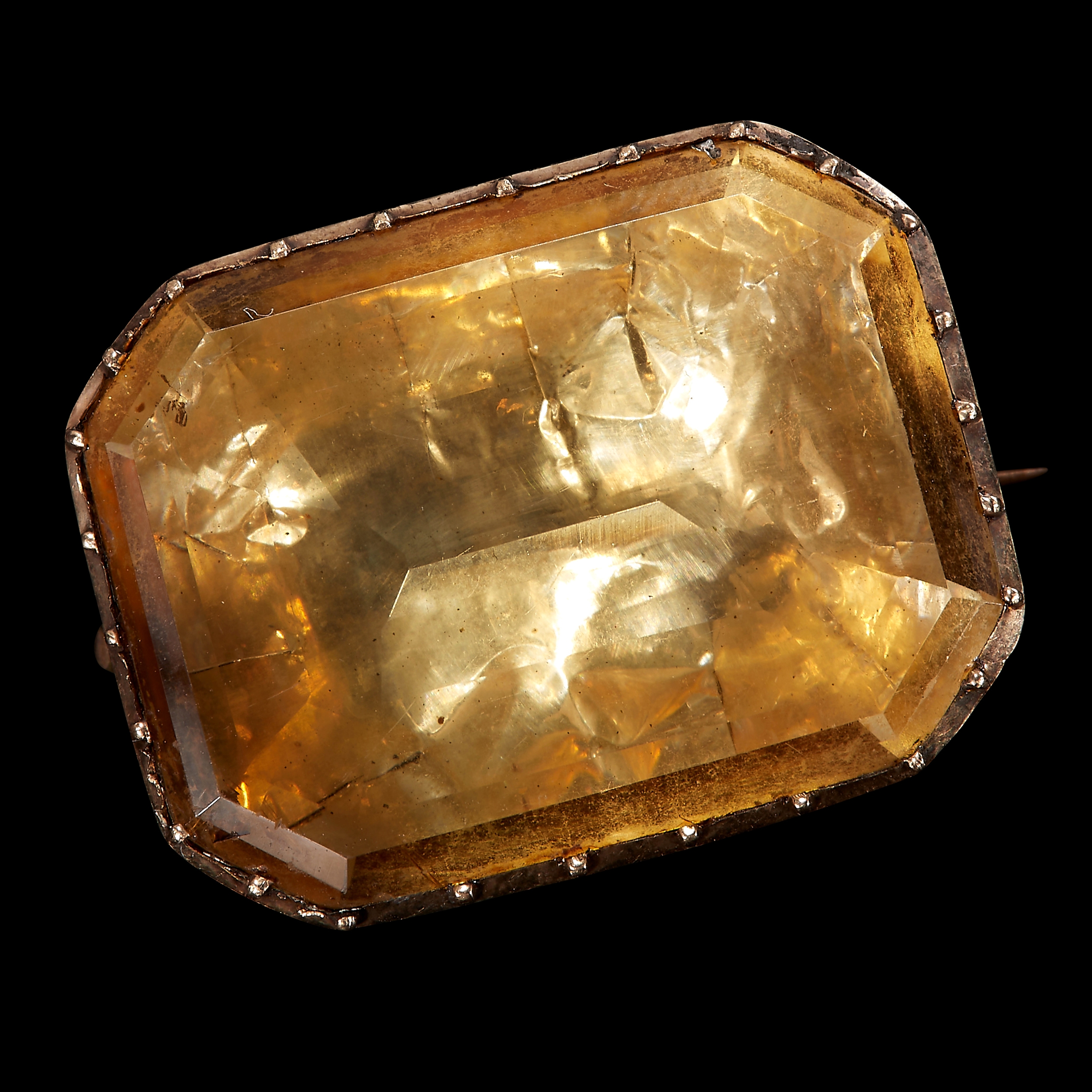 IMPRESSIVE ANTIQUE CITRINE BROOCH, Set with a large rectangular foiled back citrine. W. 2.8 cm. 9.2 grams.