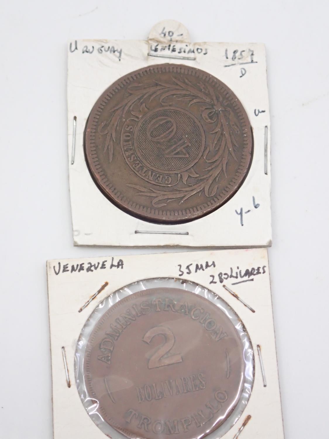 A collection of coins from Uruguay and Venezuela