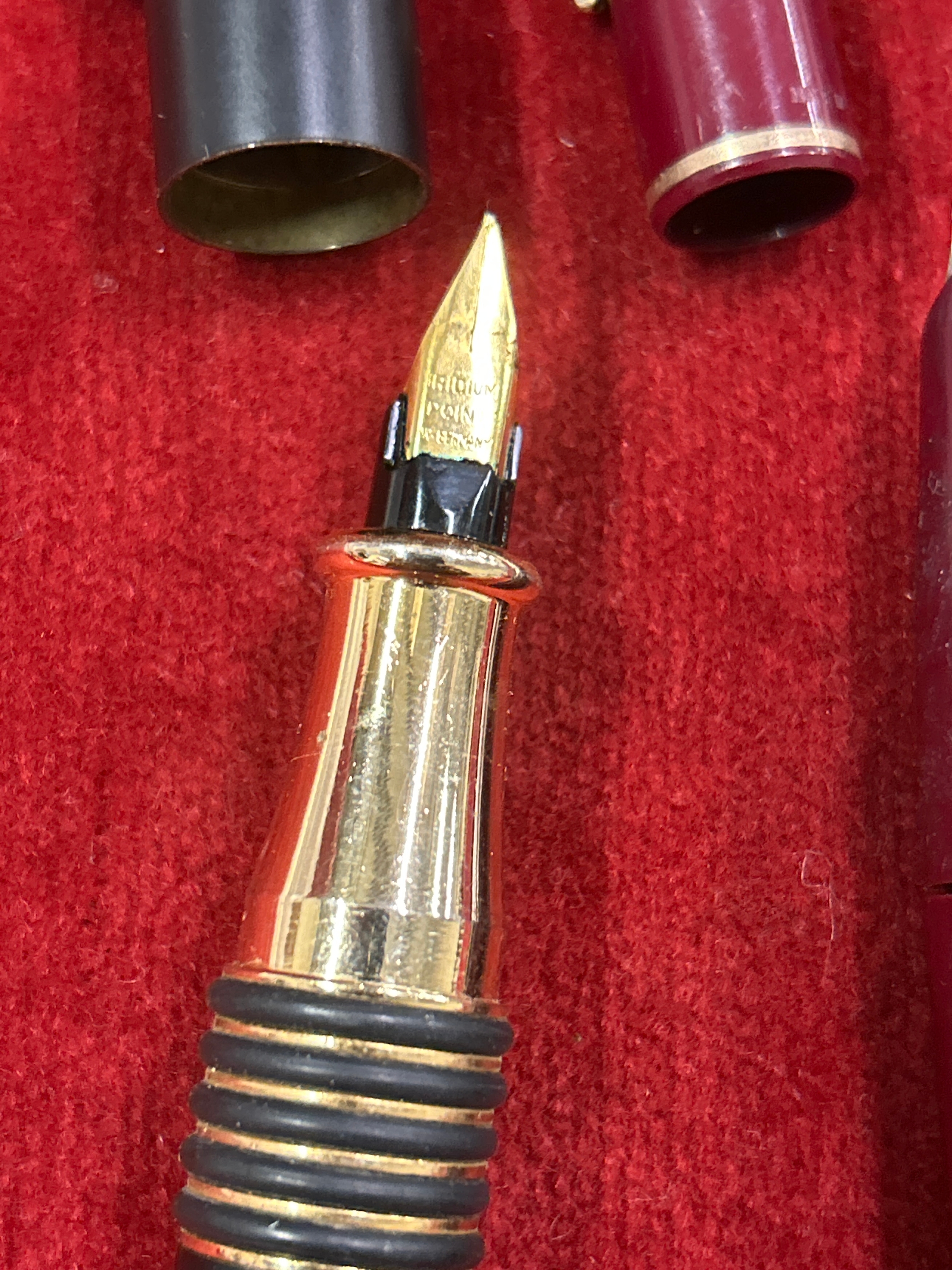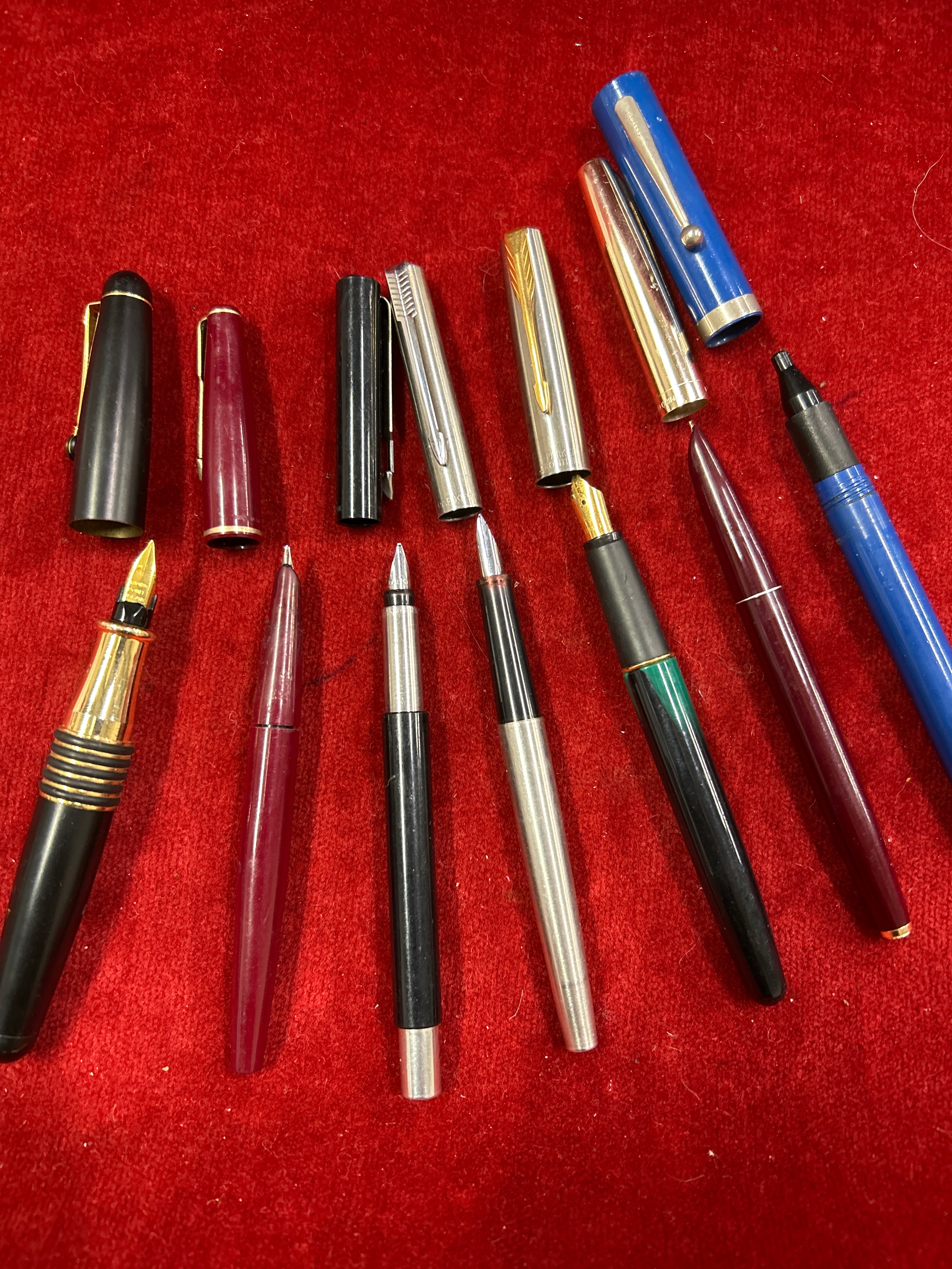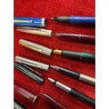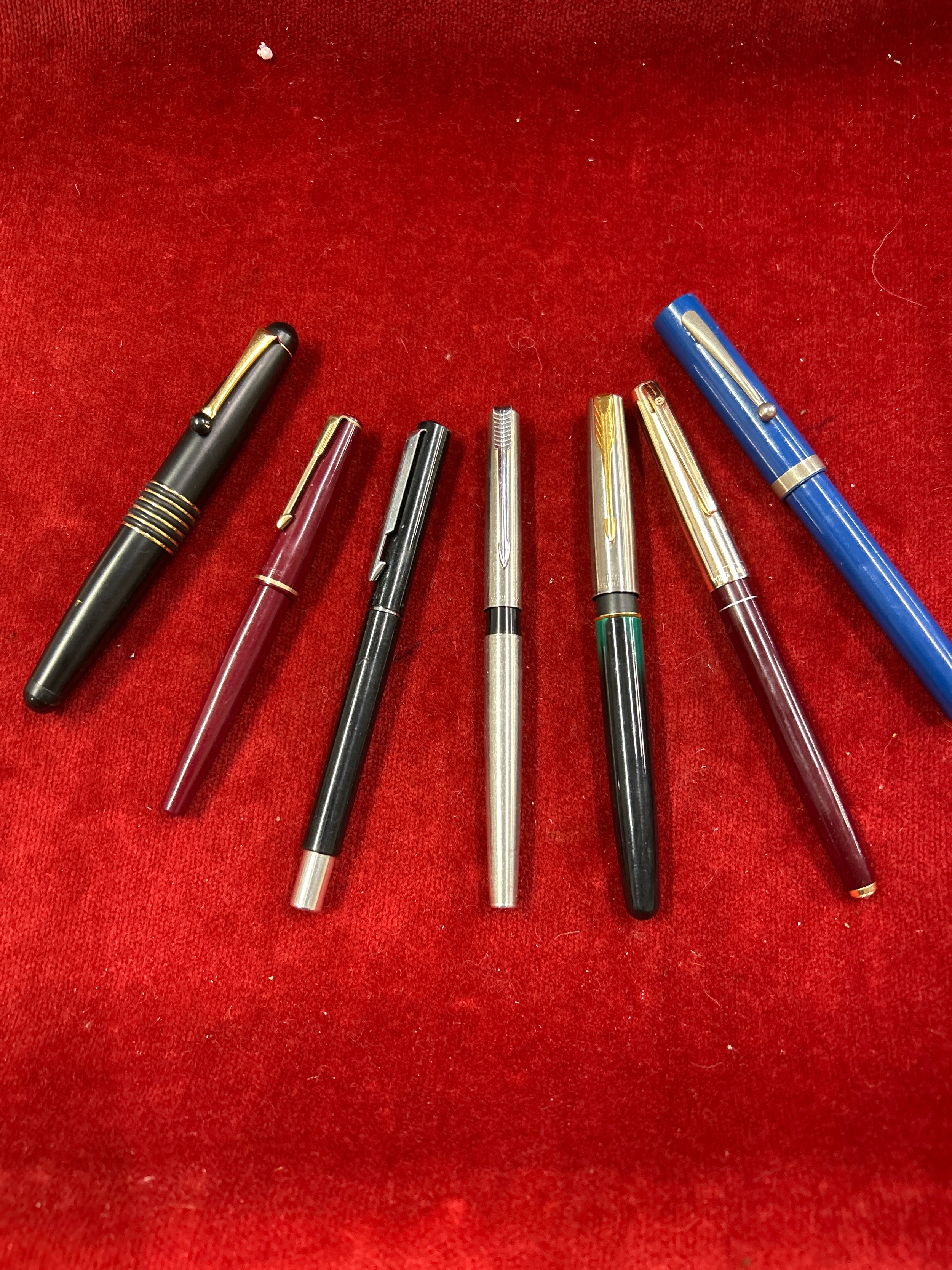 Six fountain pens including four by Parker a fat egg pen probably by Colibri of London, the nib marked West Germany
