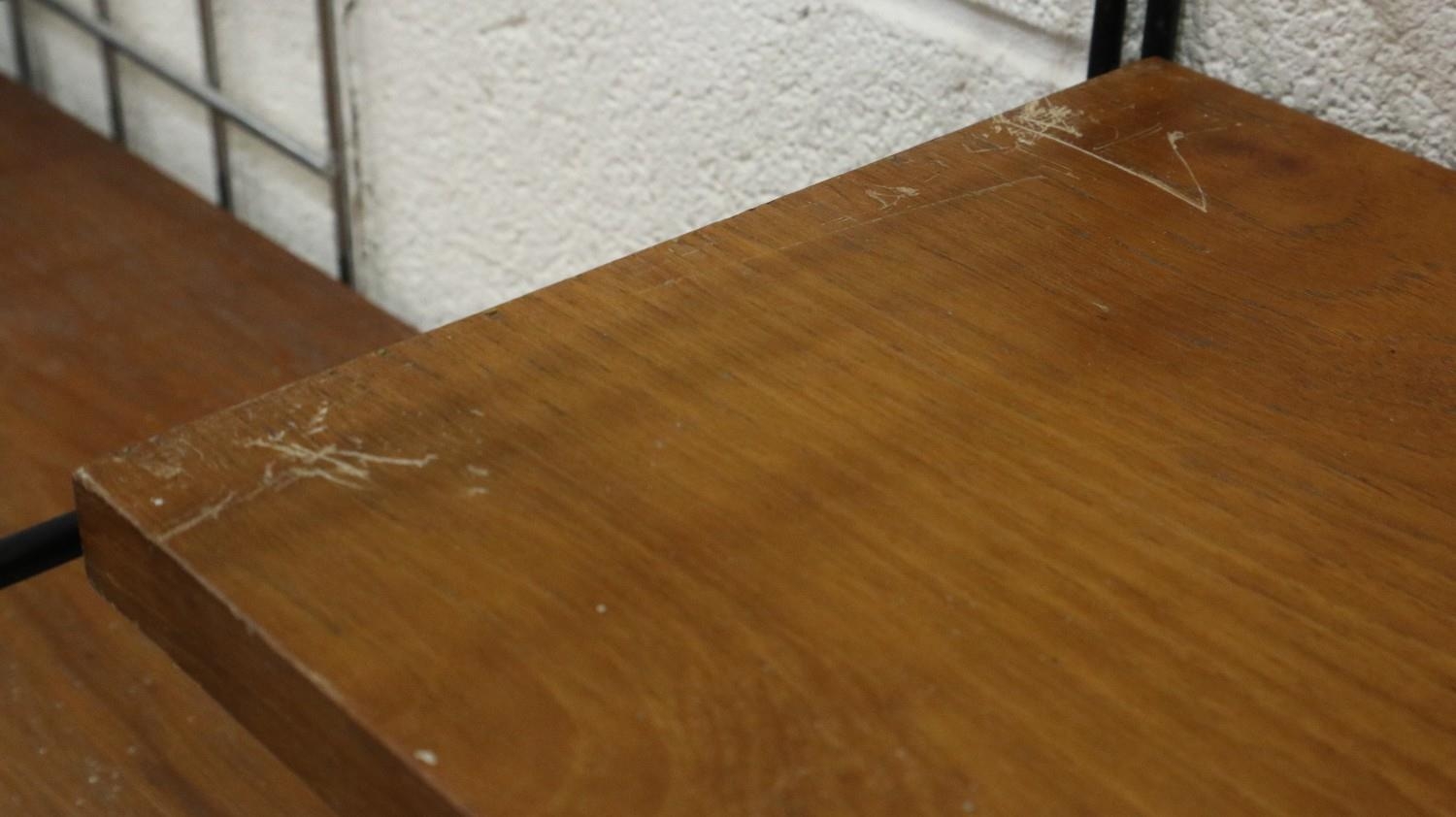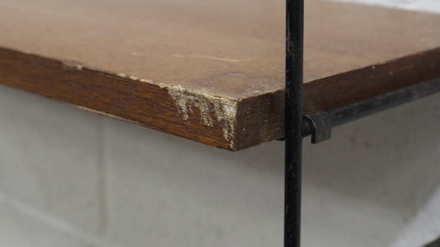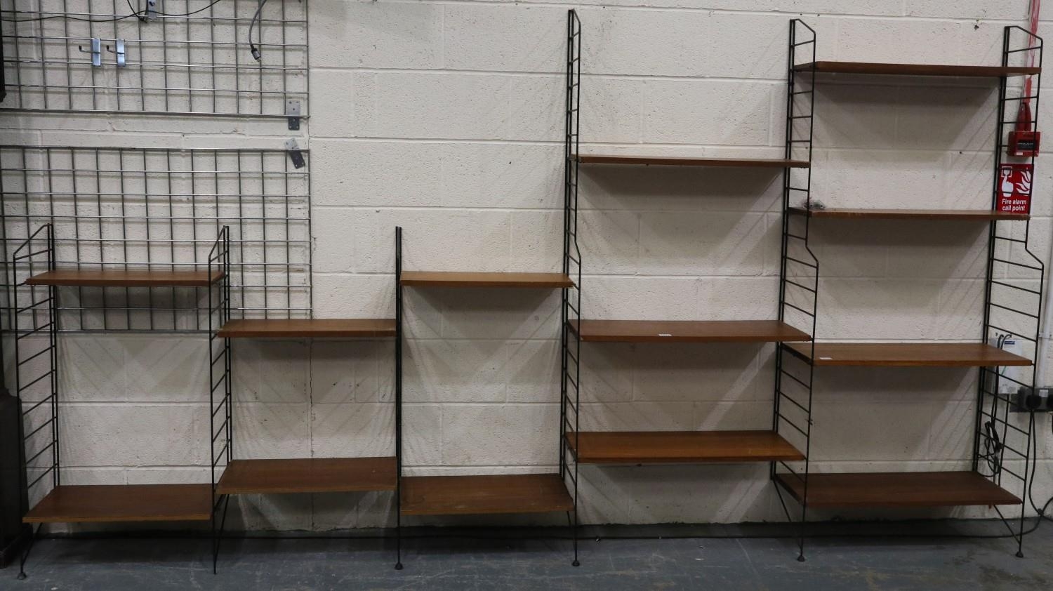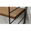 Mid 20th century modular bookcase in the manner of Ladderrax, comprising six upright supports and shelves of varying depth and length. Not available for in-house P&P