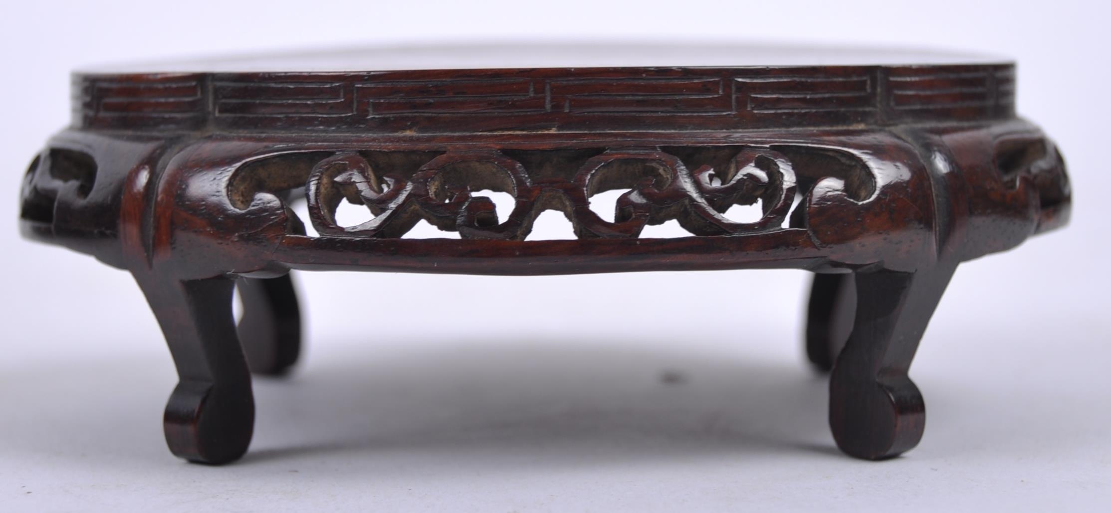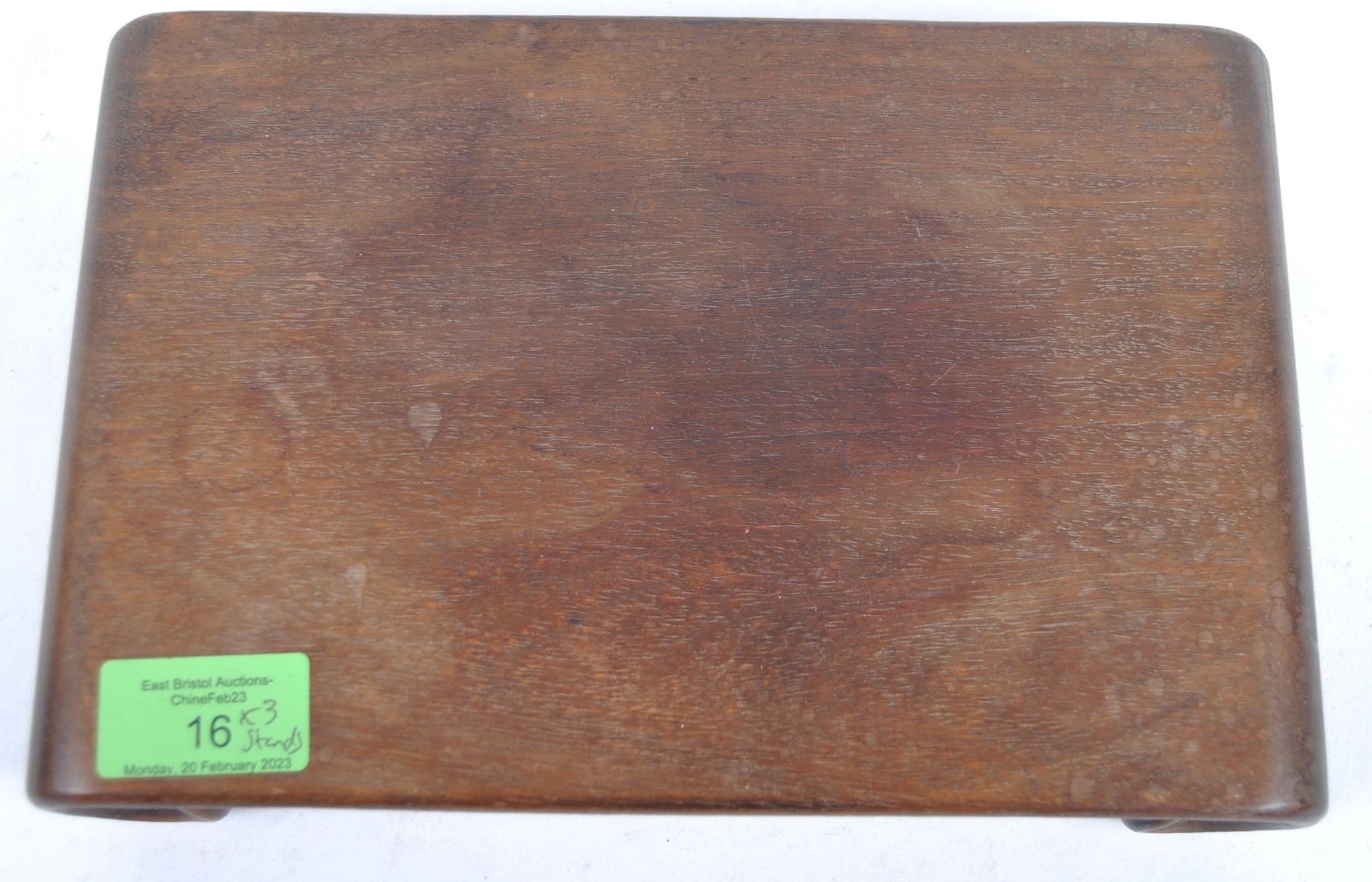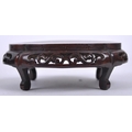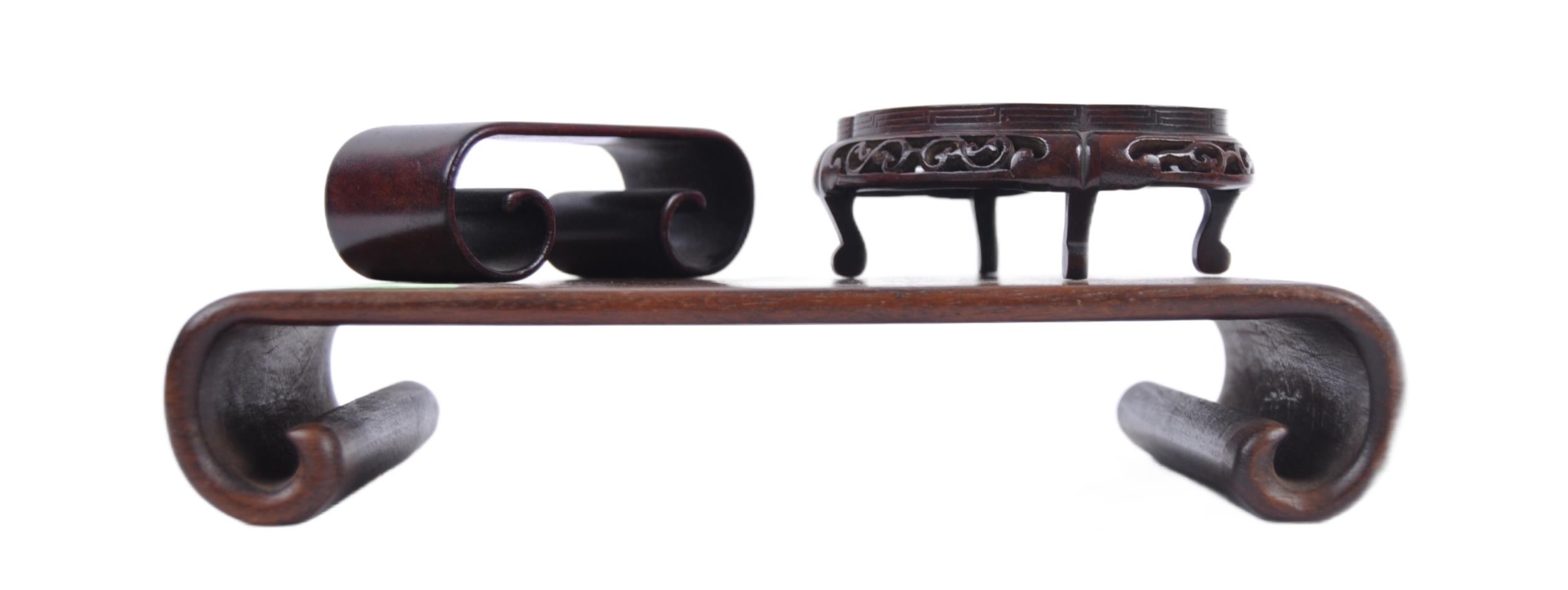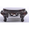 A group of three Chinese carved hardwood stand dating from the 19th Century to include a large stand on two scroll legs, a pierced stand and another scroll stand. Measures approx; 25cm wide.