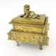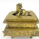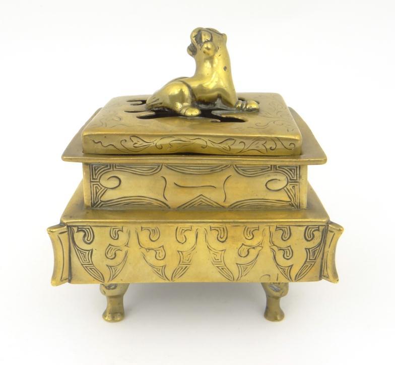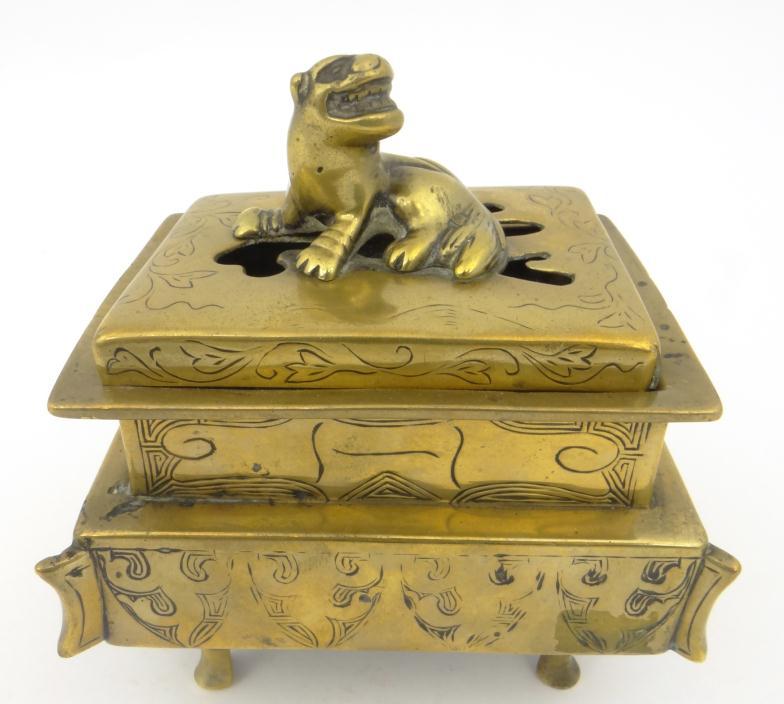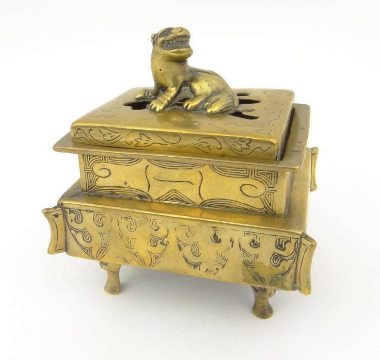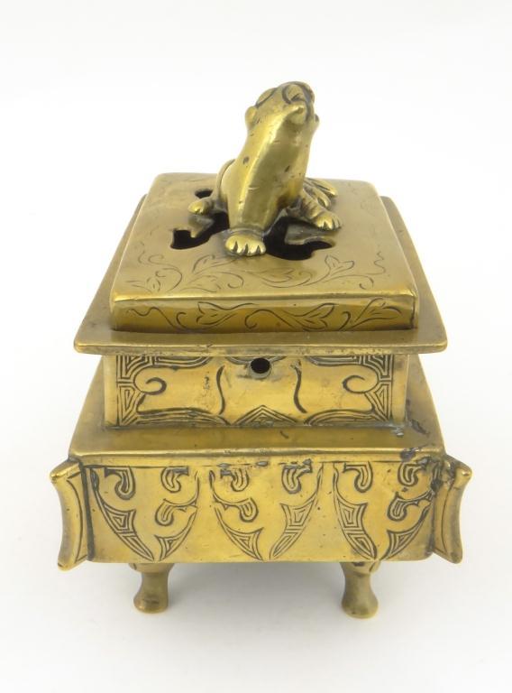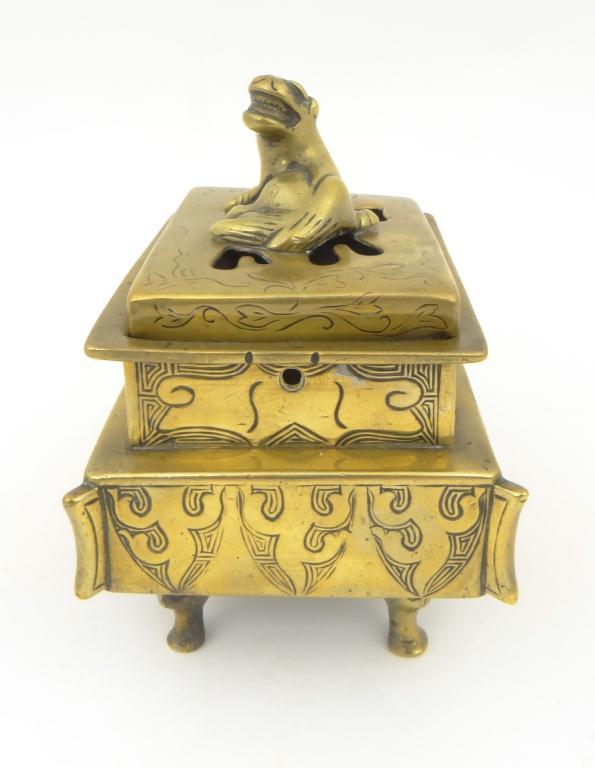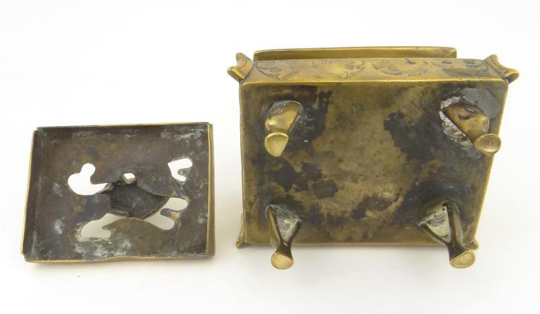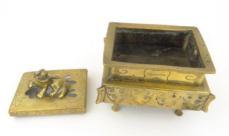 Chinese brass censer and cover of rectangular form with animalia knop and chased decoration, 12cm in length