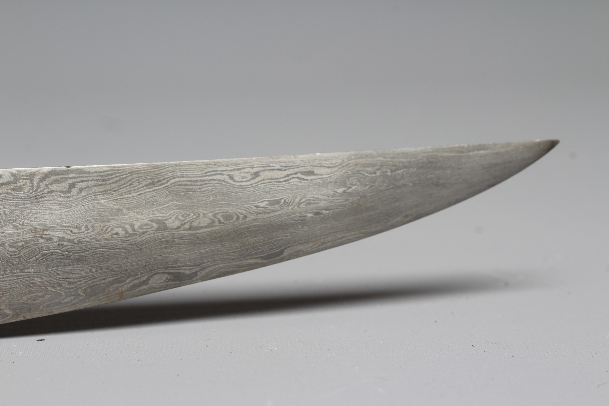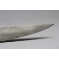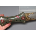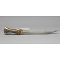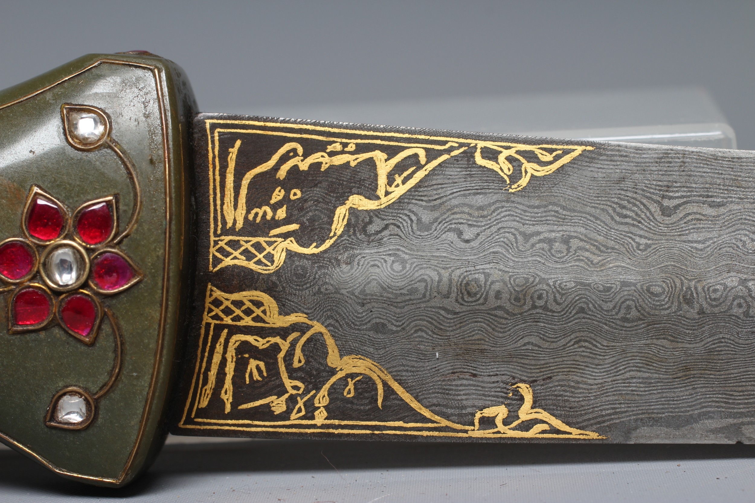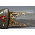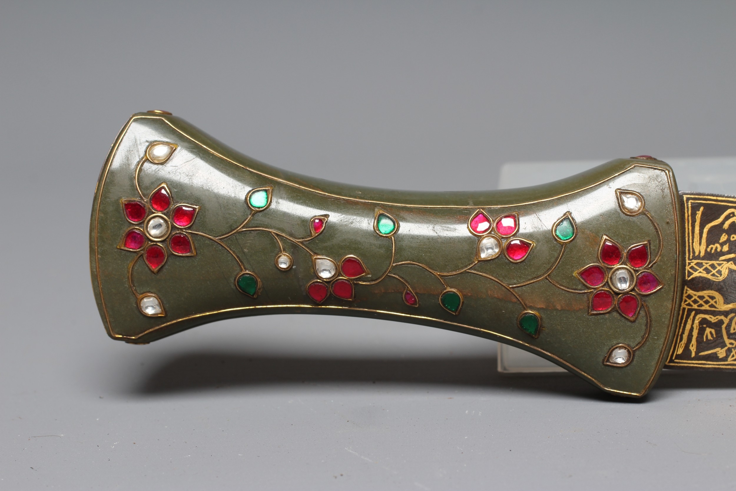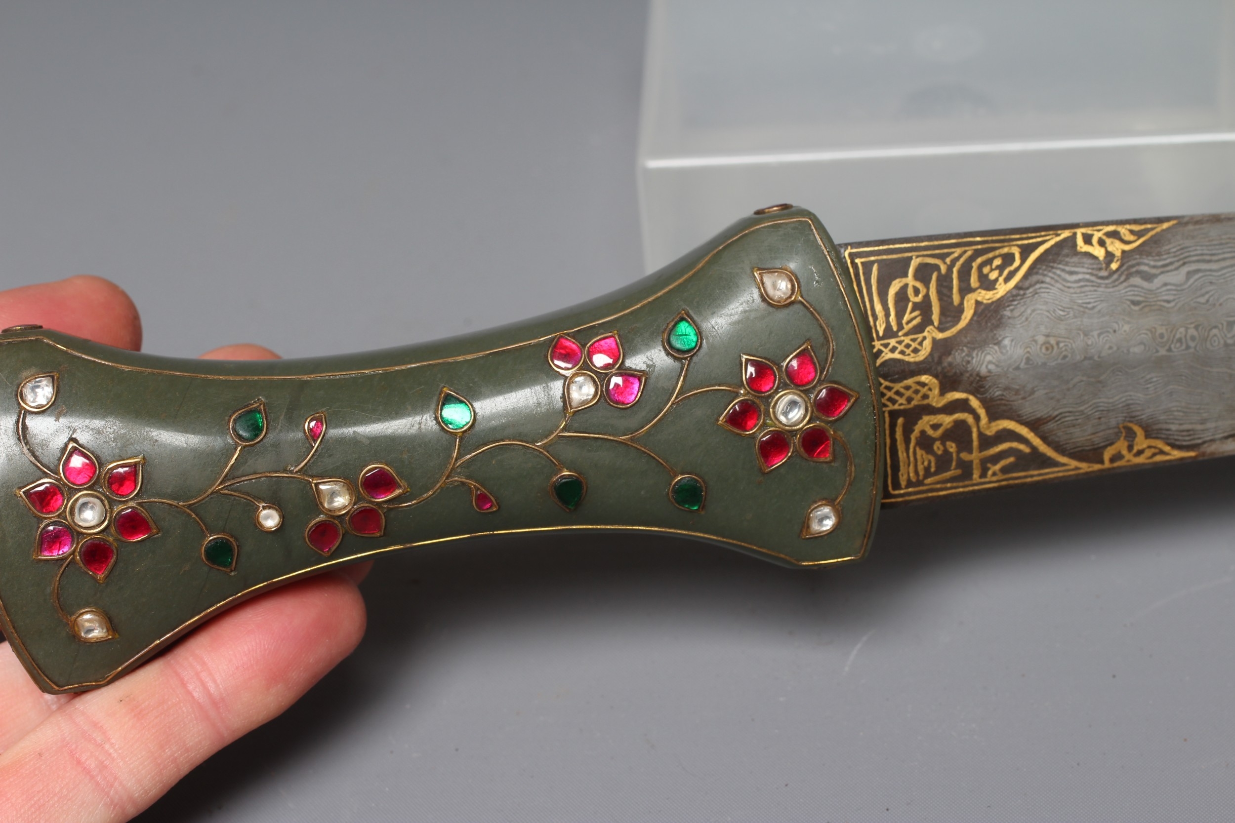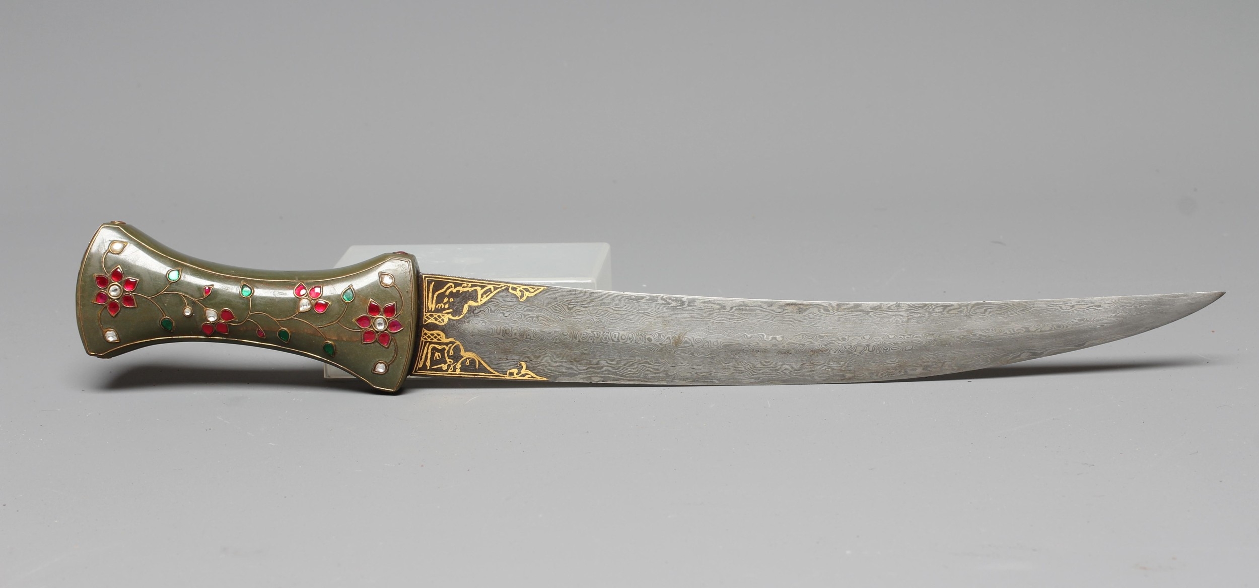 AN INDIAN KHANJAR DAGGER, the 11 1/4" curved watered steel blade inlaid with gilt metal, and nephrite crystal waisted grip inlaid with gilt wire and paste flowers, 16 1/4" long