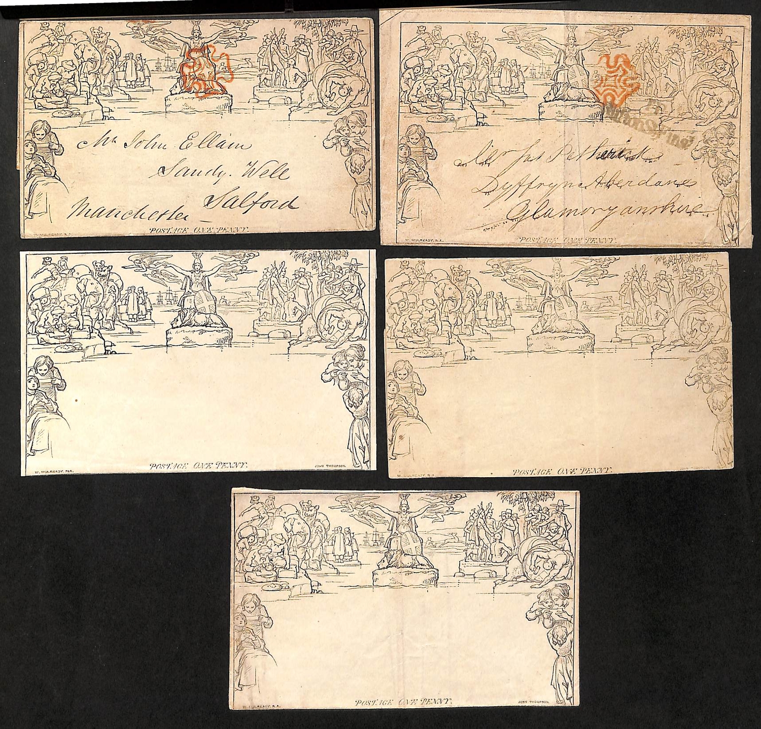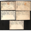 1840 (July) 1d Lettersheets, stereo A138 used from London to Wales and stereo A31 used from Warrington to Salford both cancelled by red Maltese Crosses, 1d lettersheet stereo A23 and 1d envelopes stereo A158 and A165 unused, the first used lettersheet with two vertical folds, otherwise fine. (5).