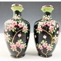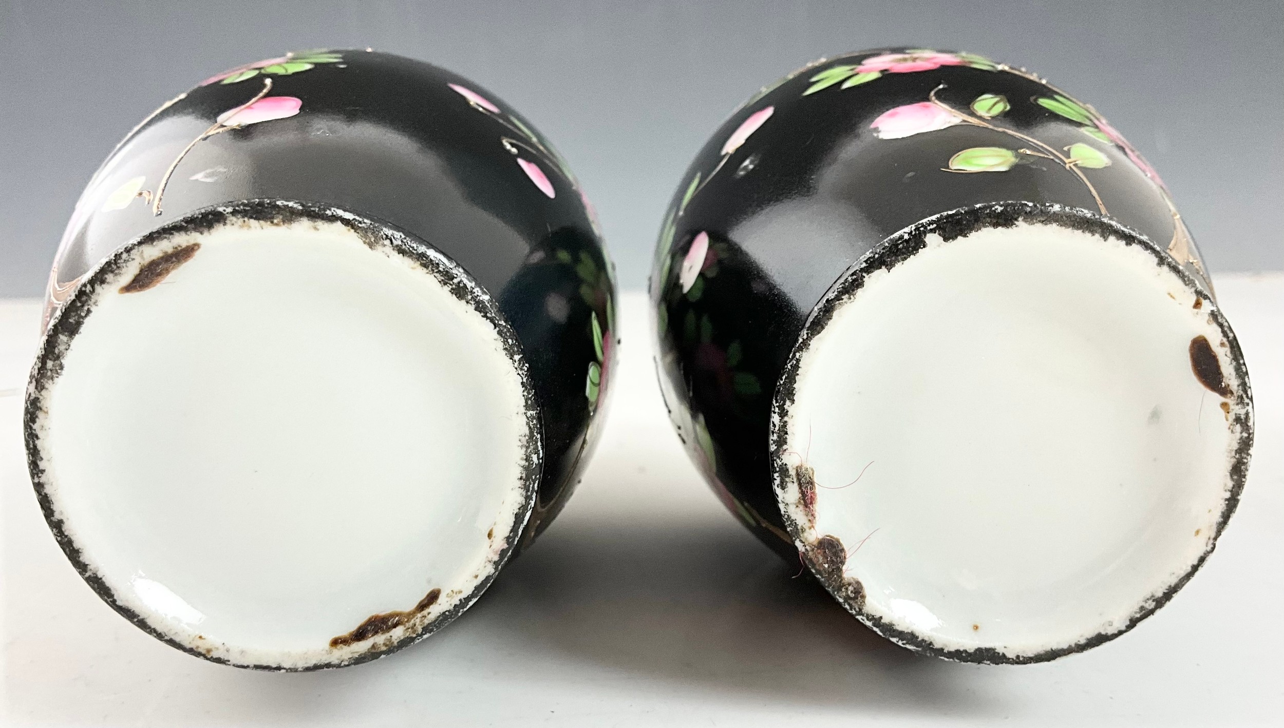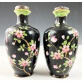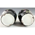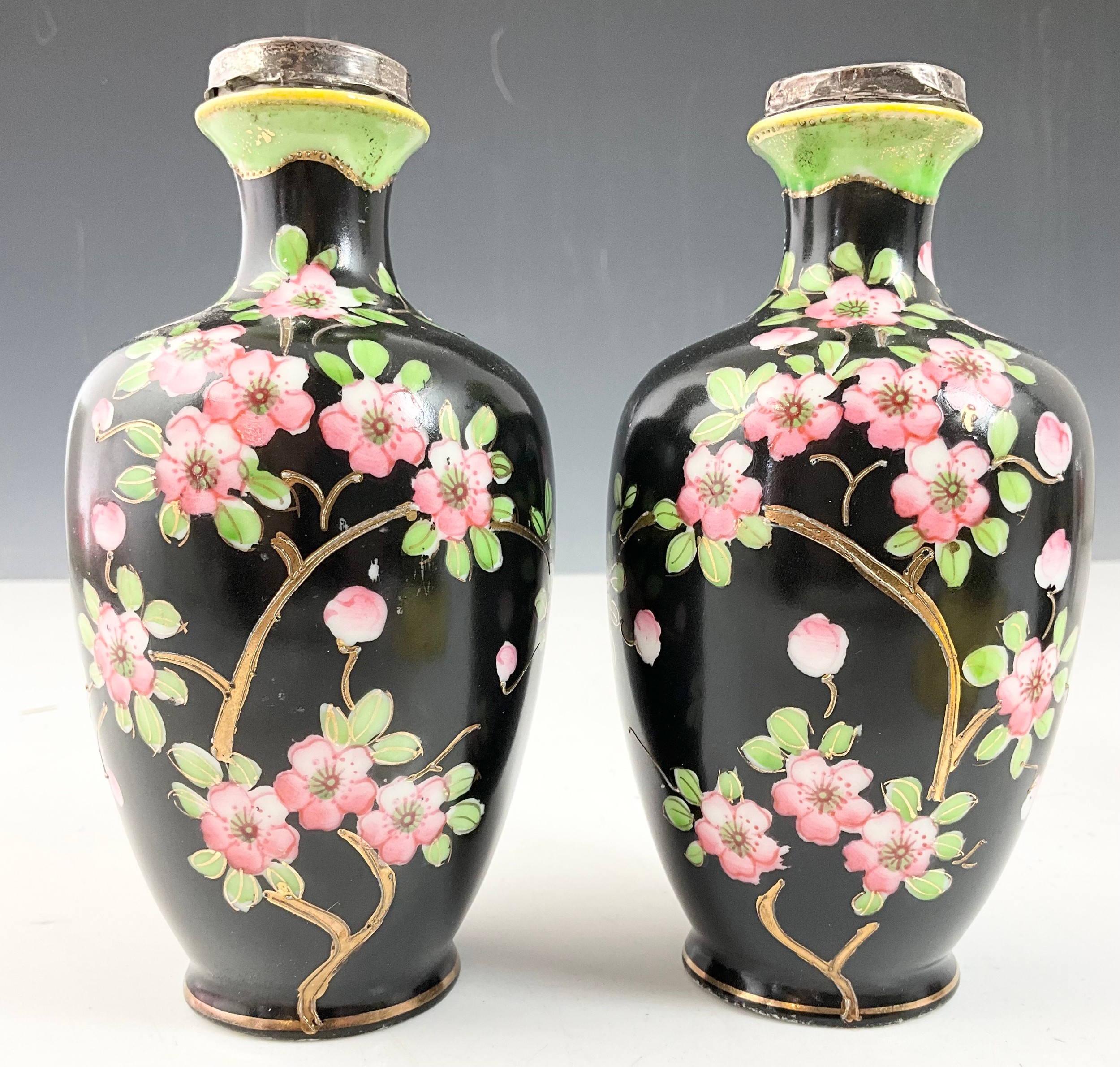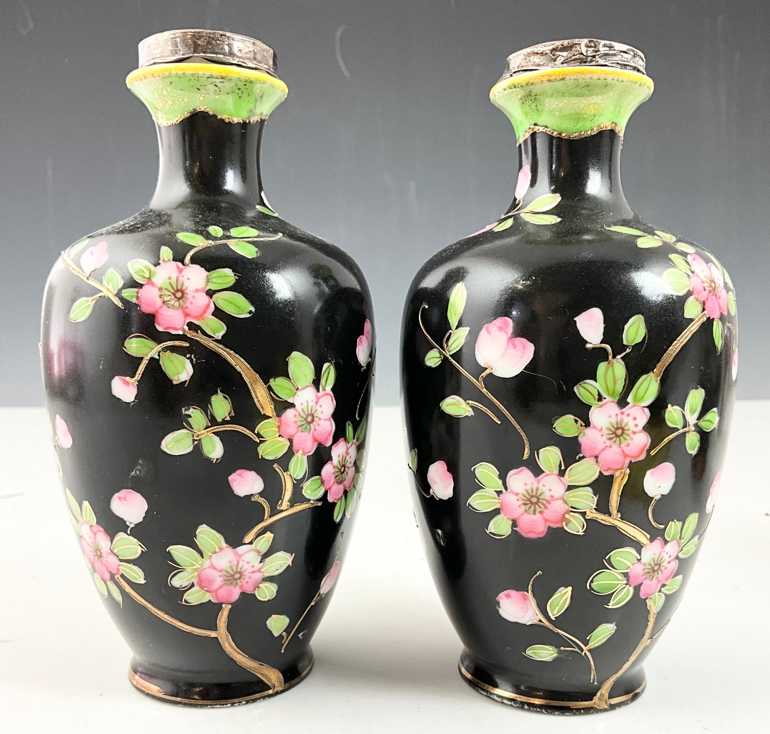 PAIR OF BLACK GROUND VASES WITH FLORAL DECORATION & SILVER COLLARS 15cm