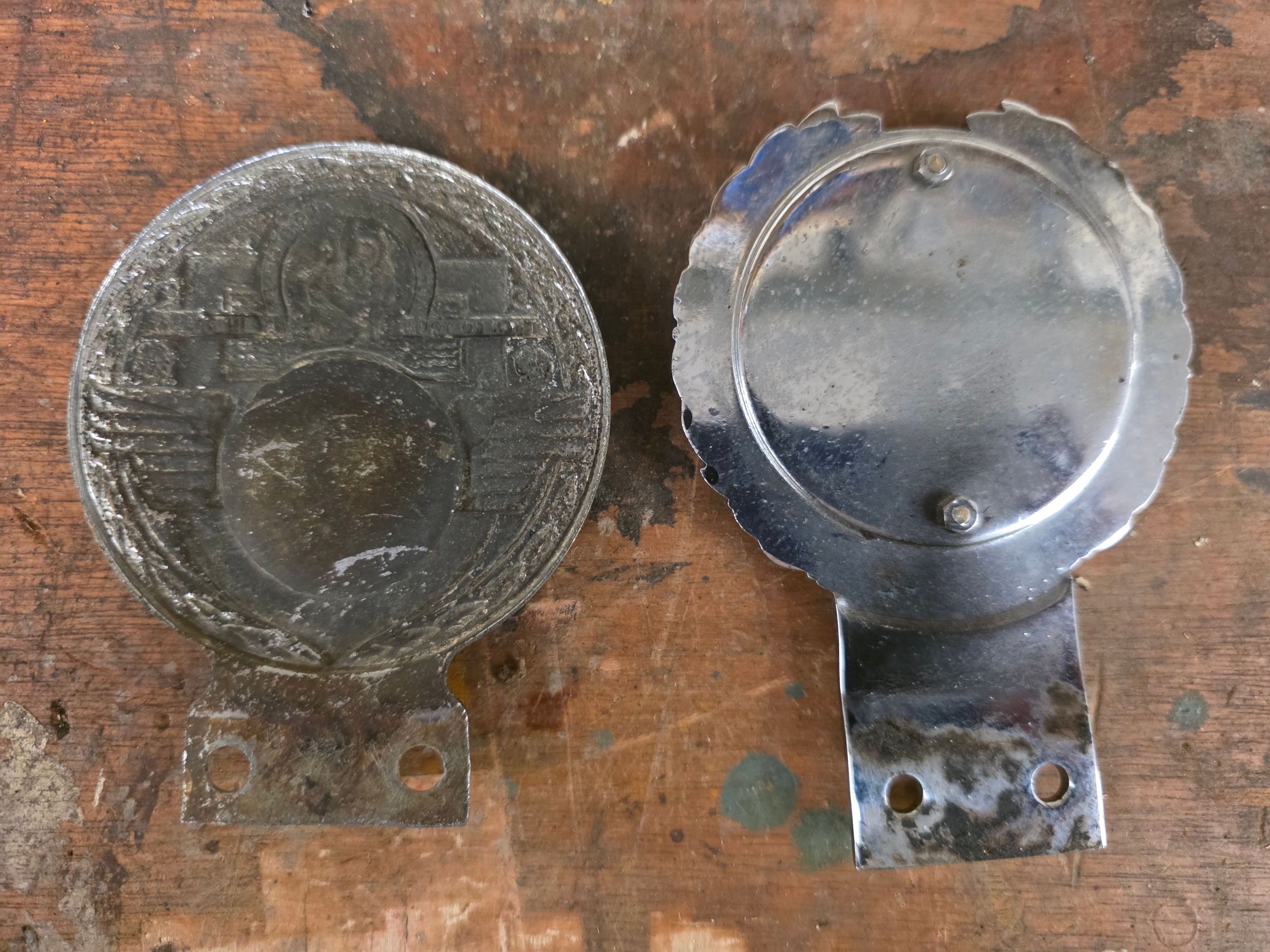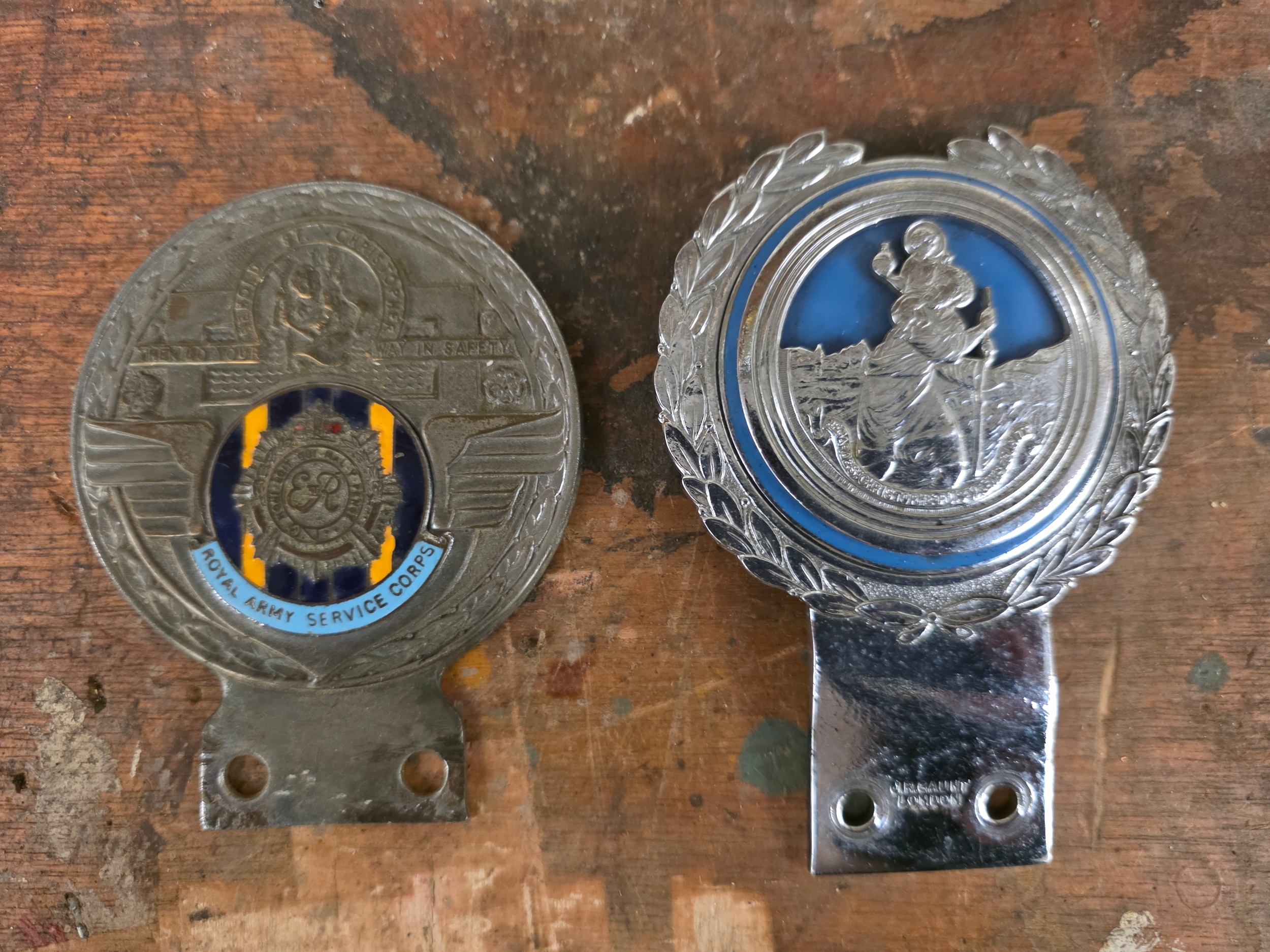 A Chrome and enamel St. Christopher car badge, by J.R. Gaunt, London and a Royal Army Service Corps badge (2).