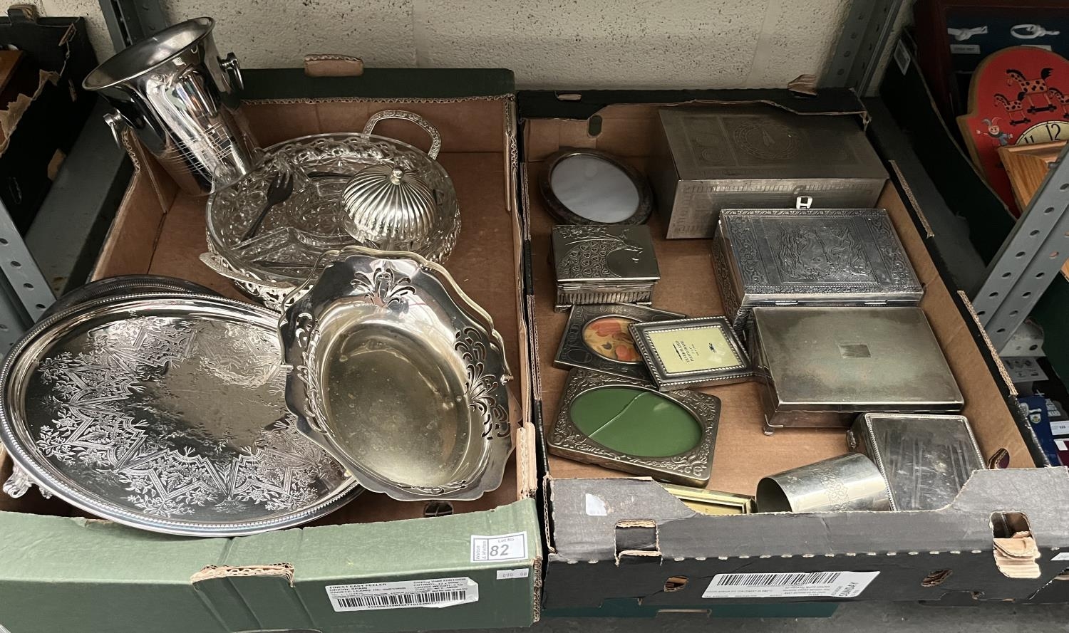 2 Boxes containing plated ware including jewellery boxes and serving trays