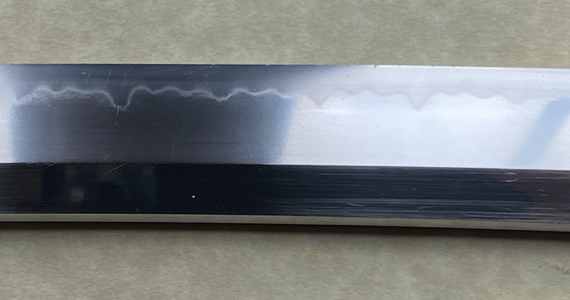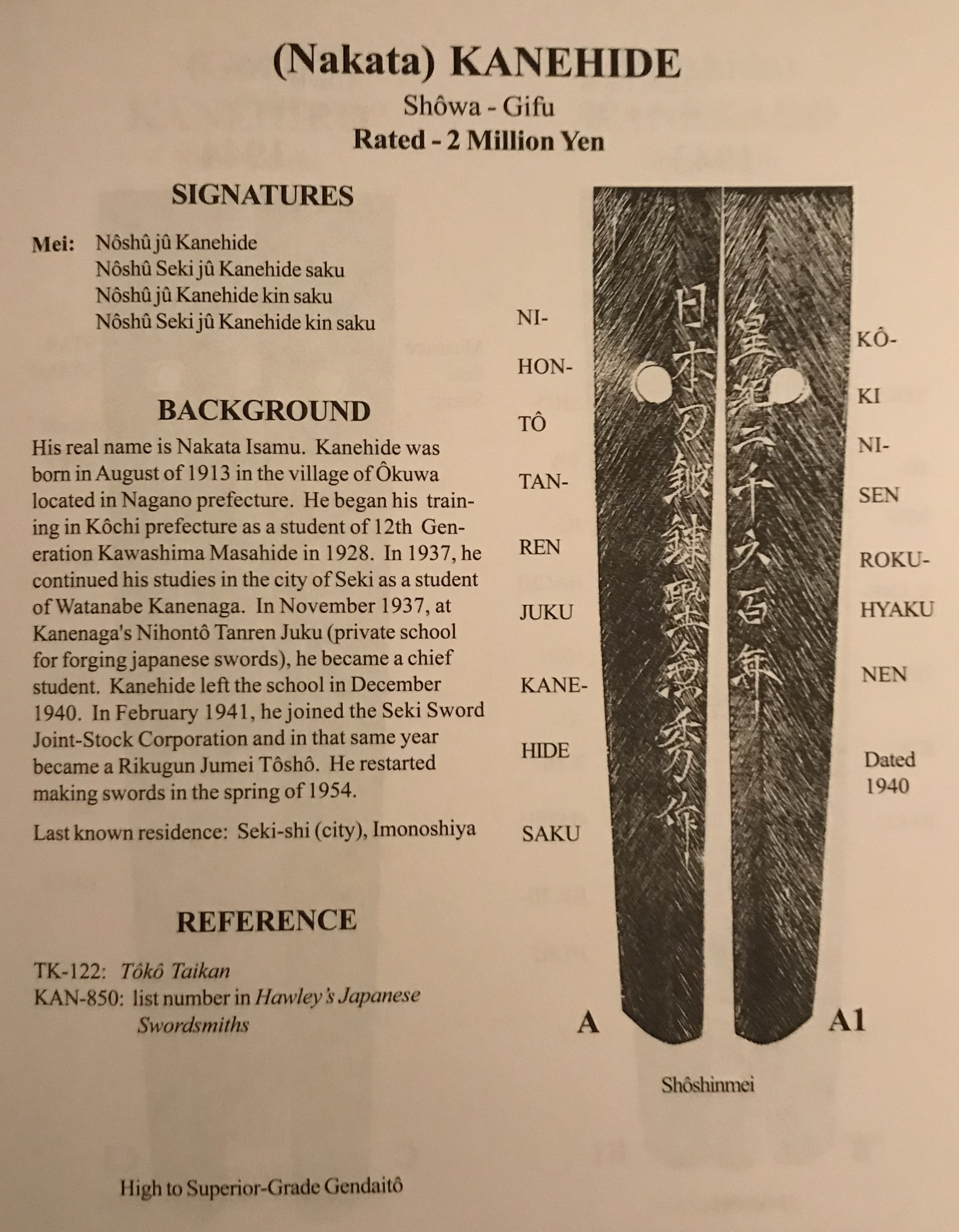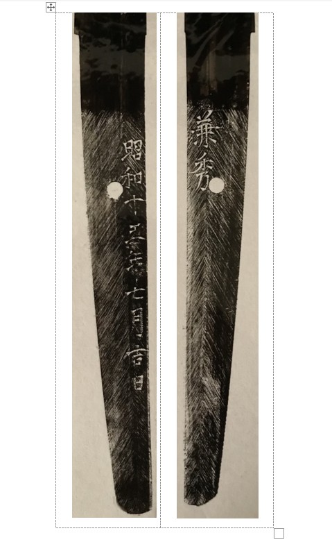 Showa ju-go nen shichi gatsu kichi nichi meaning “A lucky day in July 1940”. This means the blade was made while Kanehide was the chief student of Watanabe Kanenaga at the Nihonto Tanren Juku and so would be his best work. After the war, Kanehide went on to make Shinsakuto