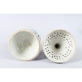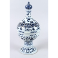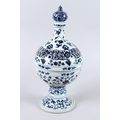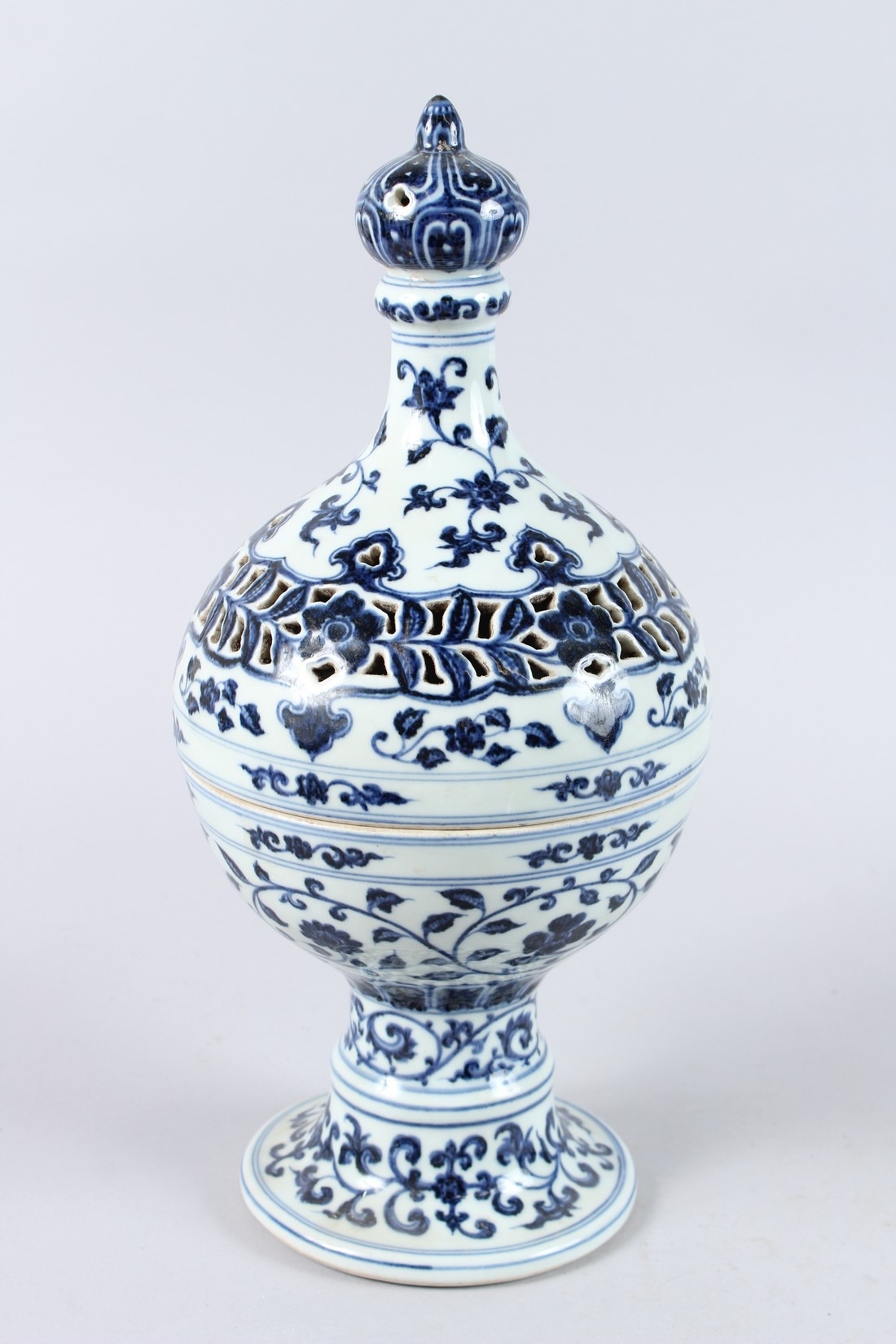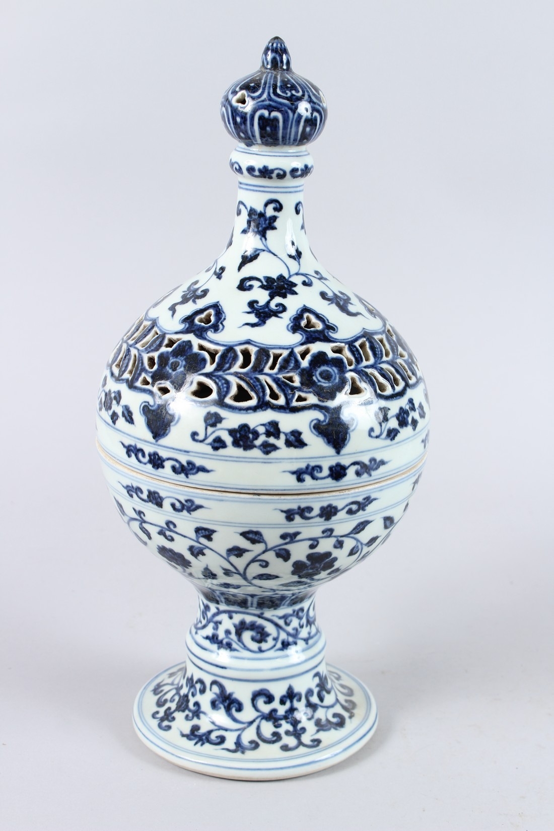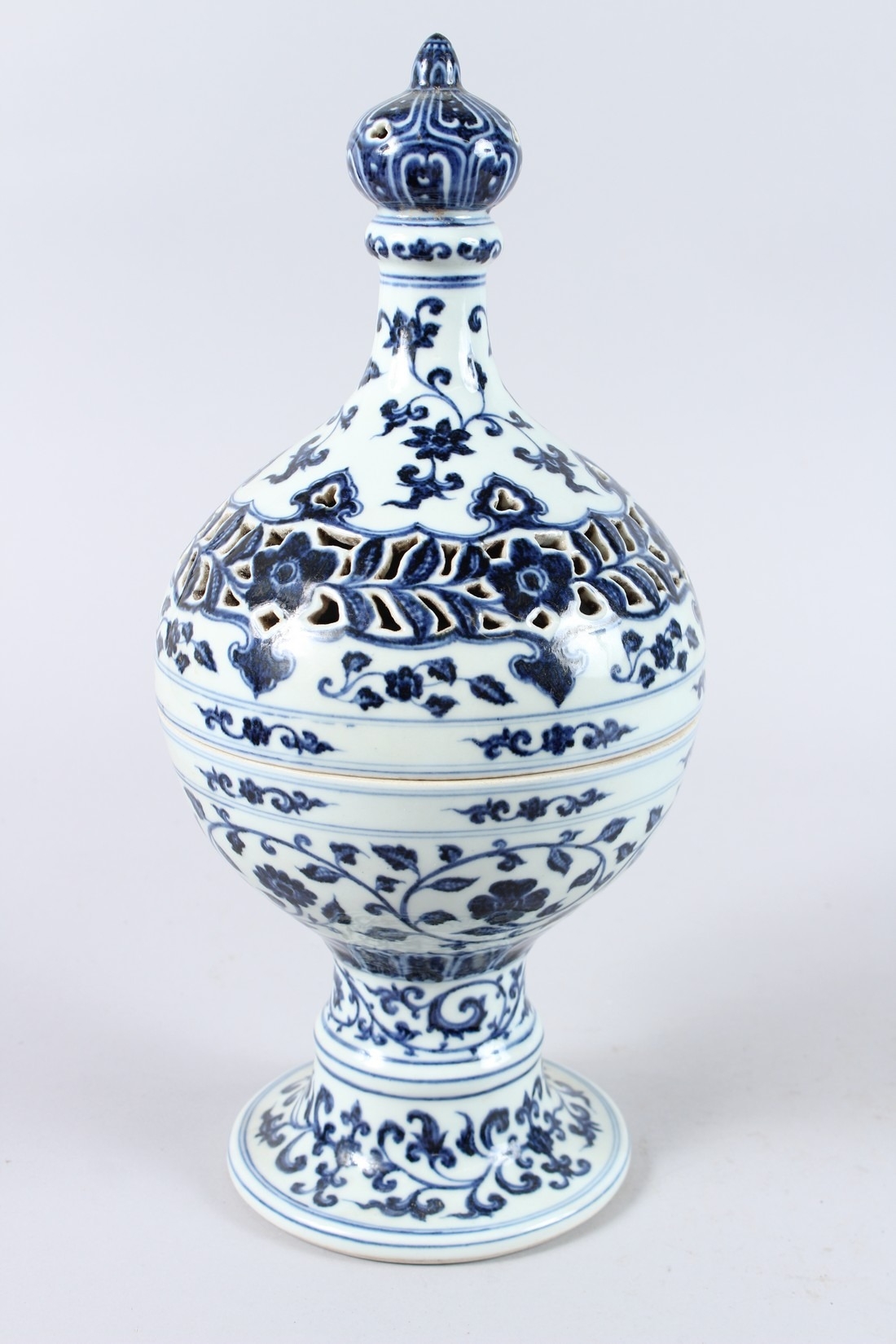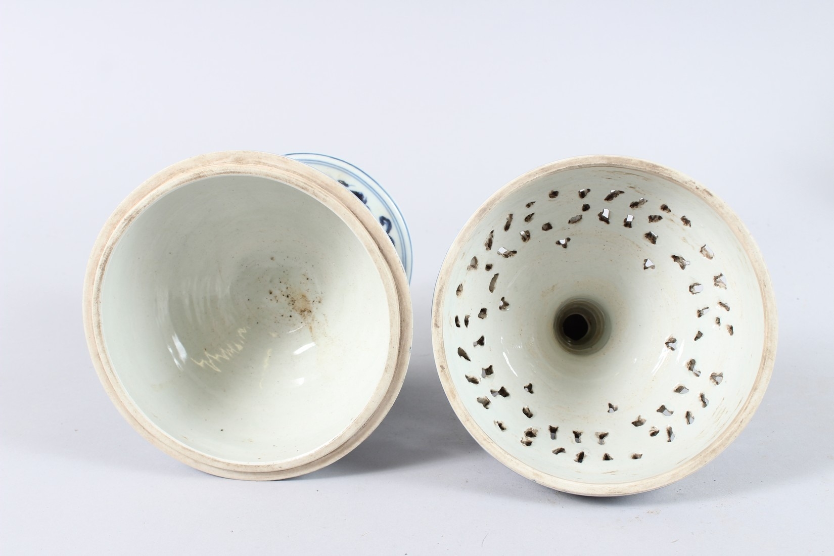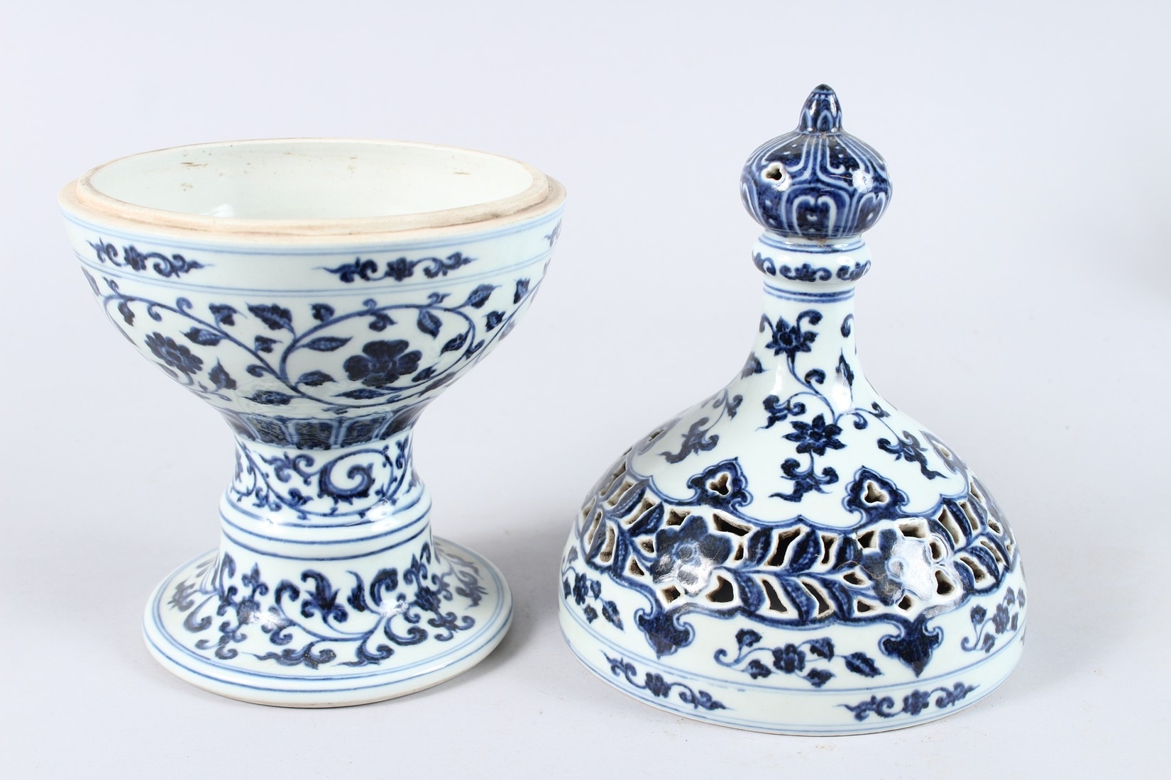 A CHINESE BLUE AND WHITE PORCELAIN PEDESTAL BOWL AND COVER, the cover with pierced decoration.