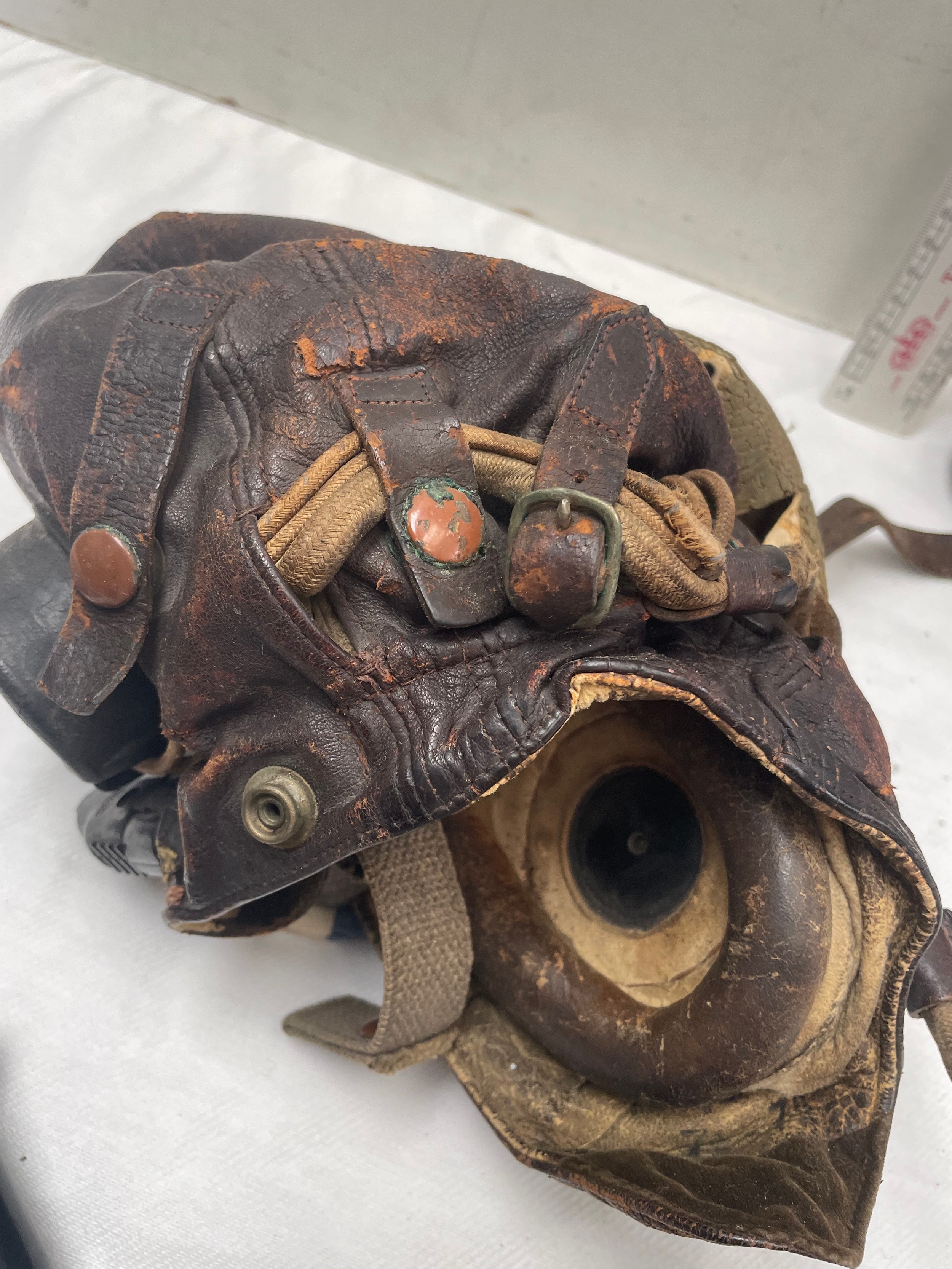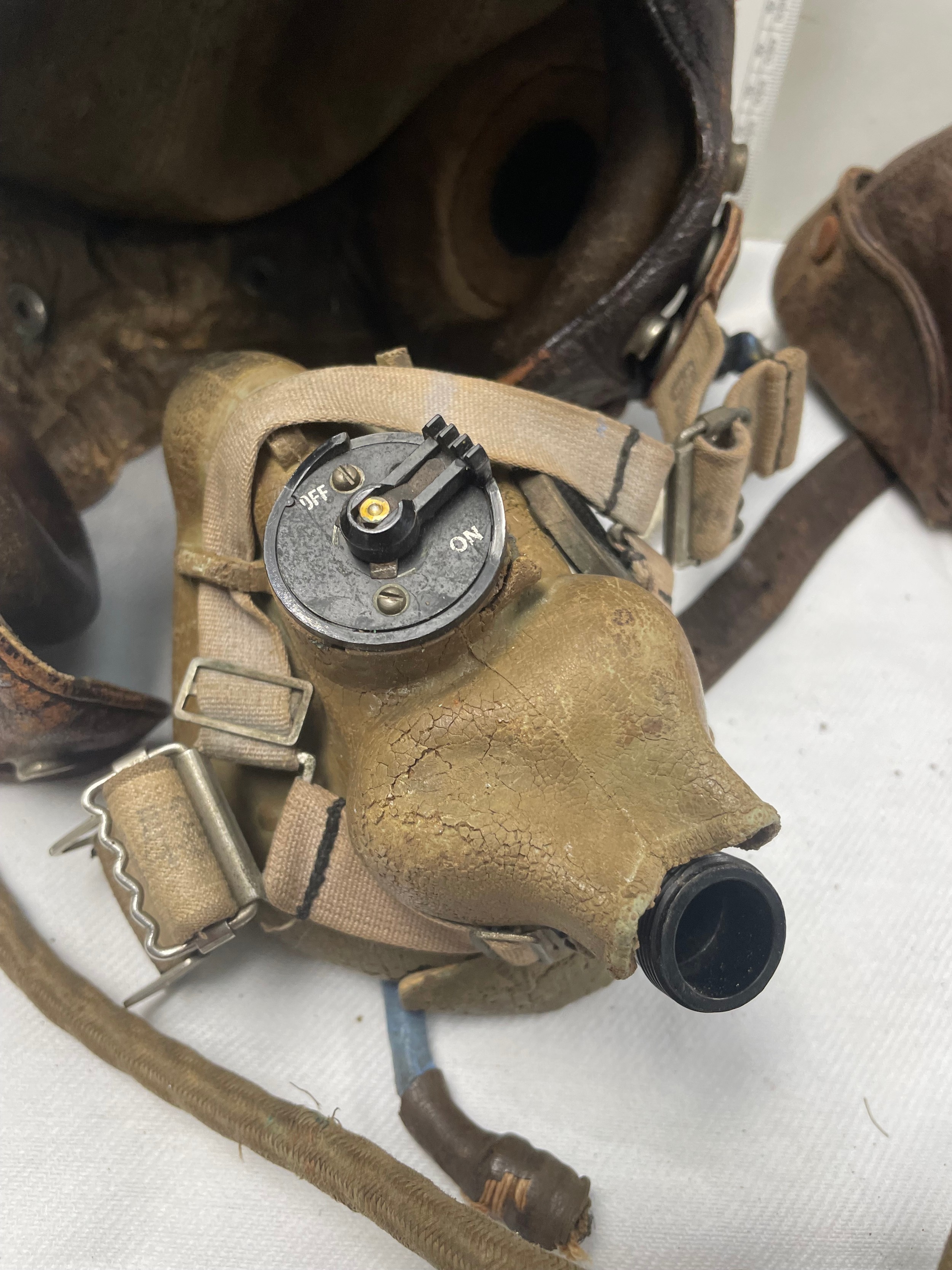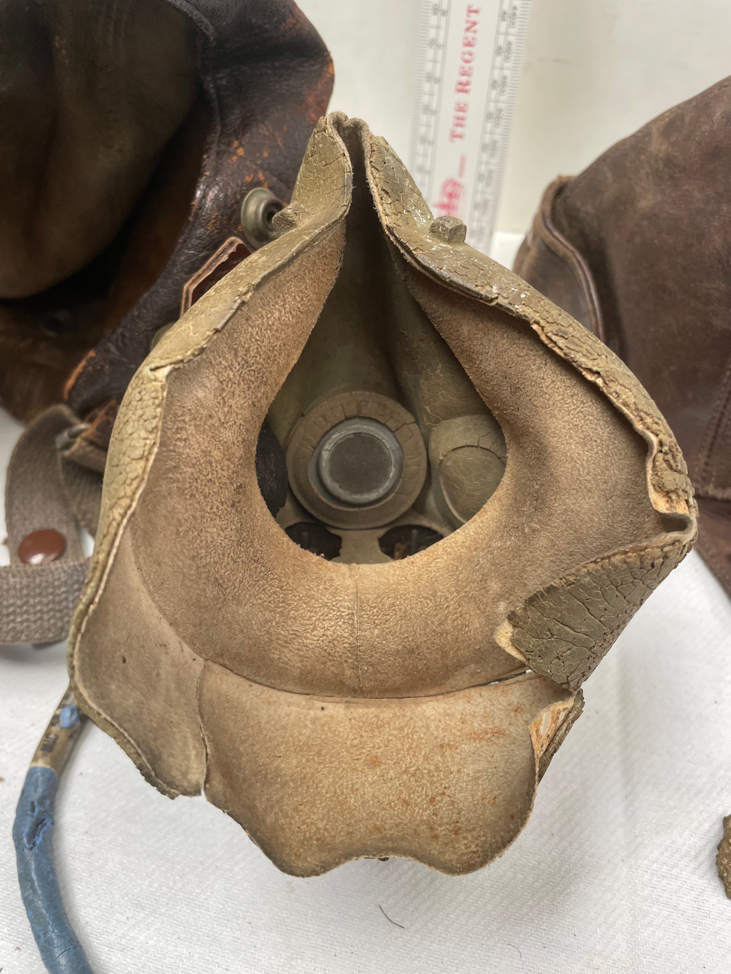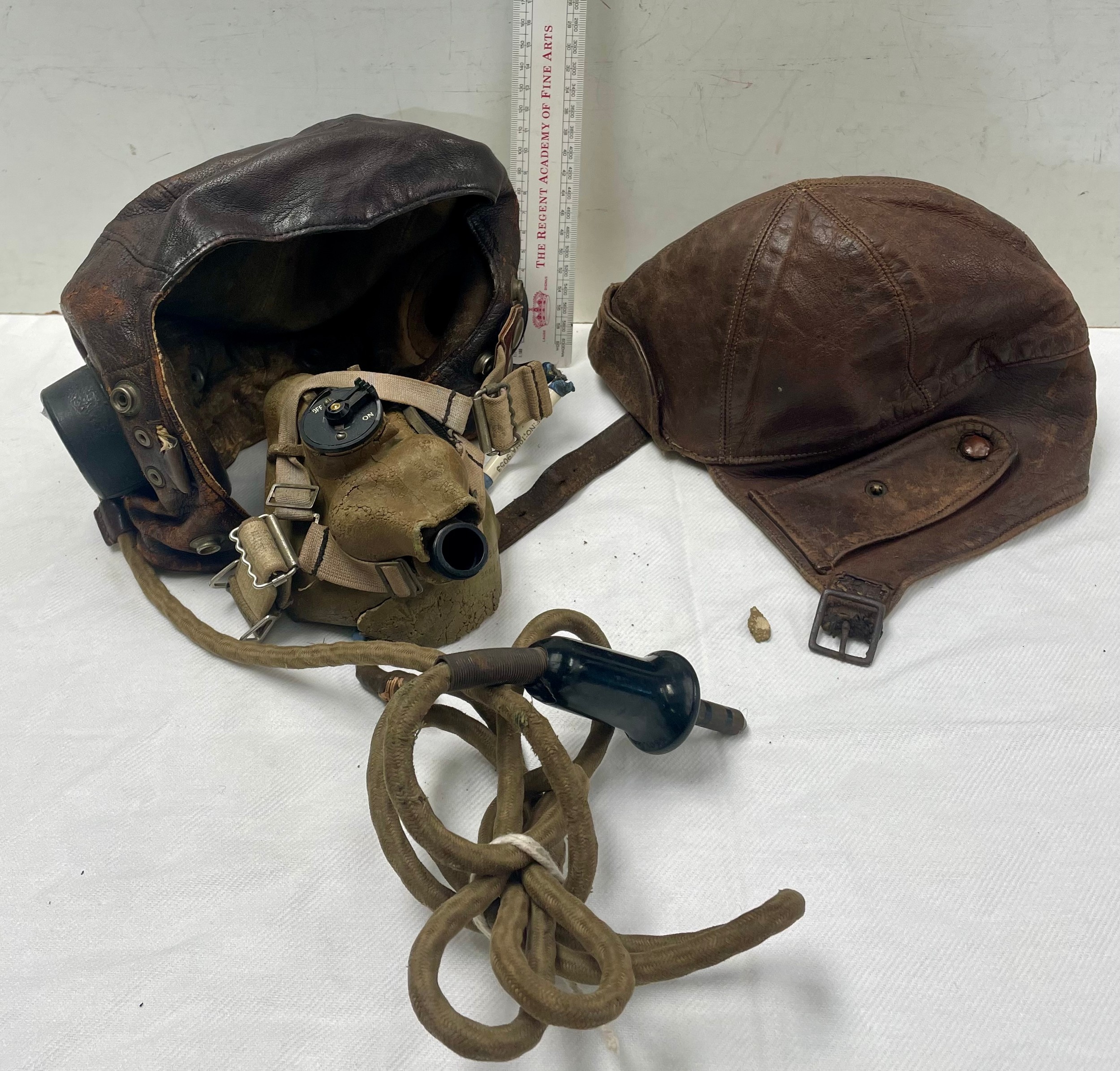 An RAF type C late pattern flying helmet together with a type H oxygen mask having Korean War-era issue marks and wiring loom; a pre-WW2 wool lined leather leather flying / driving helmet (2)
