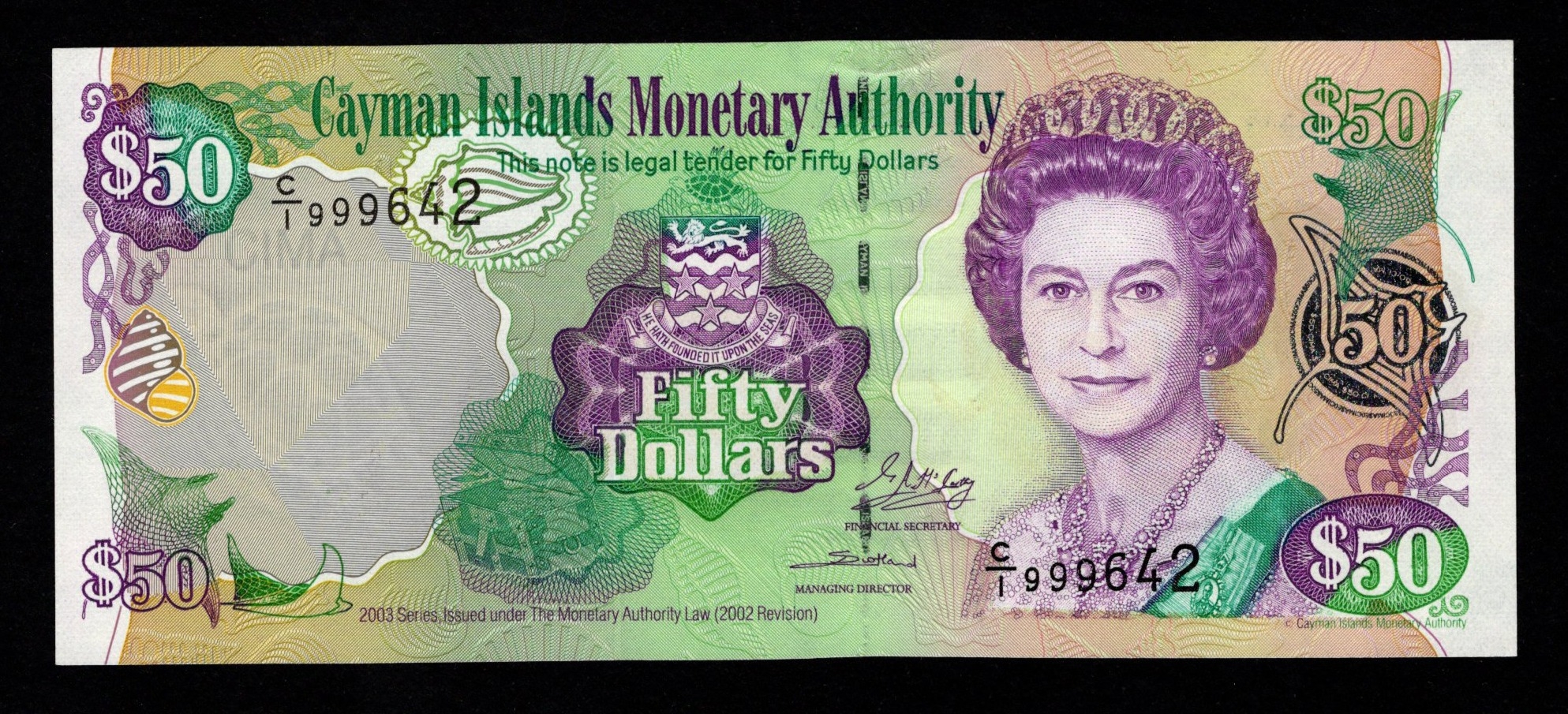 Cayman Islands 50 Dollars dated 2003, serial C/1 999642 (BNB B212a, Pick32a) Uncirculated