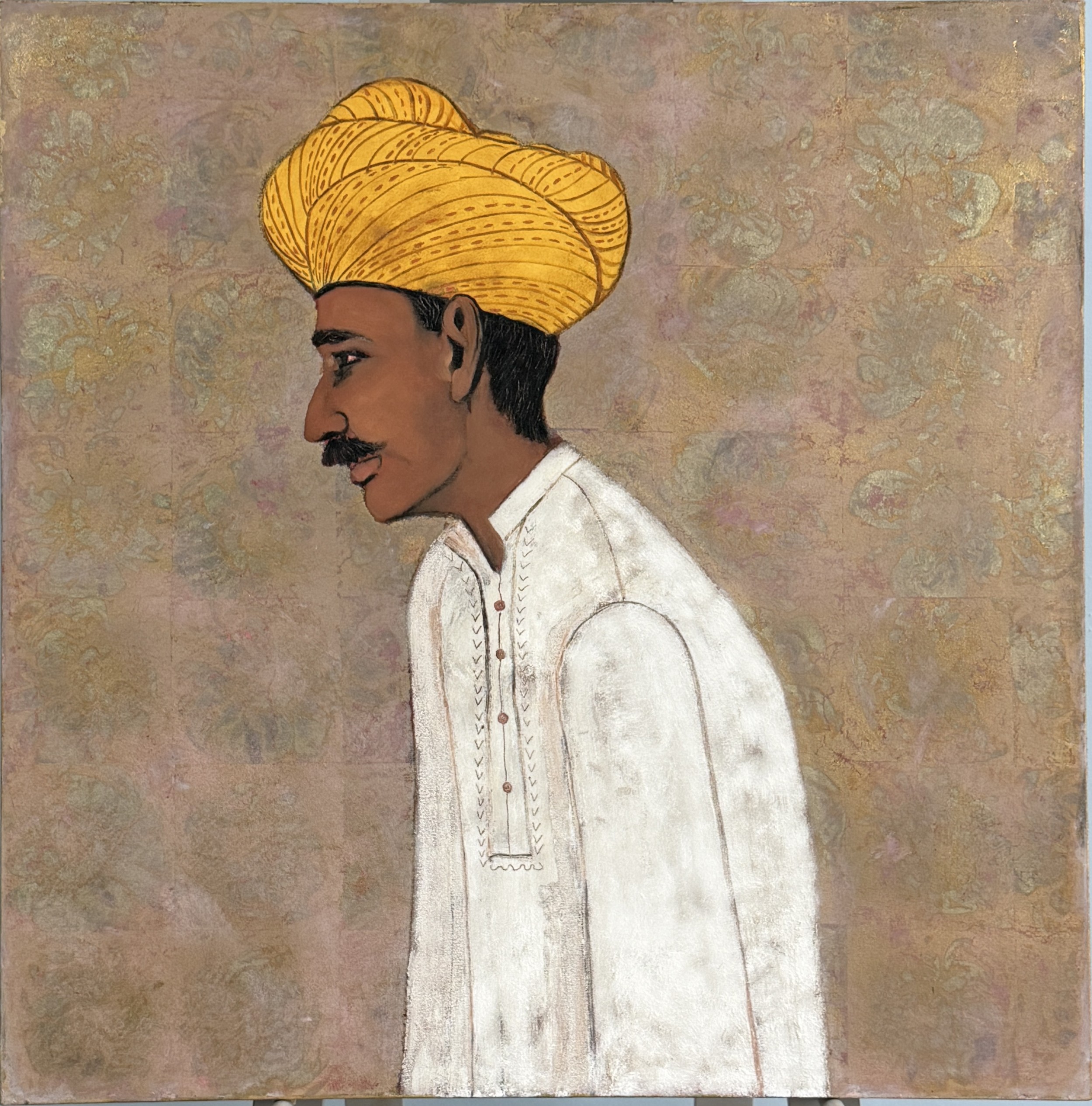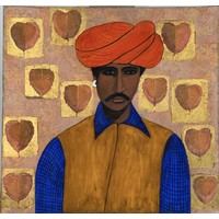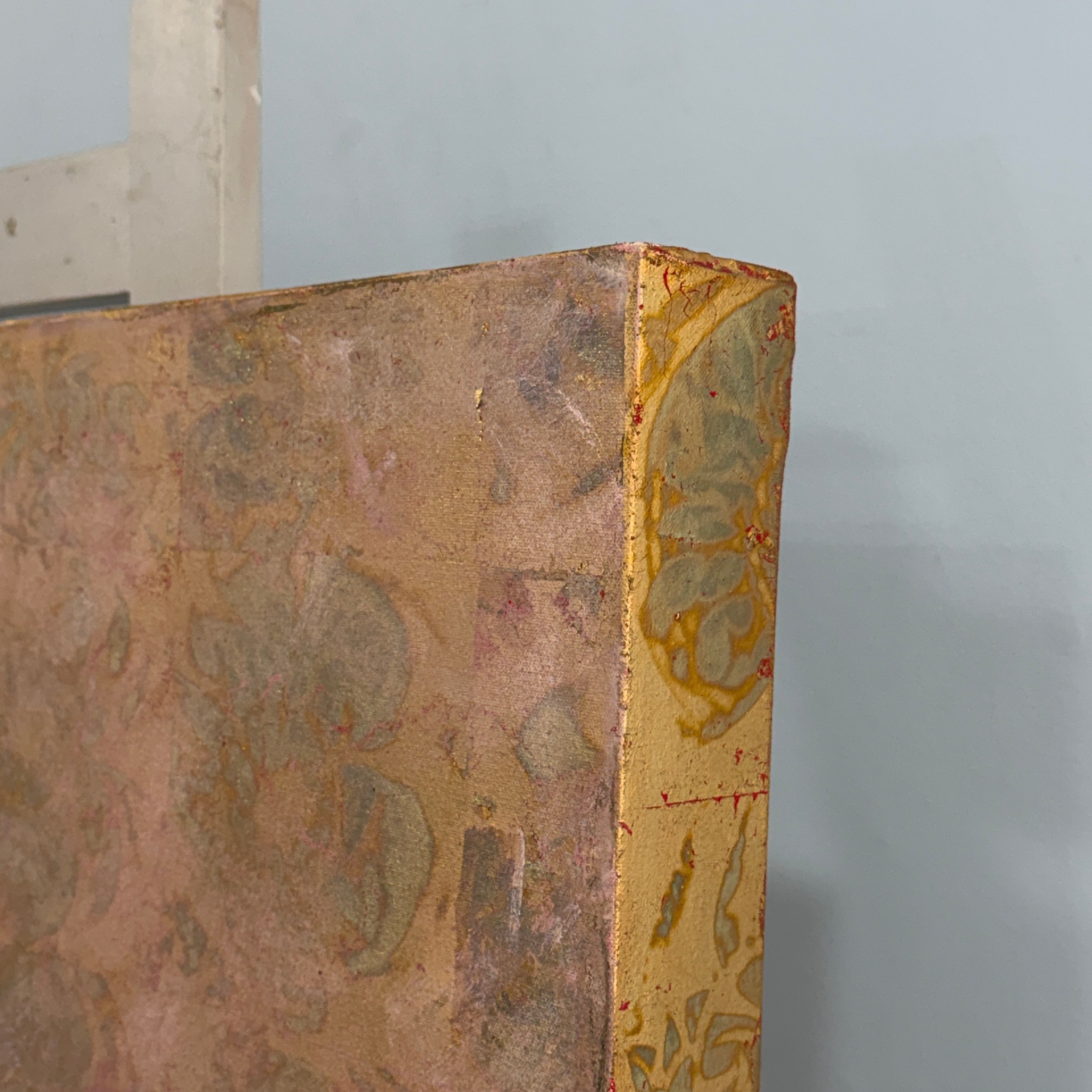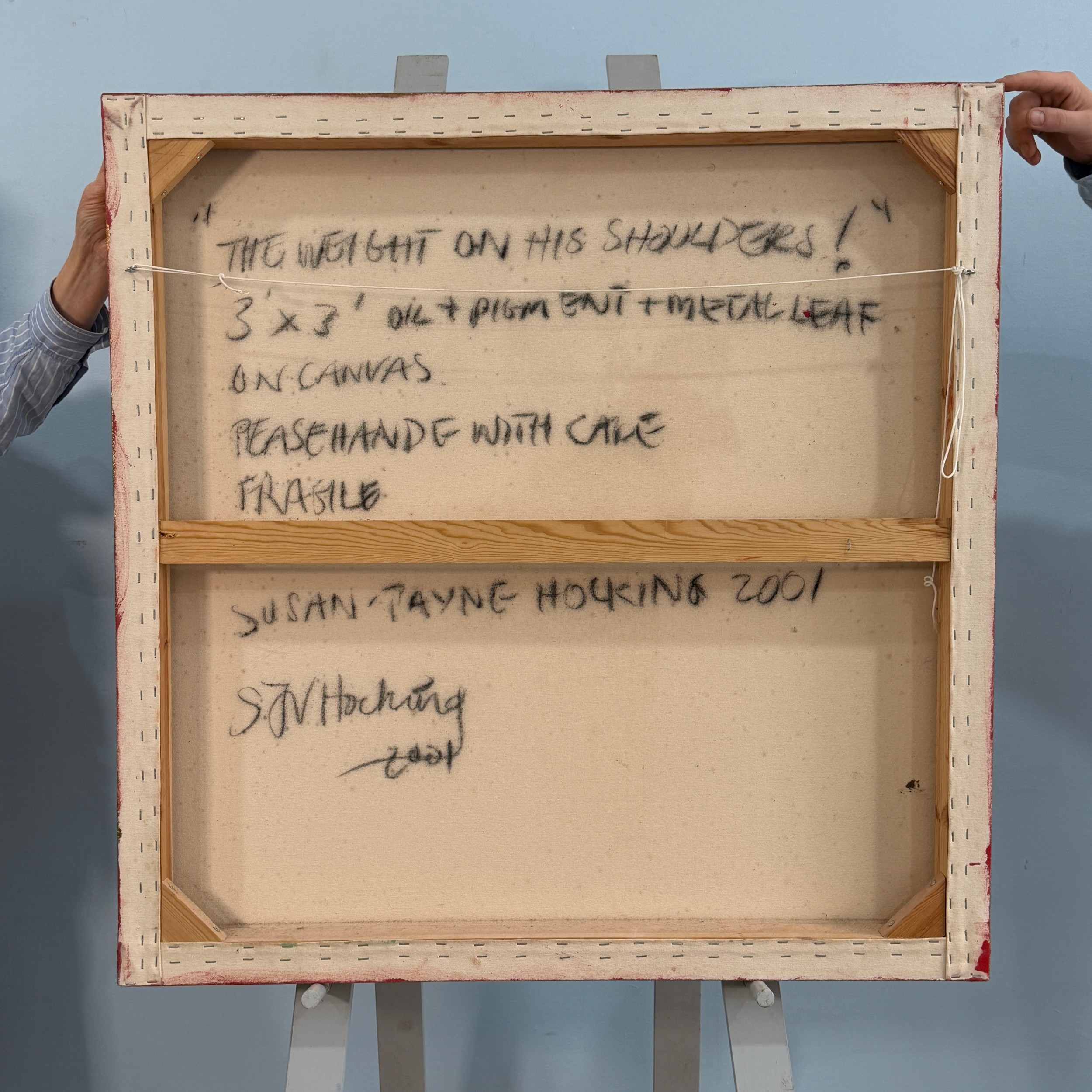 Susan Jayne Hocking (b.1962) "The Weight on his Shoulders", oil and pigment and metal leaf on canvas, signed and titled on the reverse, dated 2001, 91.5cm x 90cm, unframed.