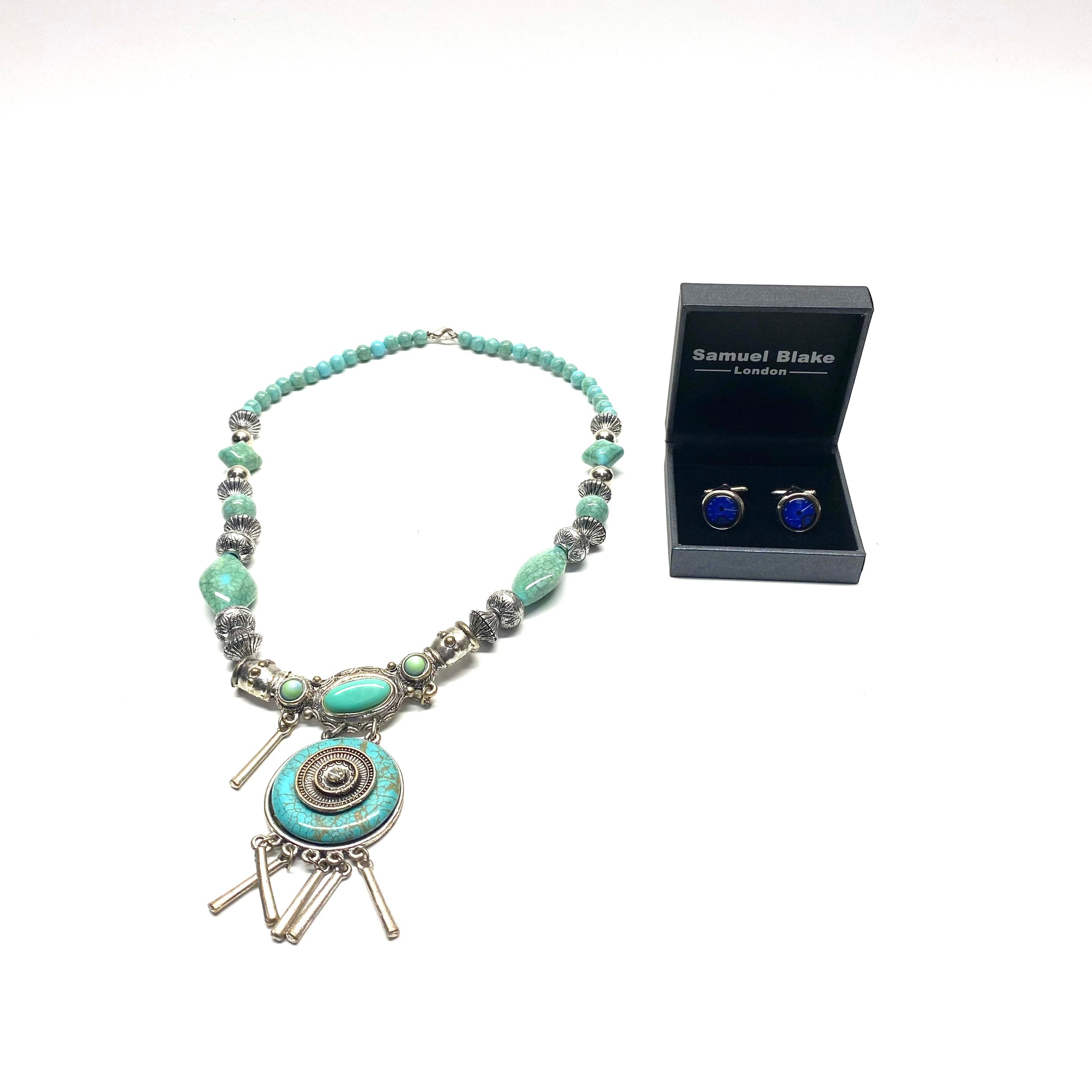 Turquoise bead necklace and a pair of boxed retail Samuel Blake cufflinks in the shape of a car Rev counter.